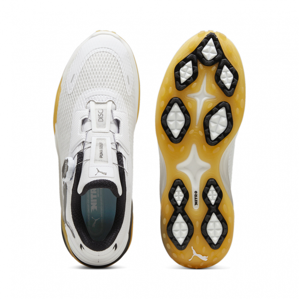 ◇ミッドフォーム全体にNITROフォームを搭載した新次元スパイクレスシューズ。CATEYEトラクションで様々なライでもしっかり捕まえられる新アウトソール構造。地面反力を効果的に利用し、飛距離アップが期待できる。PUMA独自のディスククロージャーシステムにより容易に脱着が可能
