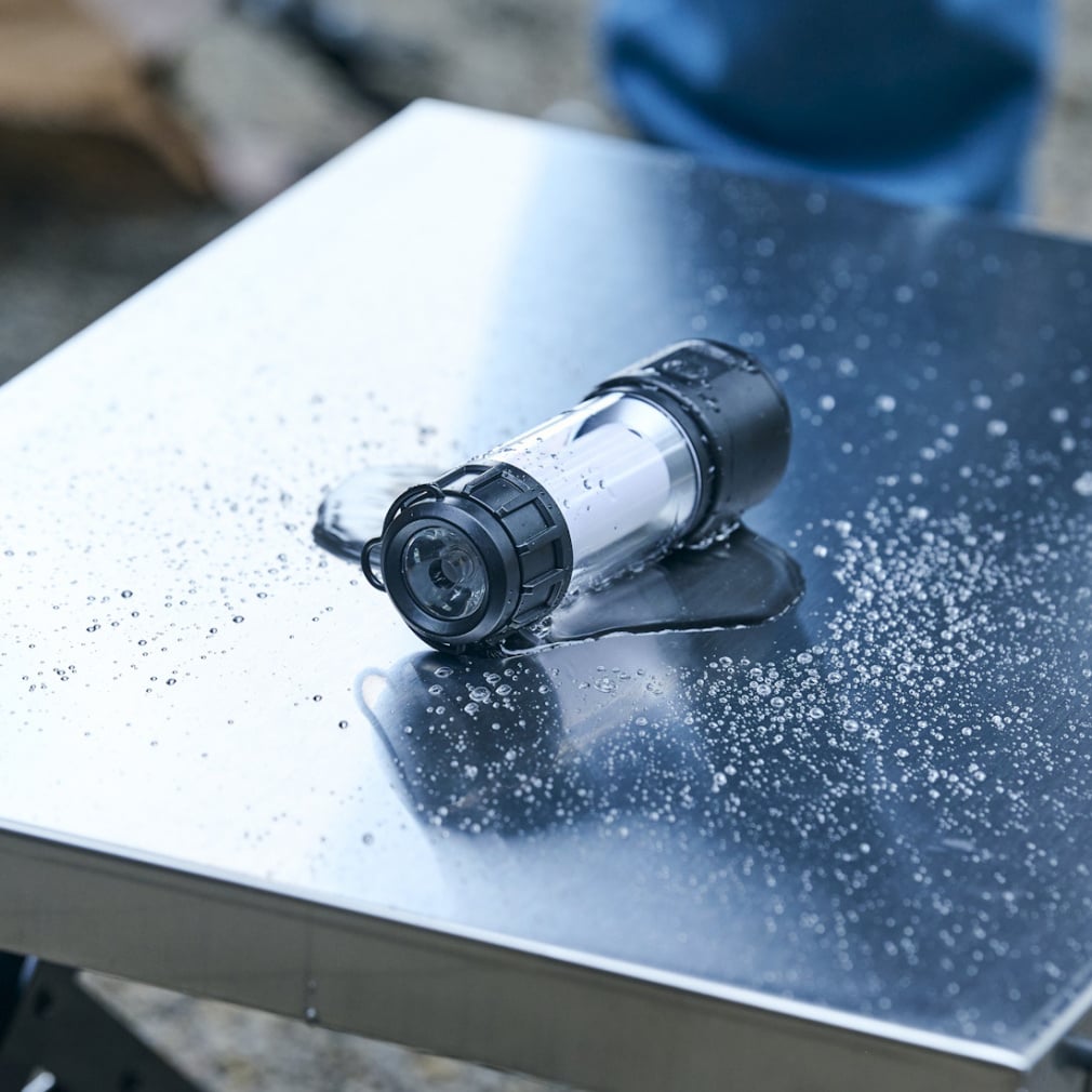 ◇専用スタンドが付属し、暗くなりがちなキャンプの卓上全体を明るく照らす卓上灯だけでなく、スタンドを外しタープに吊り下げればダイニングライトにも、夜間の散歩ではシェードを外してトップライトを点灯すれば夜道を照らす懐中電灯にも、色々使える3WAY設計