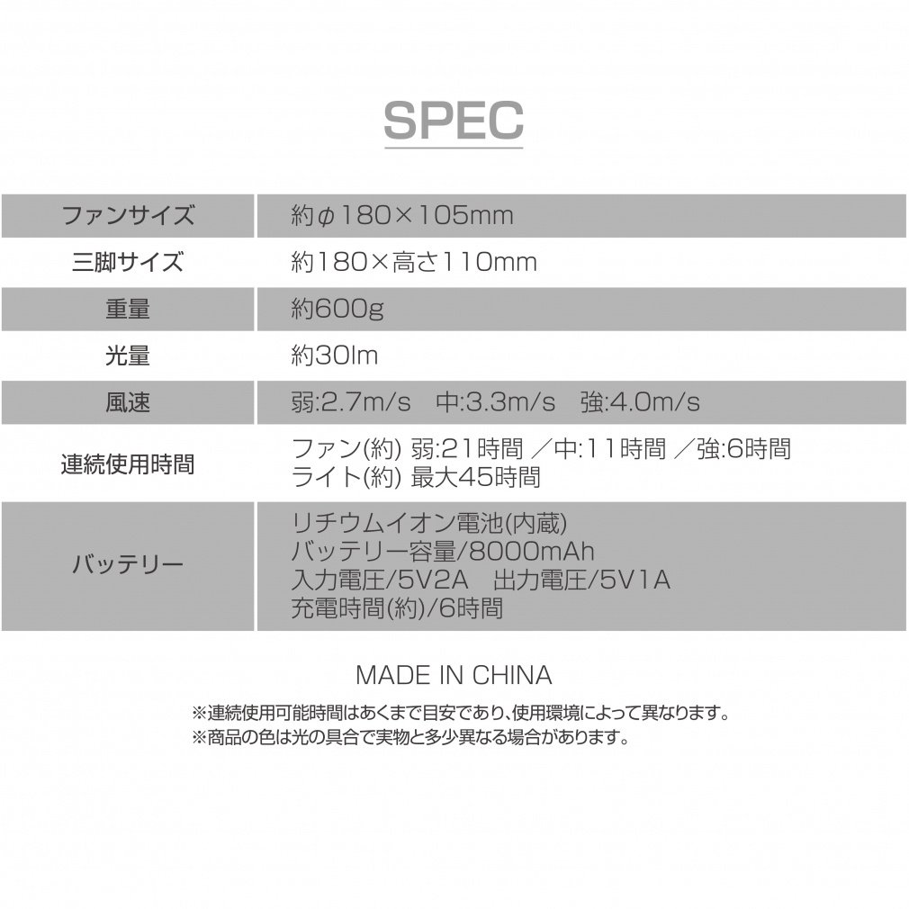 ◇3段階の風量設定。弱:21時間、中:11時間、強:6時間、ライト機能:45時間