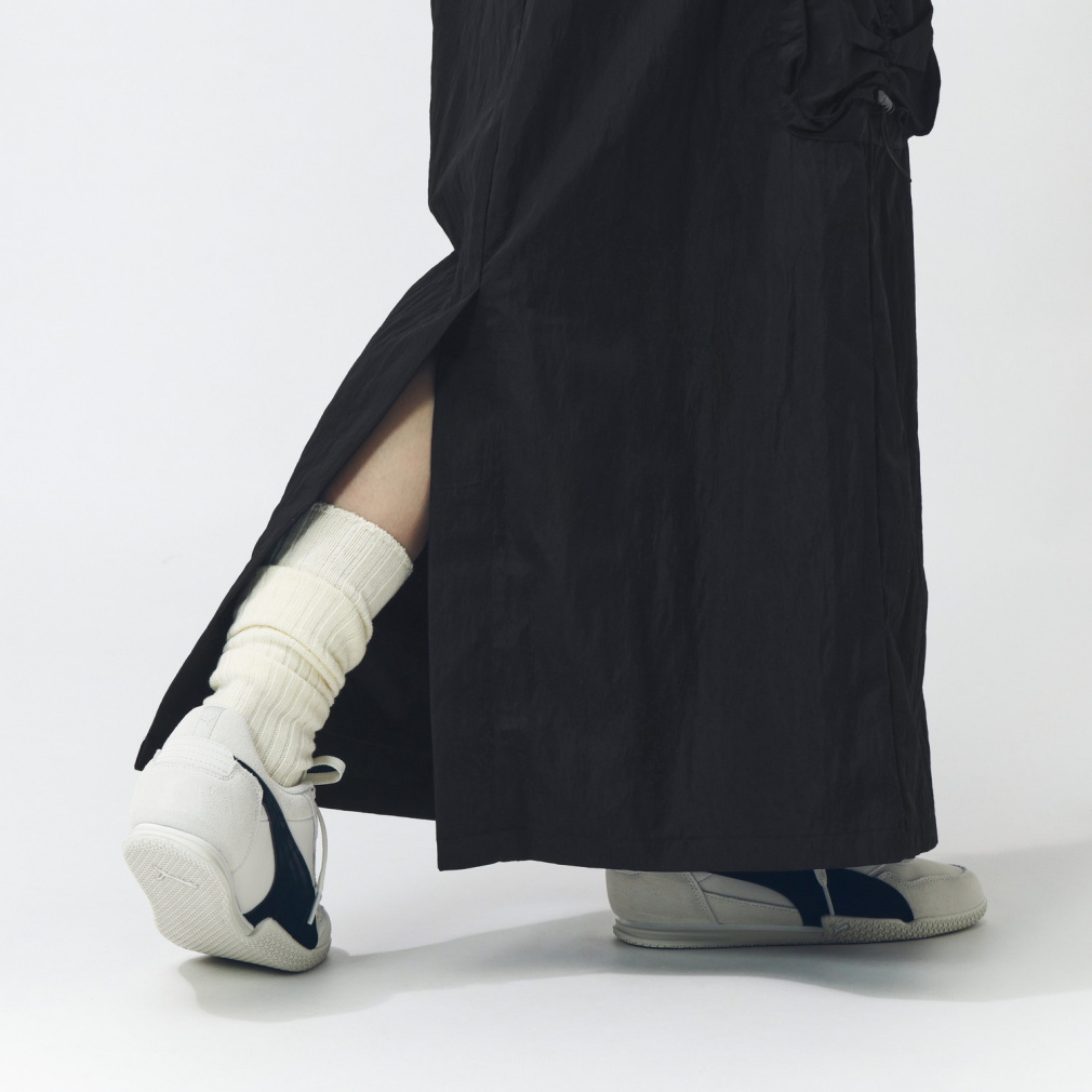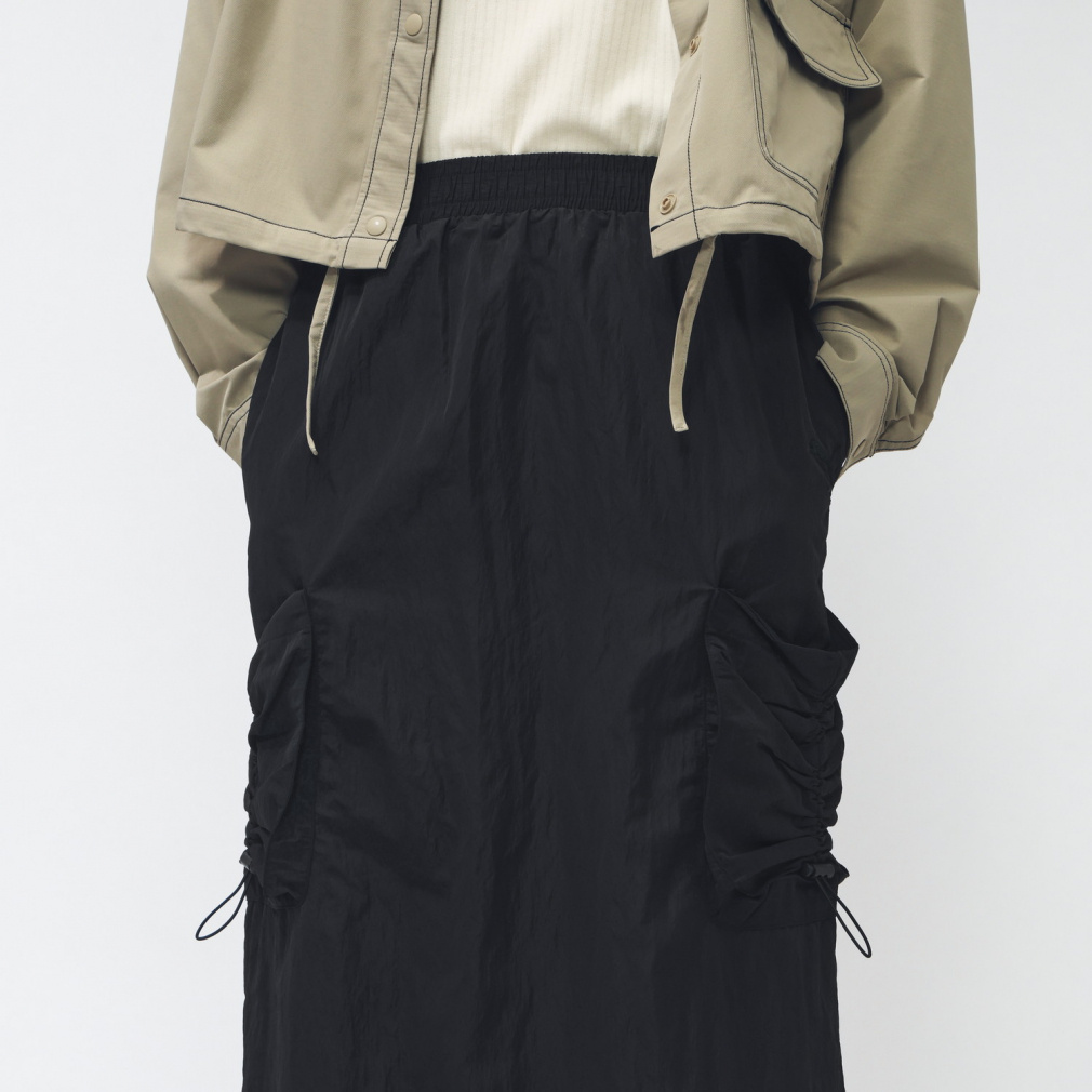 AUTUMNコレクションから、ナイロンのウーブン素材を使用したロングスカート。