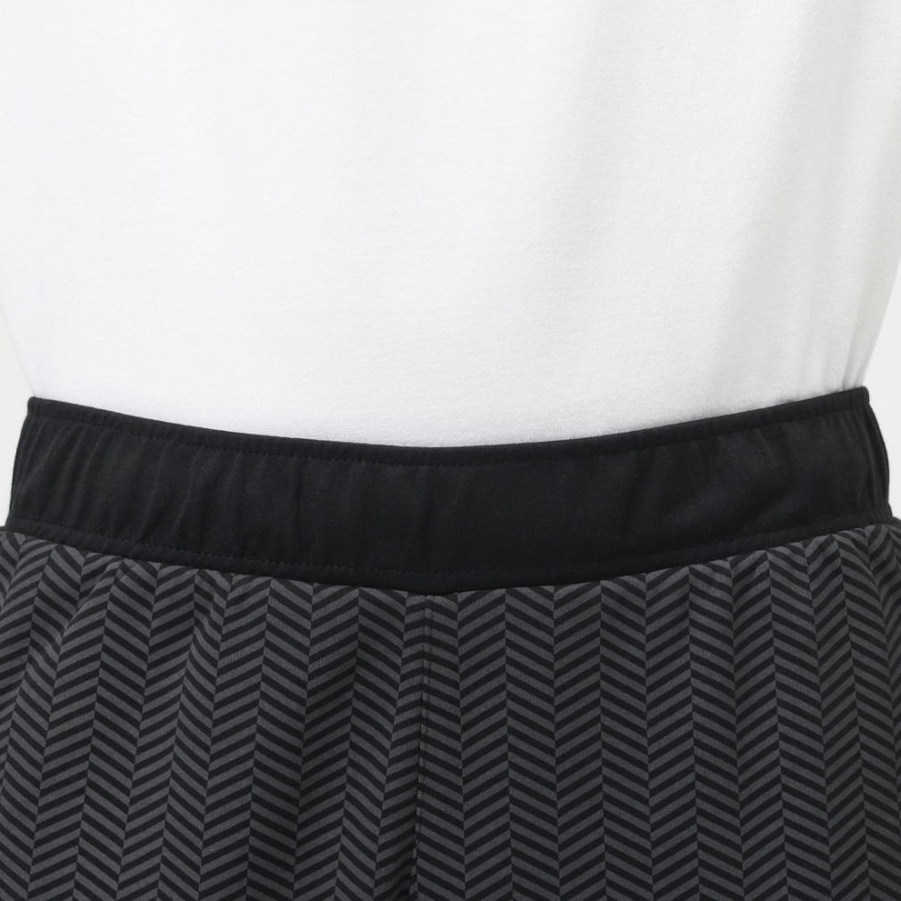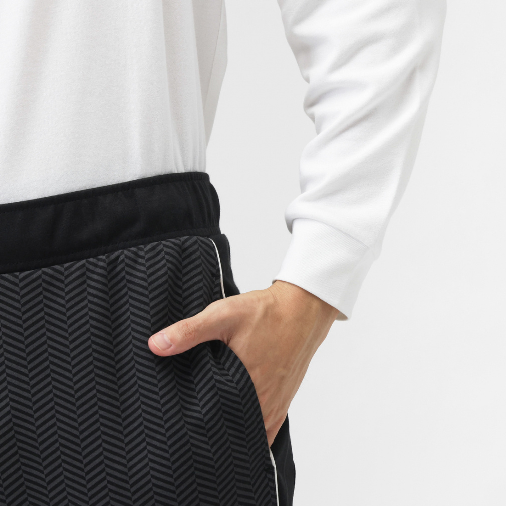 トレンドのヘリンボーン柄をオリジナルのオールオーバープリントにし、ソリッドの生地を組み合わせたリラックスフィットのパンツで、パイピングを施したカーブラインがアクセント。