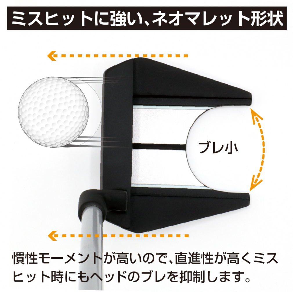 ◇ミスヒットに強いヘッド形状大型マレットで直進性が高く、オフセンターヒット時のヘッドのブレを抑制します。
