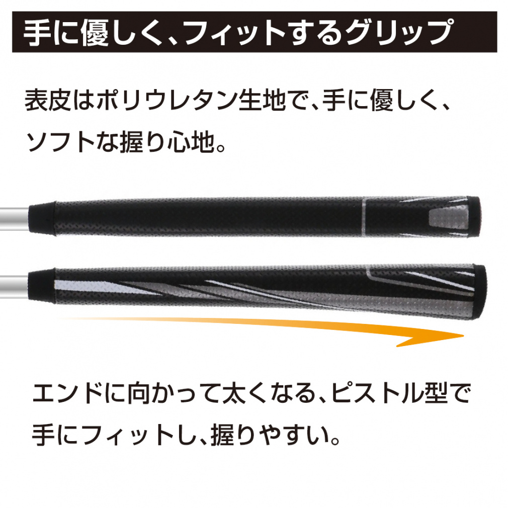 ◇手に優しく、フィットするグリップエンドに向かって太くなる、ピストル型で手にフィットし、握りやすい。表皮はポリウレタン生地で、手に優しく、ソフトな握り心地。