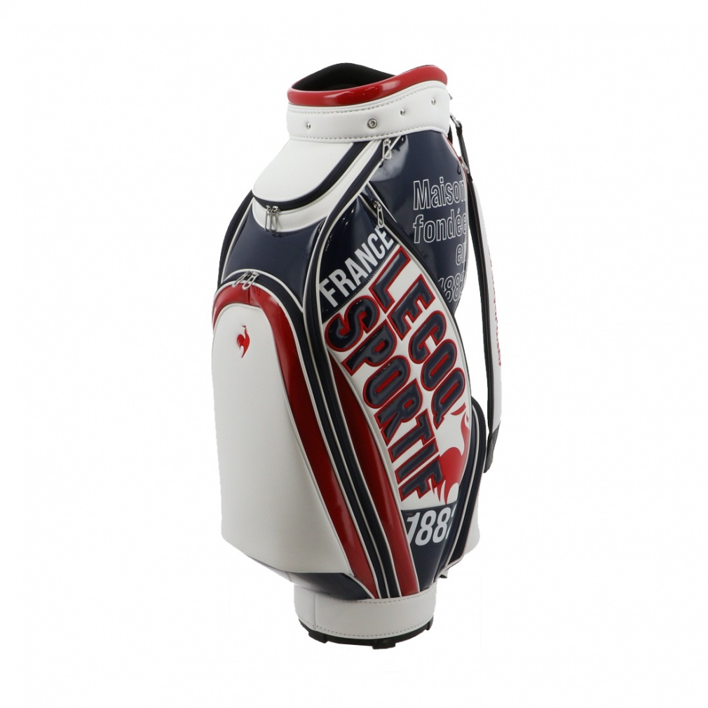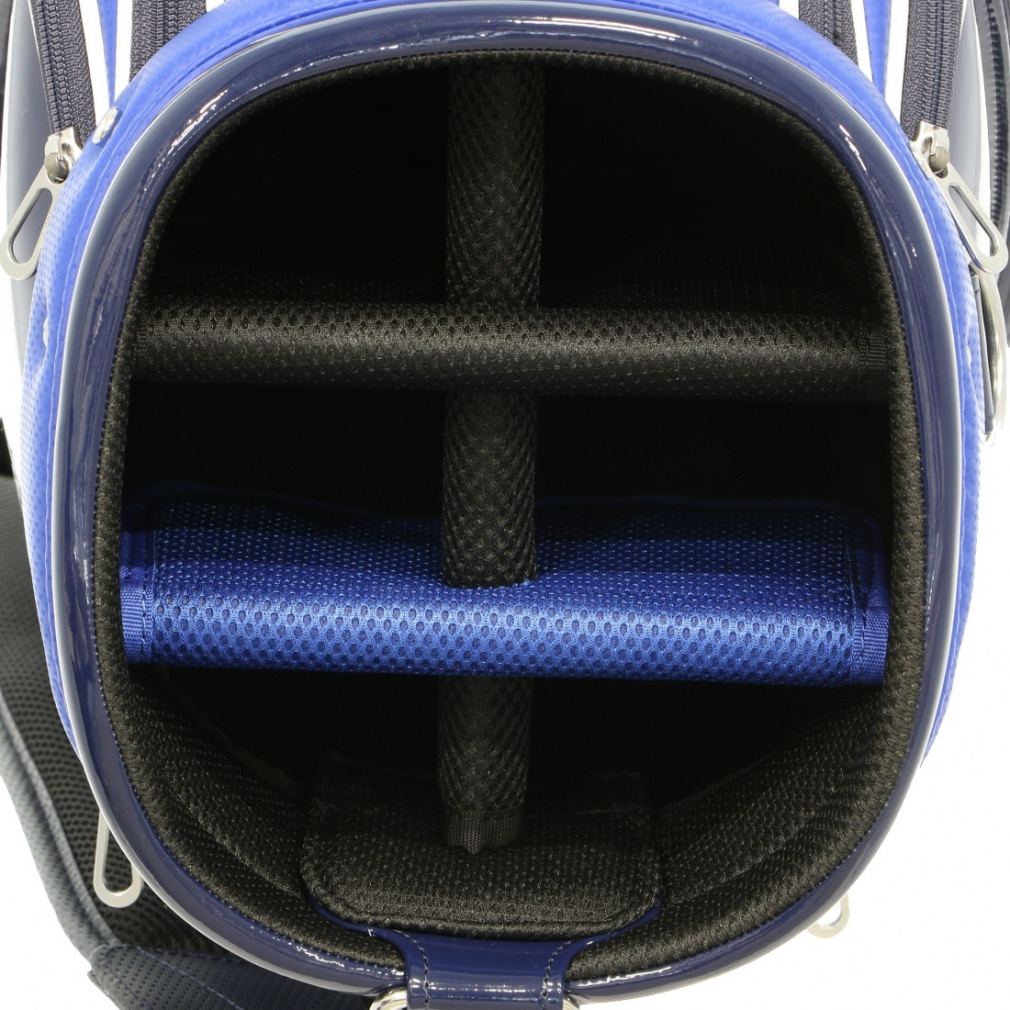◇大胆なグラフィックロゴとカラーリングが印象的な大口径キャディバッグ。随所にあしらった刺繍や重厚な合成皮革とエナメルの掛け合わせにより、スポーティかつ高級感を演出。幅広いニーズに応えるオーソドックスモデル。 ※ネームプレート付属無し