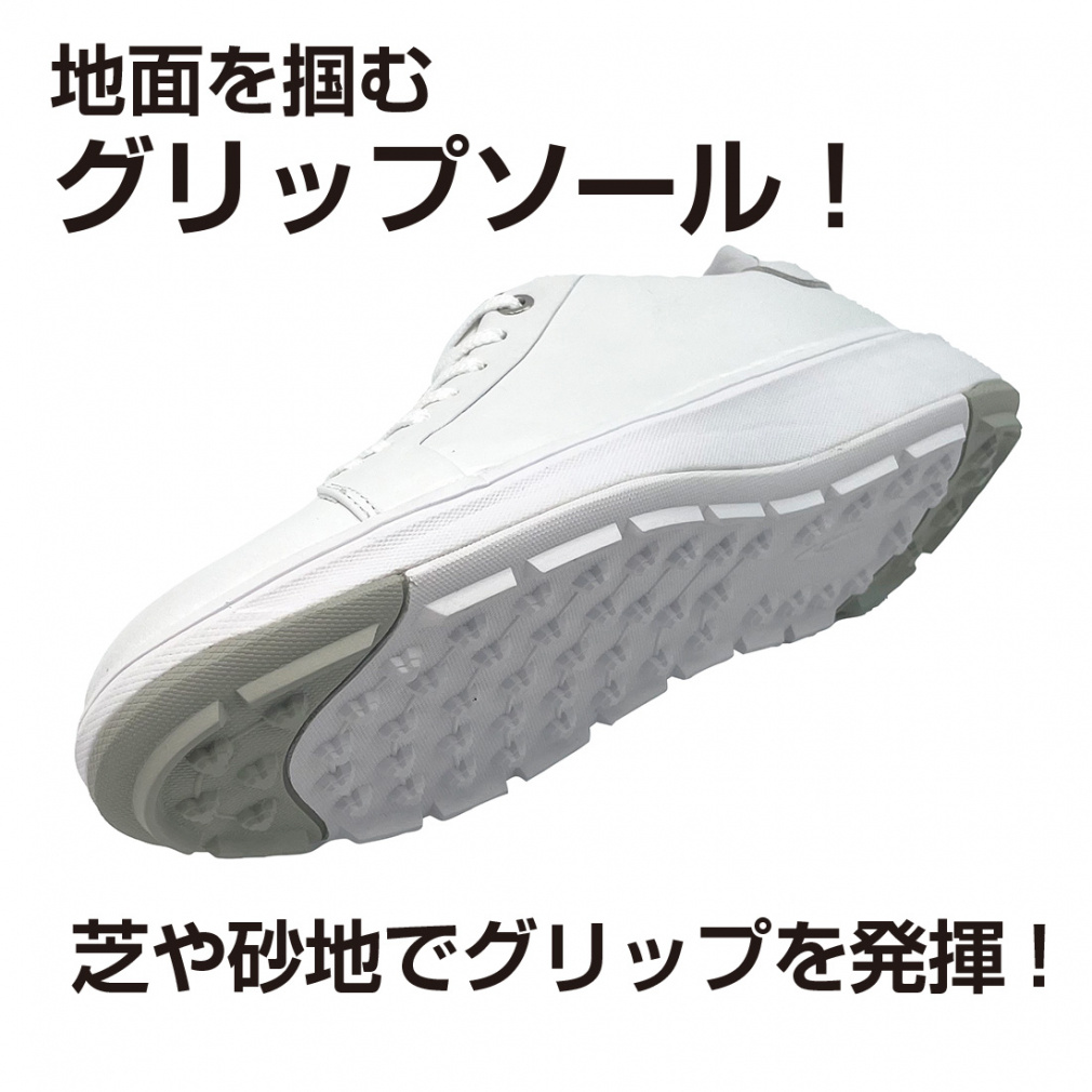 ◇本革を使用したゴルフシューズ。多くのシーンで使用できるデザイン性と機能性。足になじむ柔らかい本革で快適な履き心地。安心してプレーが出来るラバーグリップソール。