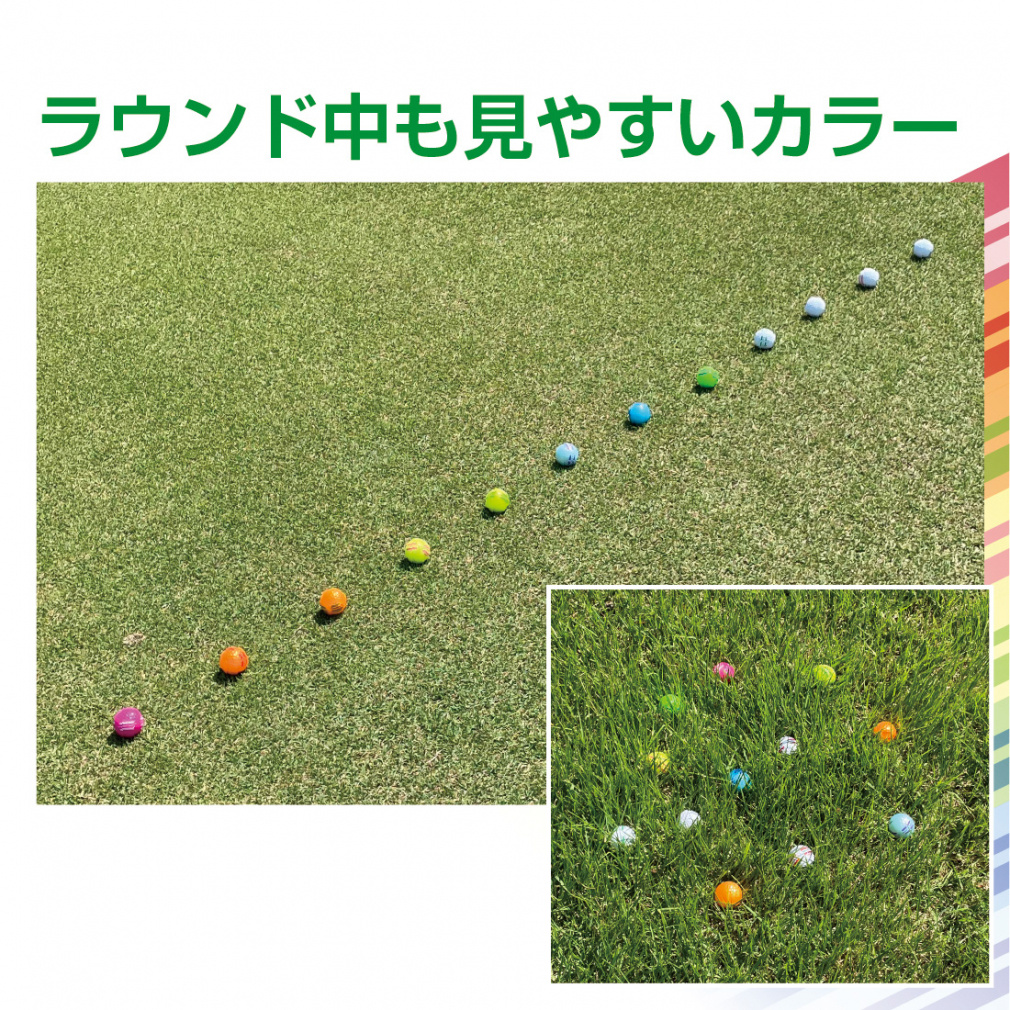 ◇飛ぶ!カップへ導くライン 12色が1ダースになったレインボーパック!数量限定で登場。全12カラーを一度に試すことができます。レインボーパック専用パッケージでコンペギフトとしても◎。12色展開でいつものゴルフに選べる楽しさを!ラウンド中も見やすいカラーを採用しています。パッティング時のボールの軌道が確認しやすい4面アライメントを採用。ドライバーの飛距離性能に特化し、導き出された渾身の1球。高弾道・ロースピン性能で大きな飛距離を実現しています。コア、カバー厚、デインプル設計、あらゆる組み合わせを徹底検証。高反発リミットコア ルールギリギリの反発性能を実現。初速アップに貢献します。コントロール・サーリンカバー 厚みと硬さの組み合わせをコアに合わせて最適化。スピン量を低くコントロールし、吹け上がらず、伸びのある弾道を実現します。322ディンプル 精密に配置されたディンプルが、空気の流れをコントロール。ボールの安定した飛行を実現します。