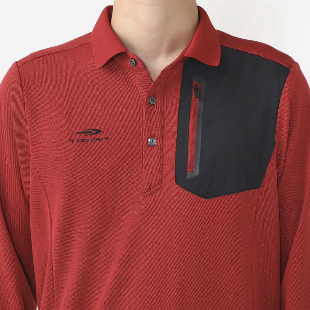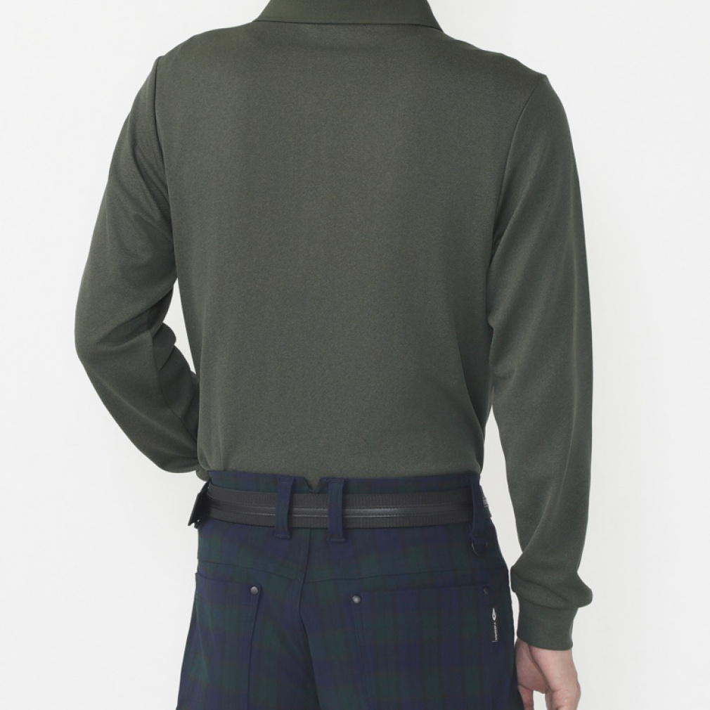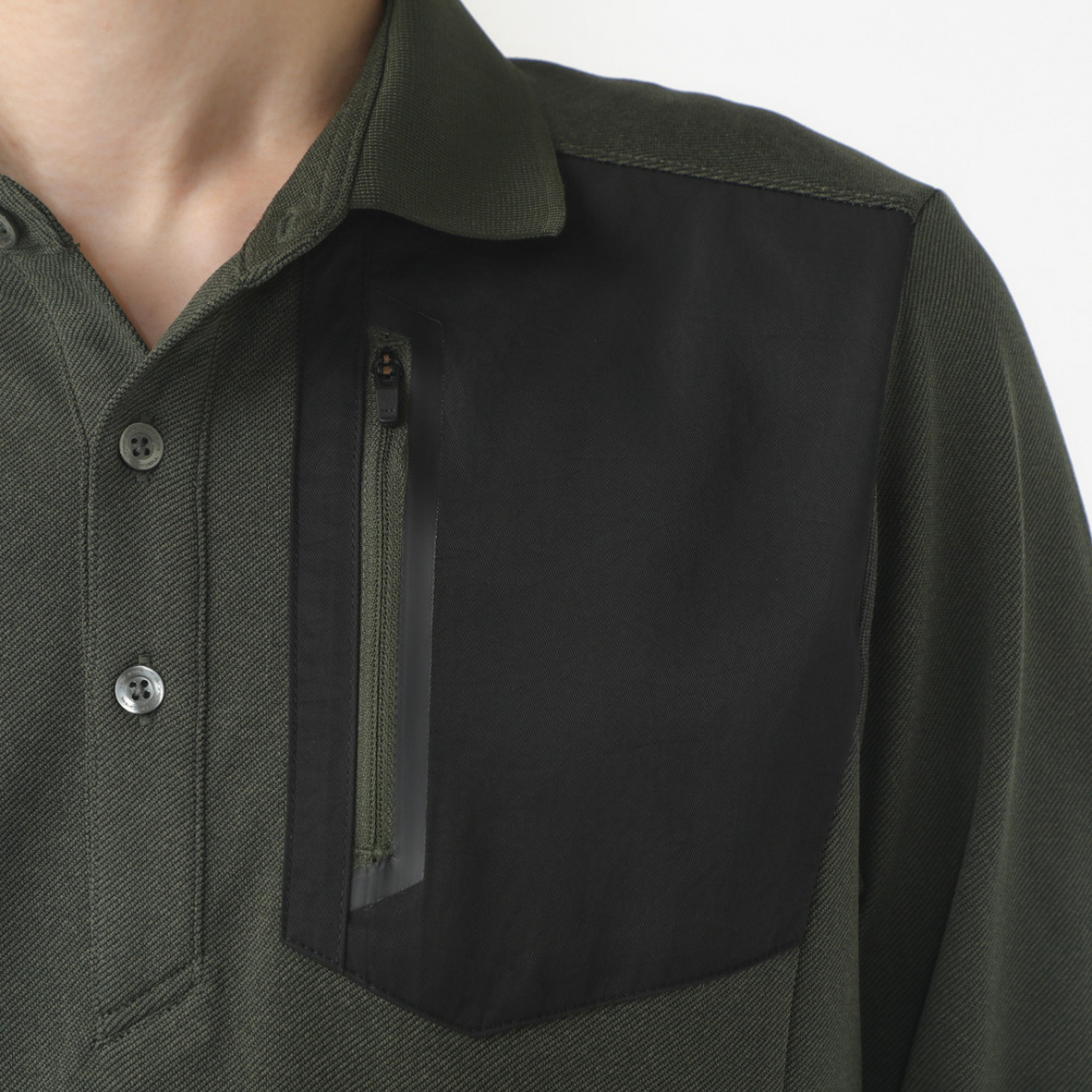 ◇ファスナー付きの胸ポケットが特徴の1枚。ポケット部分は布帛を使用し、身生地とは異なる表情がアクセント。ポロ衿仕様でスポーティーな印象も演出。衿周りはアドレス時に顎を引いても当たりにくい寸法設定をしており、プレー時のストレス解消に拘った設計。生地には光吸収発熱機能が付加されており、外部の光を吸収し熱に変換することで暖かくなります。