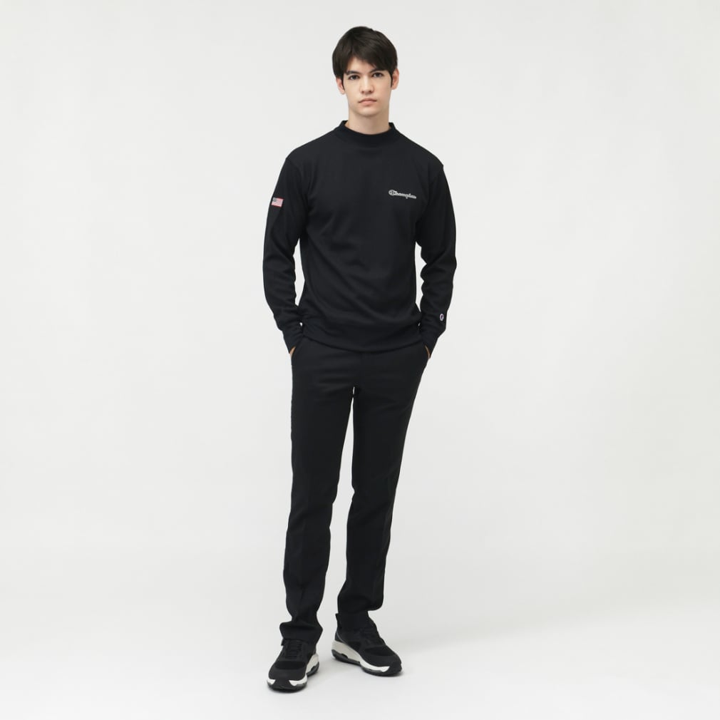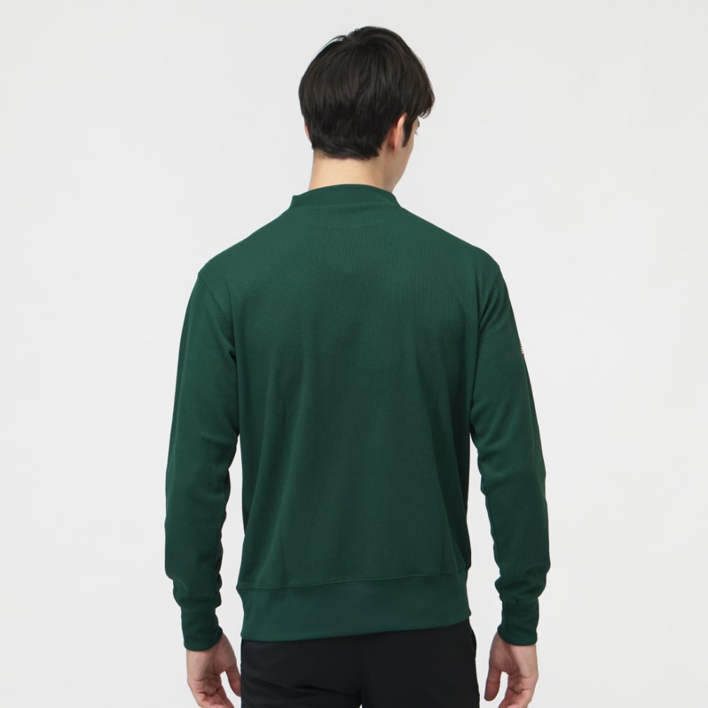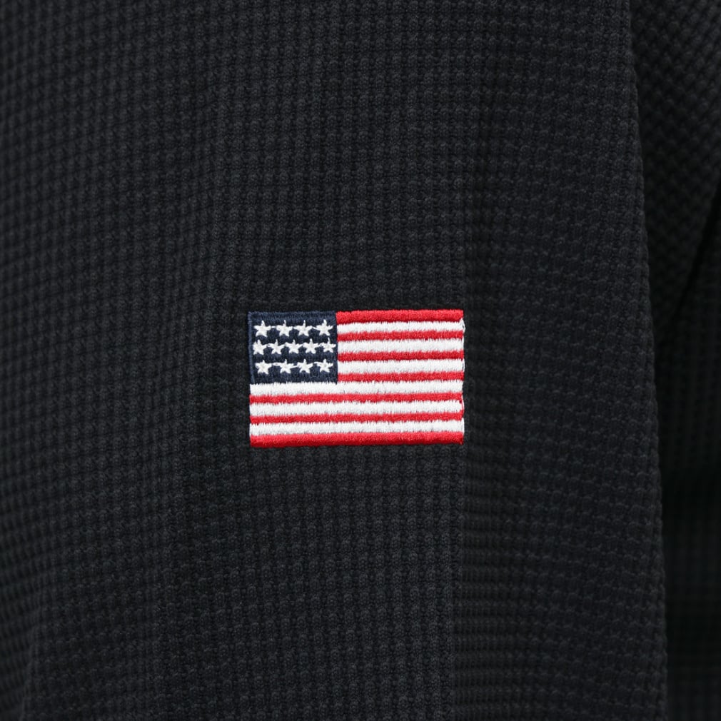 ◇環境に配慮されたリサイクルポリエステル100%の、軽量でソフトな肌触りのワッフル素材を使用したロングスリーブモックネックシャツです。優れた保温性に加え、吸汗速乾機能、UVカット機能(UPF50+)、遮熱機能も備えています。襟、袖口、裾はリブ仕様。袖口はグリップ周りをすっきりさせたデザインで、首に沿うように作り込んだ襟はストレッチ性があるので程良いフィット感の快適な着心地です。薄手の裾はお好みに合わせてタックインすることも、スウェットシャツのようにタックアウトして通気性を確保することもできます。左胸にはChampion(チャンピオン)ロゴを、右袖にはアメリカ国旗柄を刺繍しています。