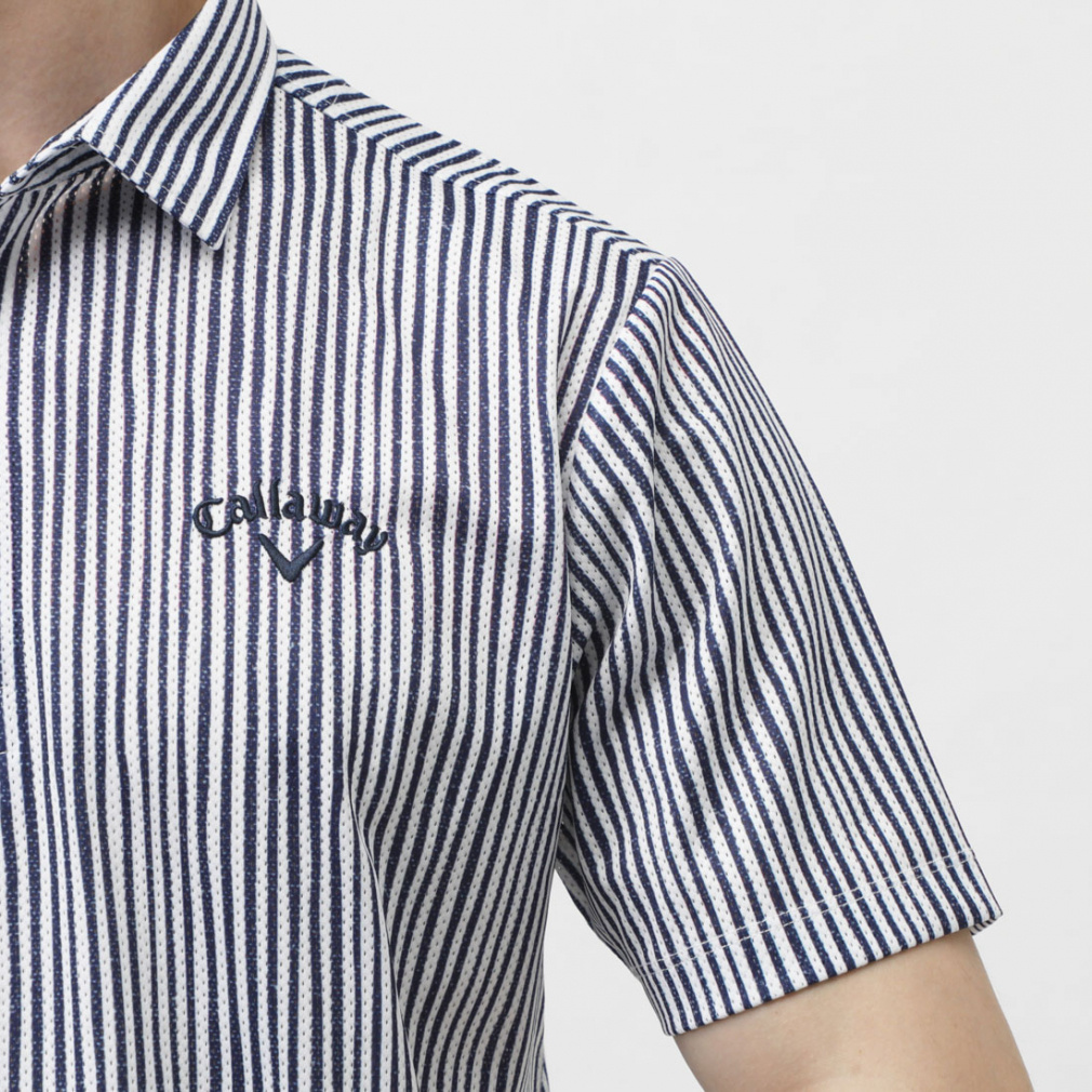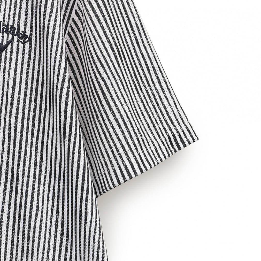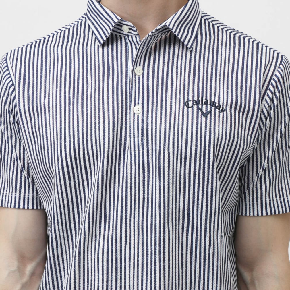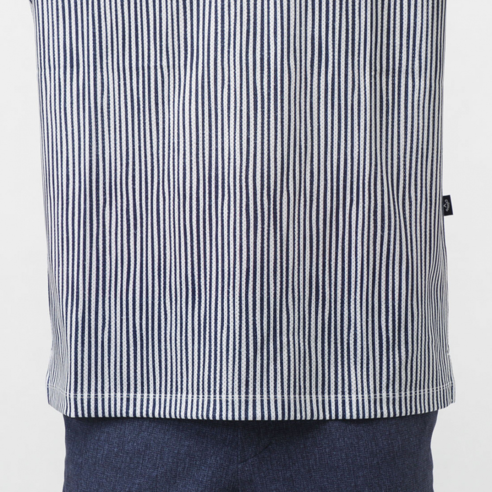 ◇風通りを良くする風穴がある素材「かざあなメッシュ」を使用した半袖シャツです。少しウェーブをかけたストライプをプリントしており、デザイン性とベーシックの調和が取れた柄になっています。肌面が凹凸感があるので、肌離れが良く着心地が良いアイテムです。