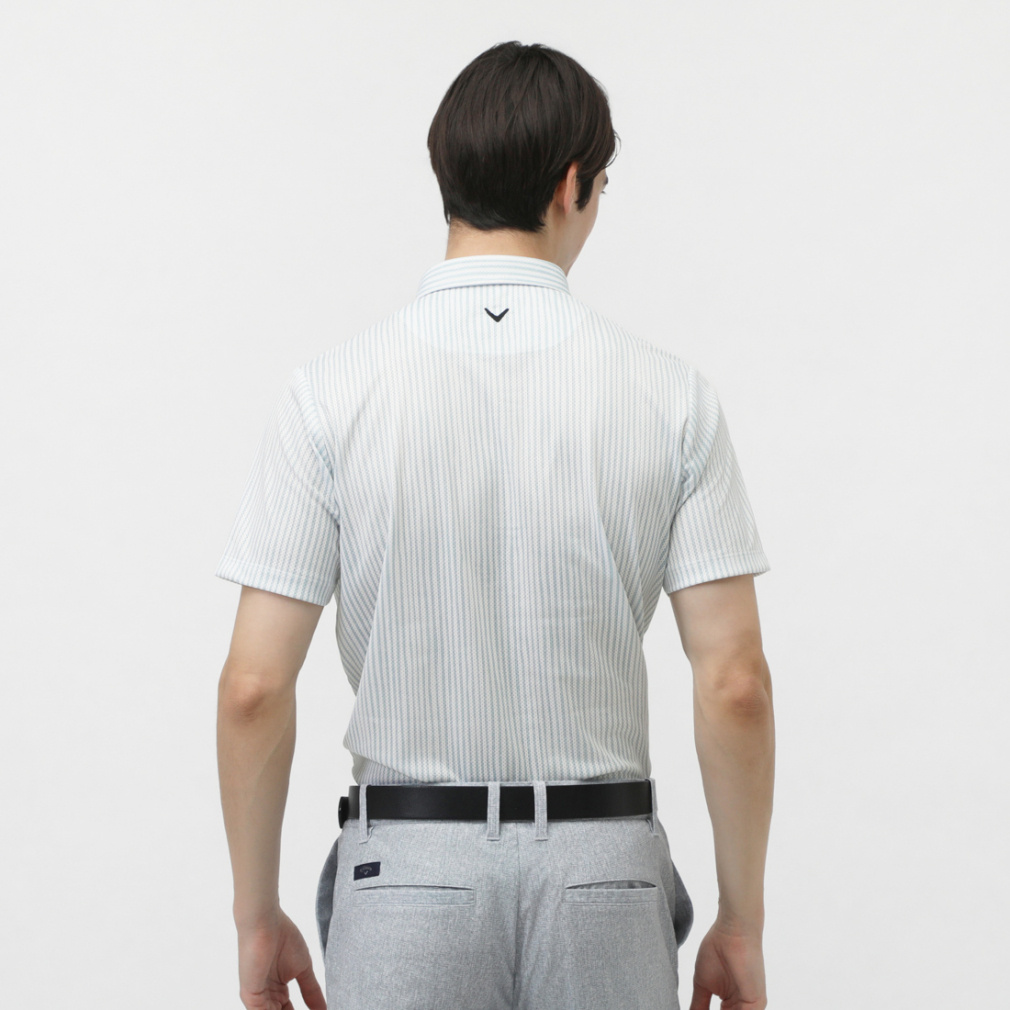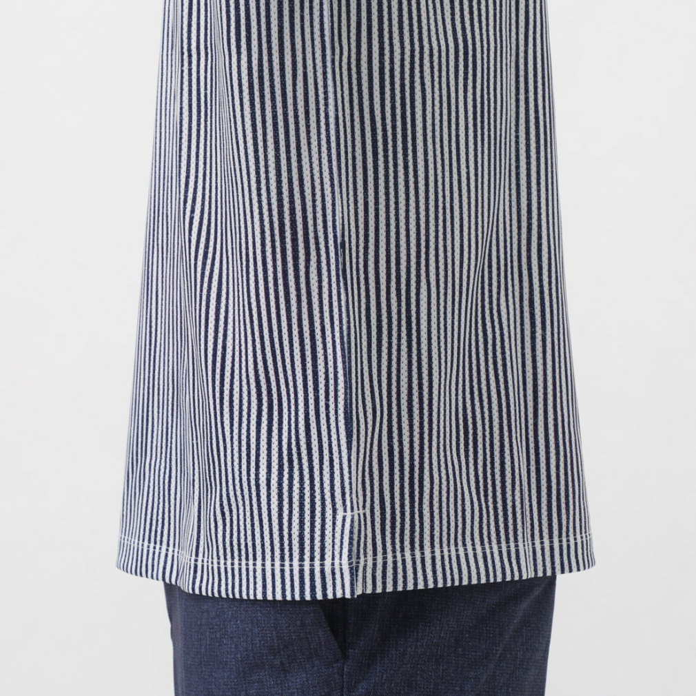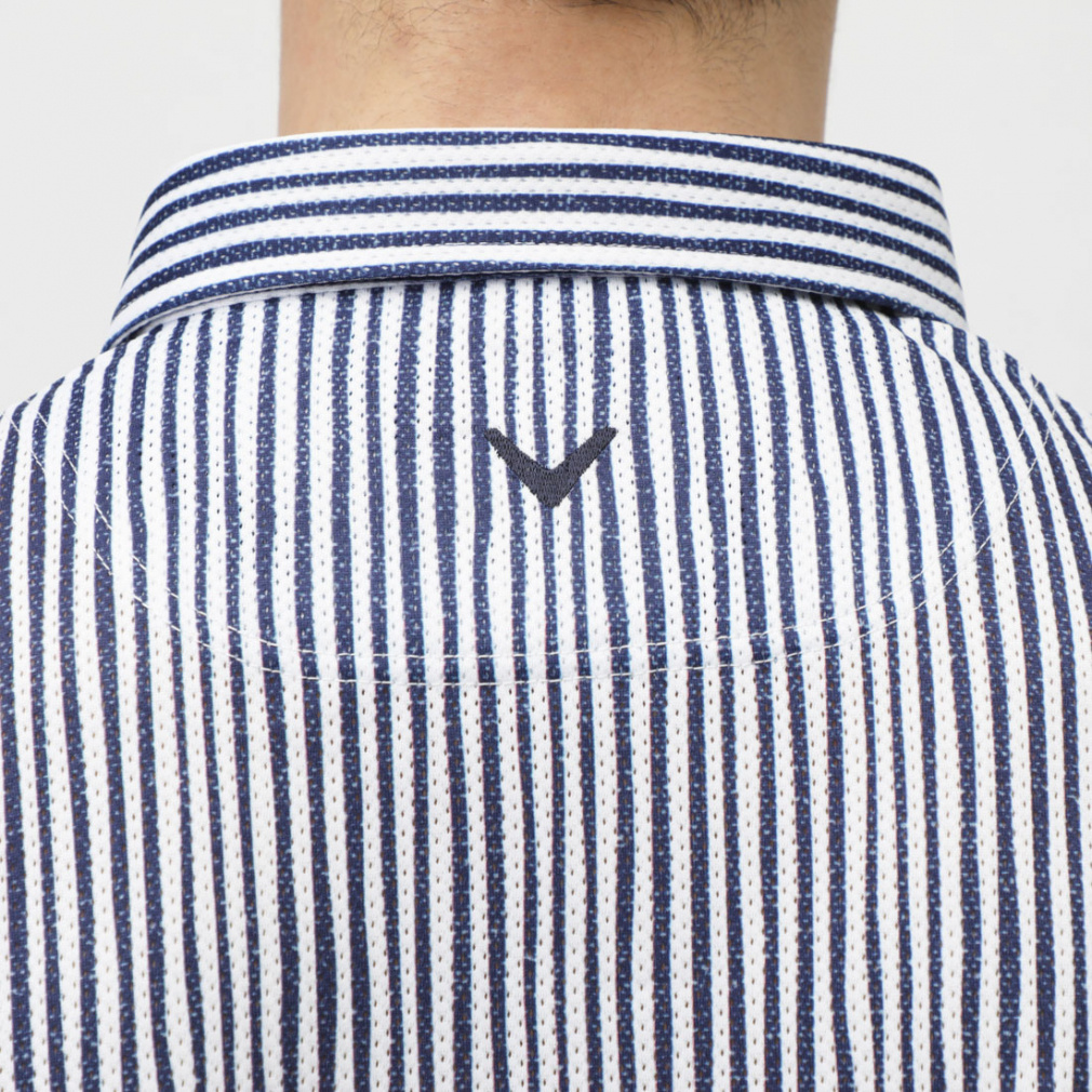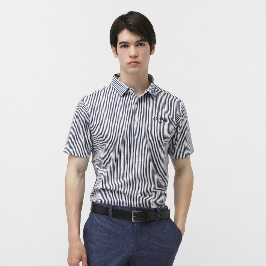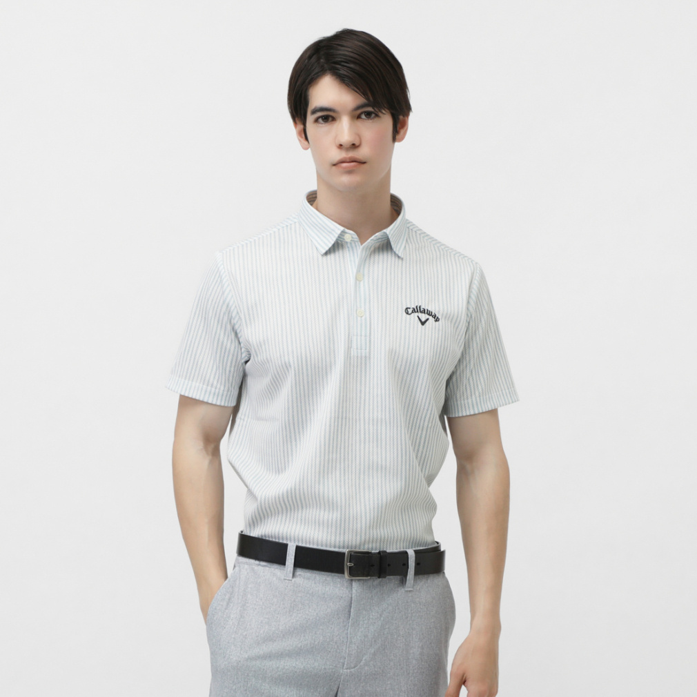 ◇風通りを良くする風穴がある素材「かざあなメッシュ」を使用した半袖シャツです。少しウェーブをかけたストライプをプリントしており、デザイン性とベーシックの調和が取れた柄になっています。肌面が凹凸感があるので、肌離れが良く着心地が良いアイテムです。