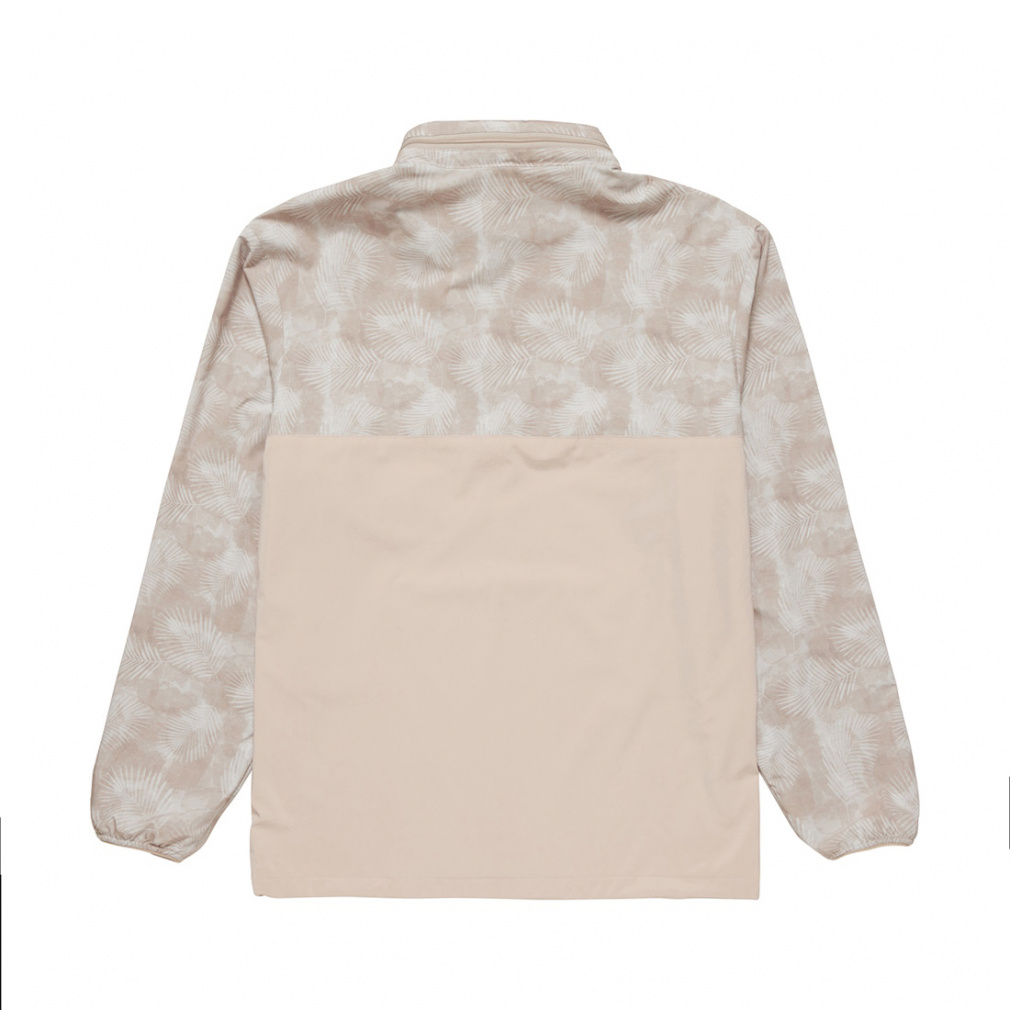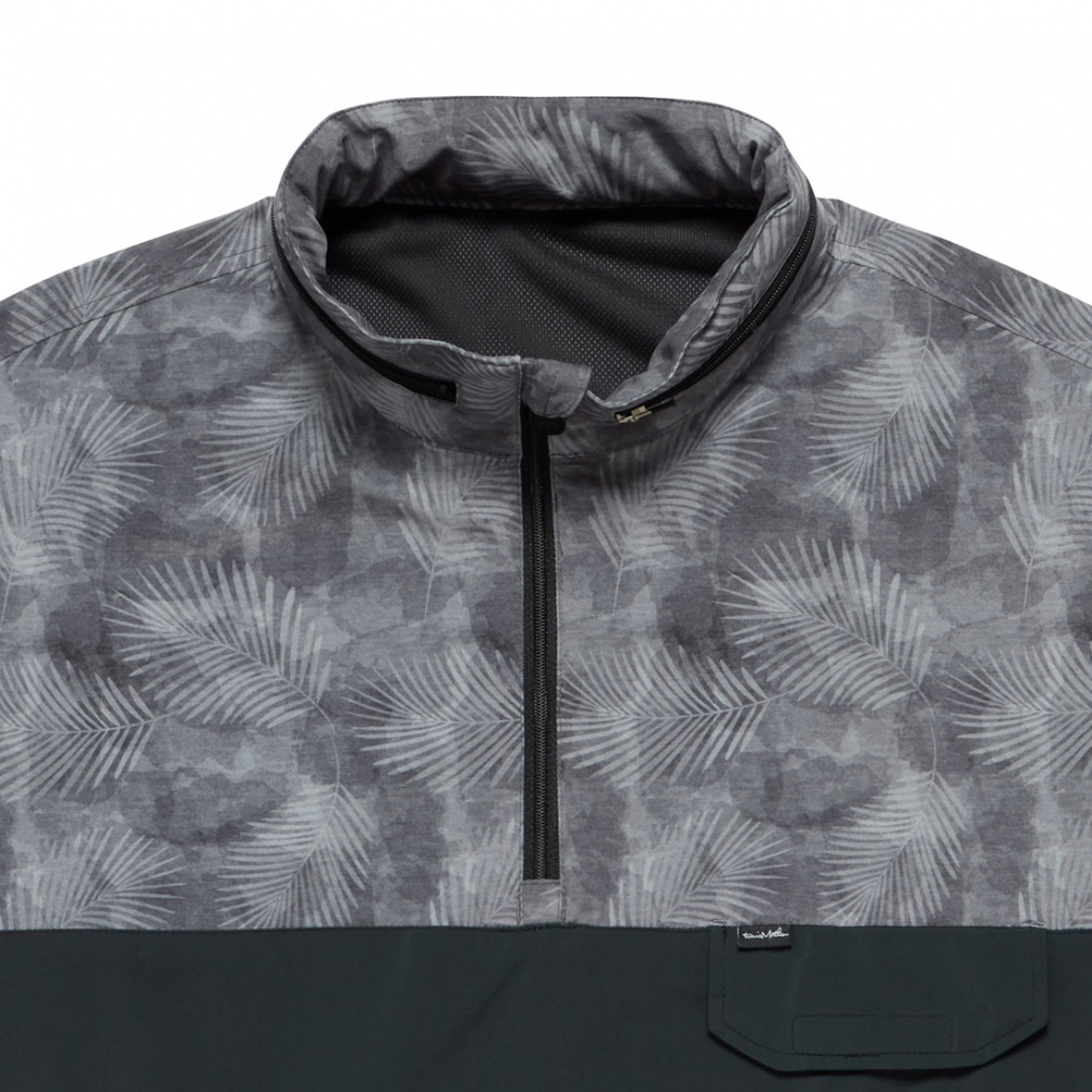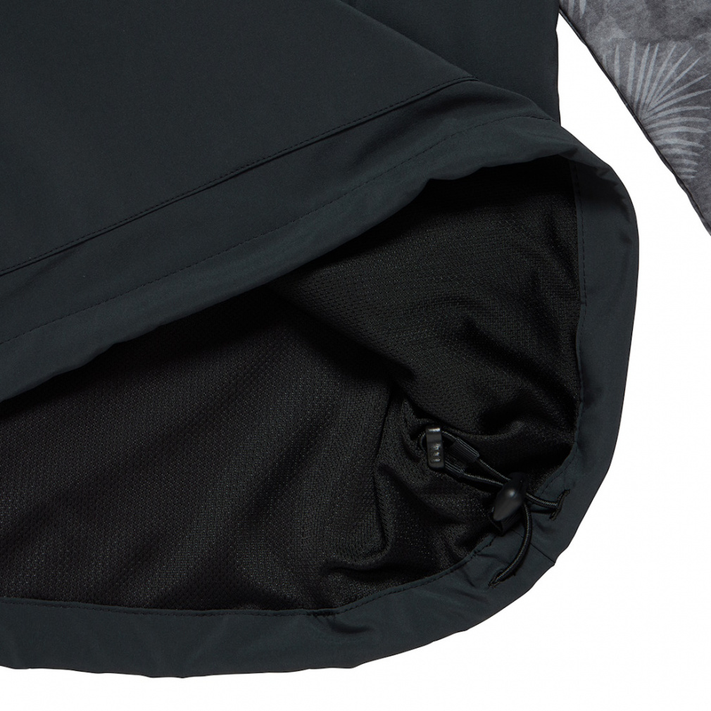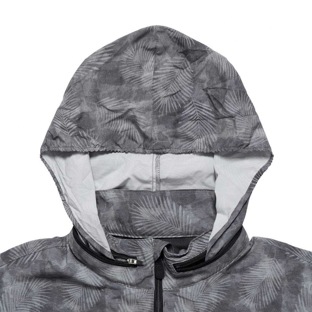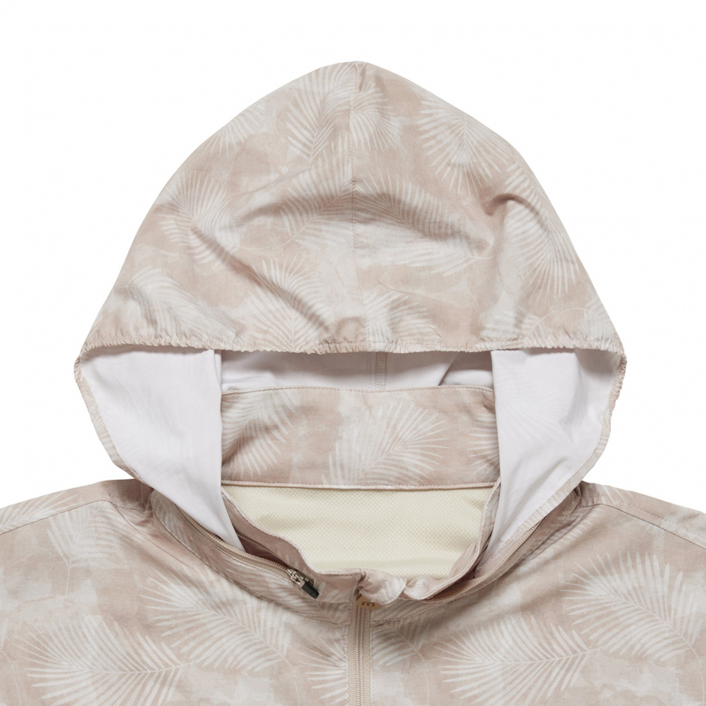◇撥水性のあるストレッチポリエステル素材にタイダイ風リーフ柄をプリントしたアノラックフーディー。衿にフードが収納できる仕様。