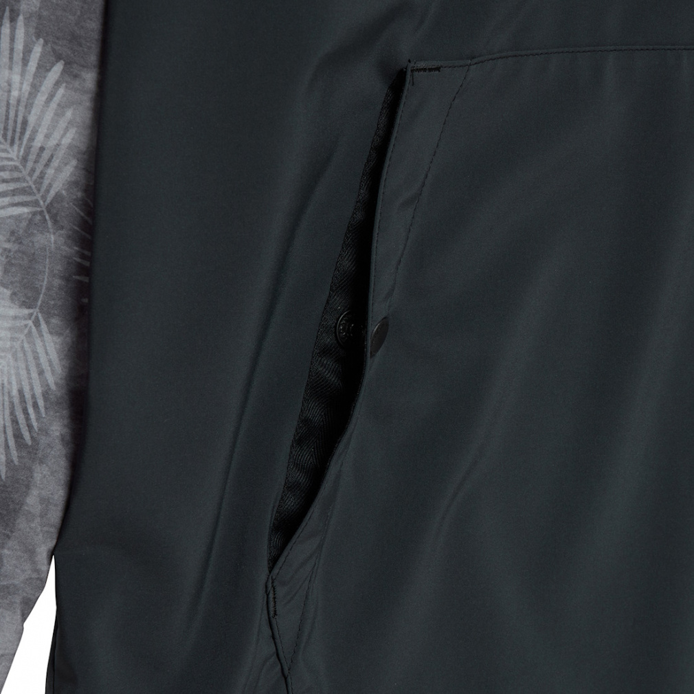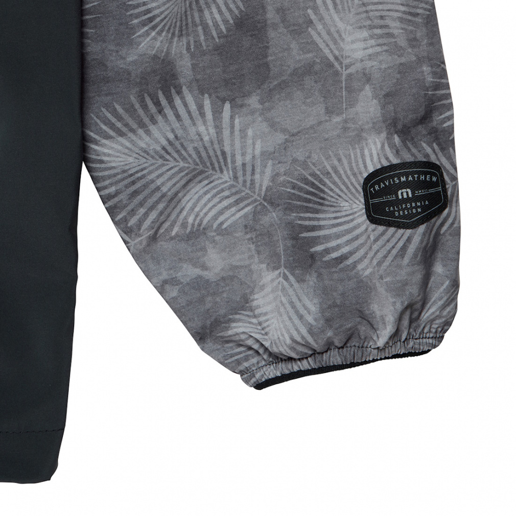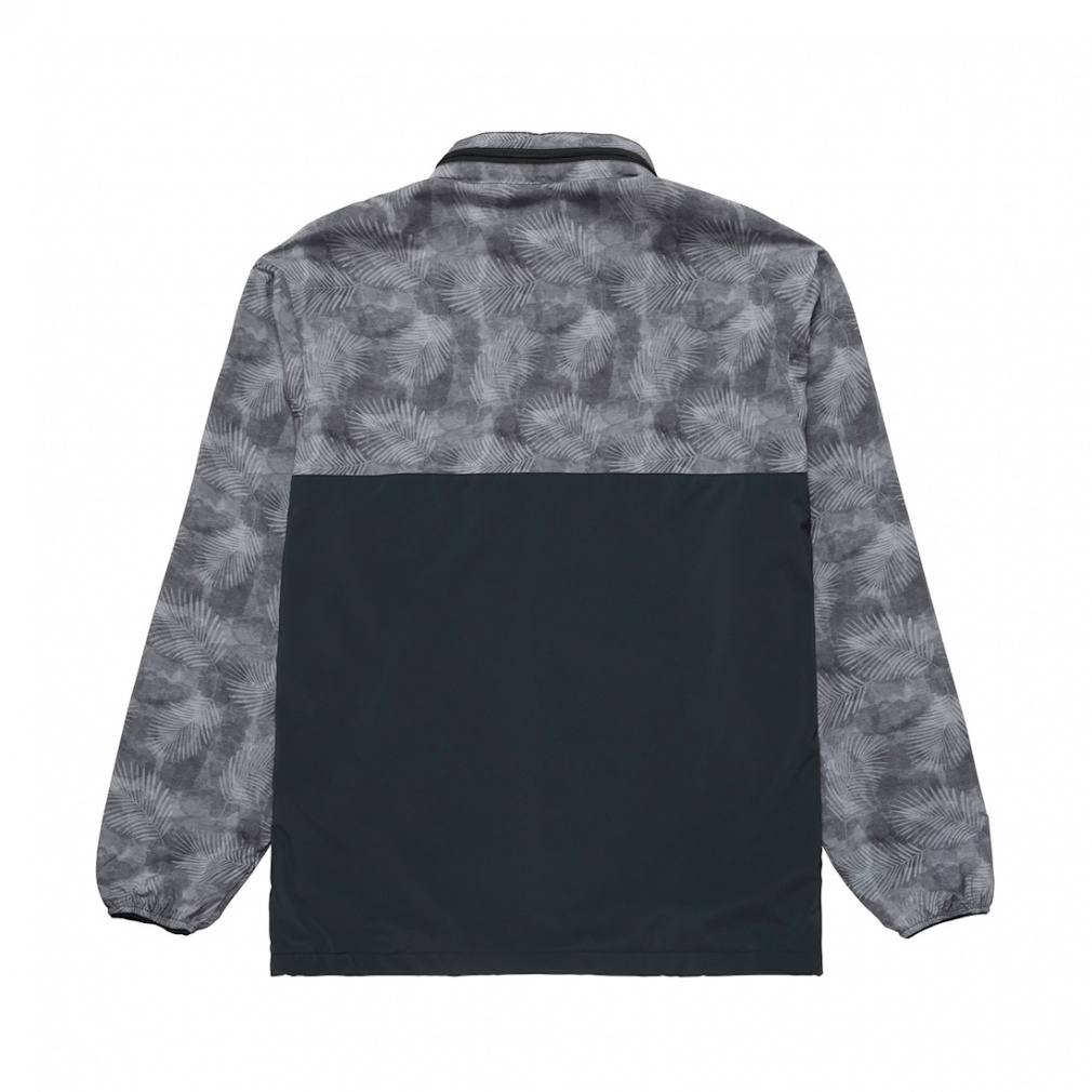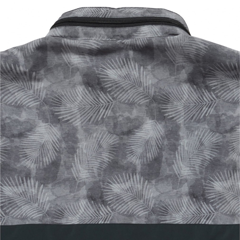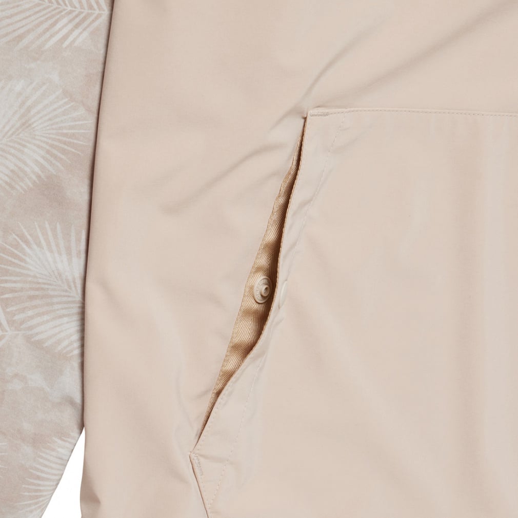 ◇撥水性のあるストレッチポリエステル素材にタイダイ風リーフ柄をプリントしたアノラックフーディー。衿にフードが収納できる仕様。