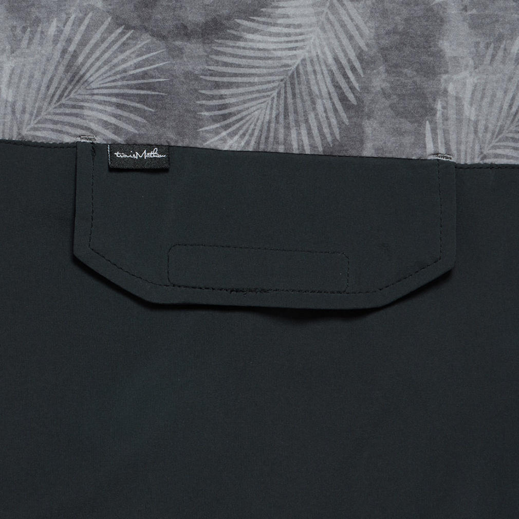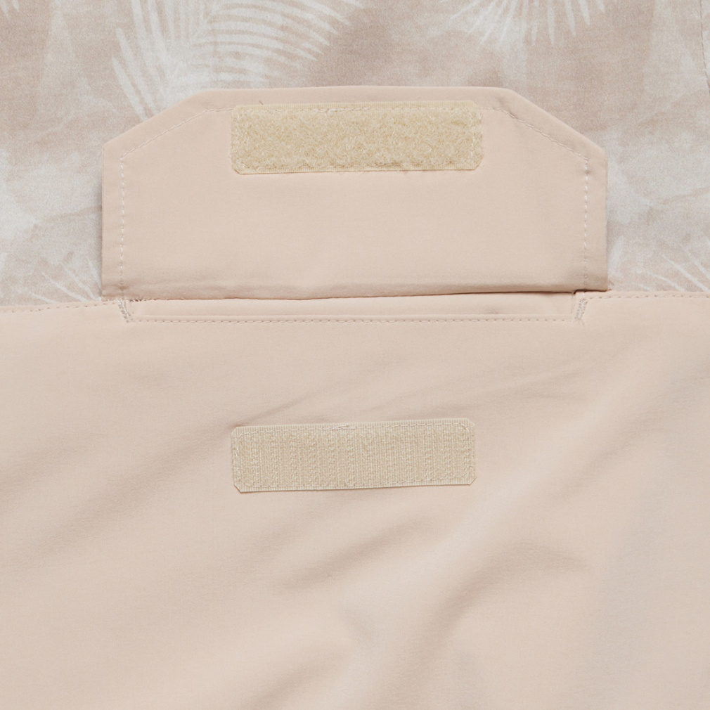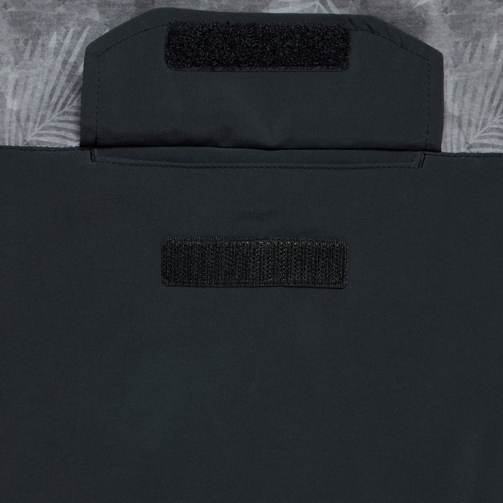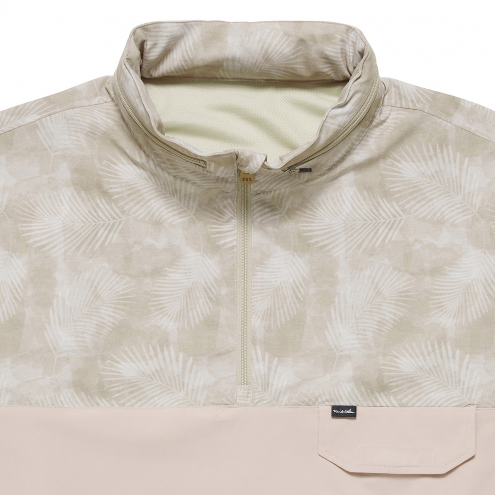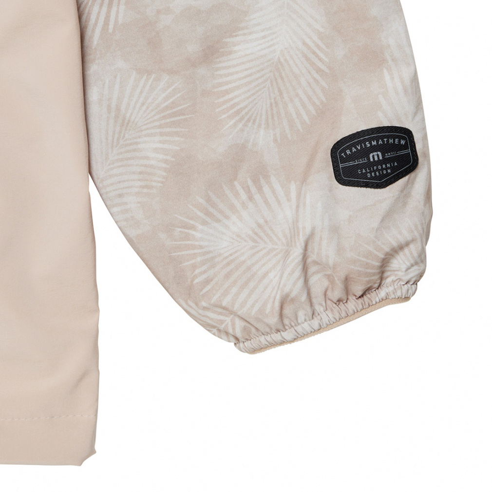 ◇撥水性のあるストレッチポリエステル素材にタイダイ風リーフ柄をプリントしたアノラックフーディー。衿にフードが収納できる仕様。