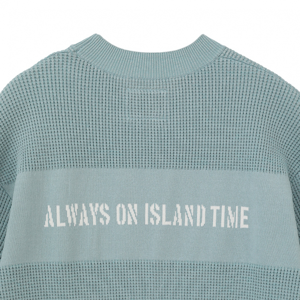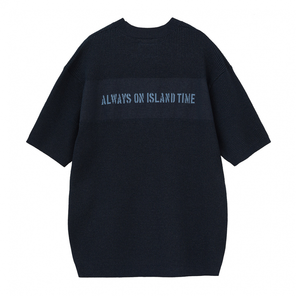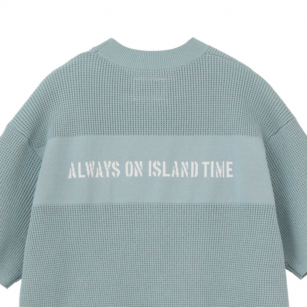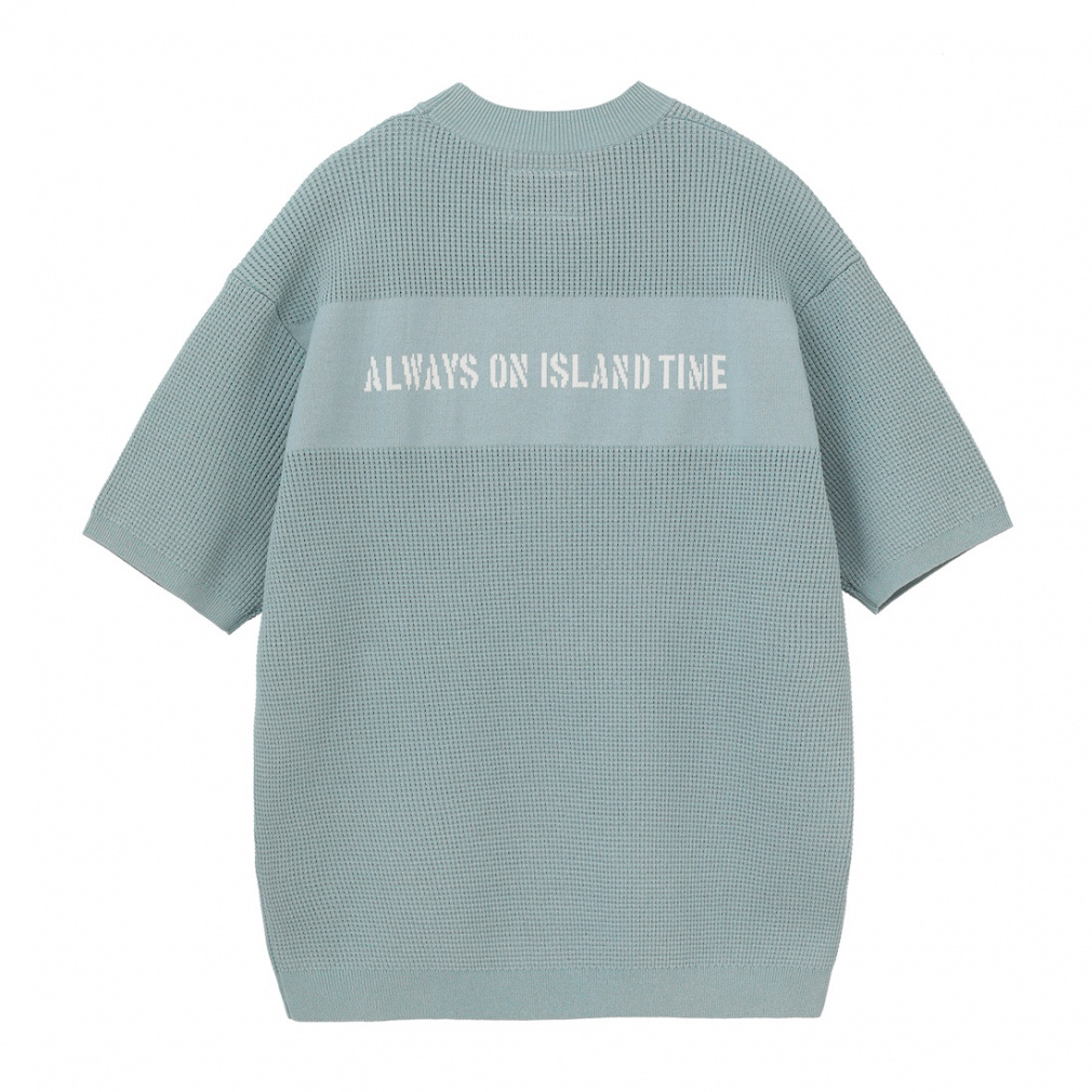 ◇リサイクルポリエステルを使用し、軽量かつ吸水性が特徴な素材。BACKには今シーズンのテーマ「ALWAYS ON ISLAND TIME」をジャガードで表現した半袖モックネックニット。品番:7AJ035