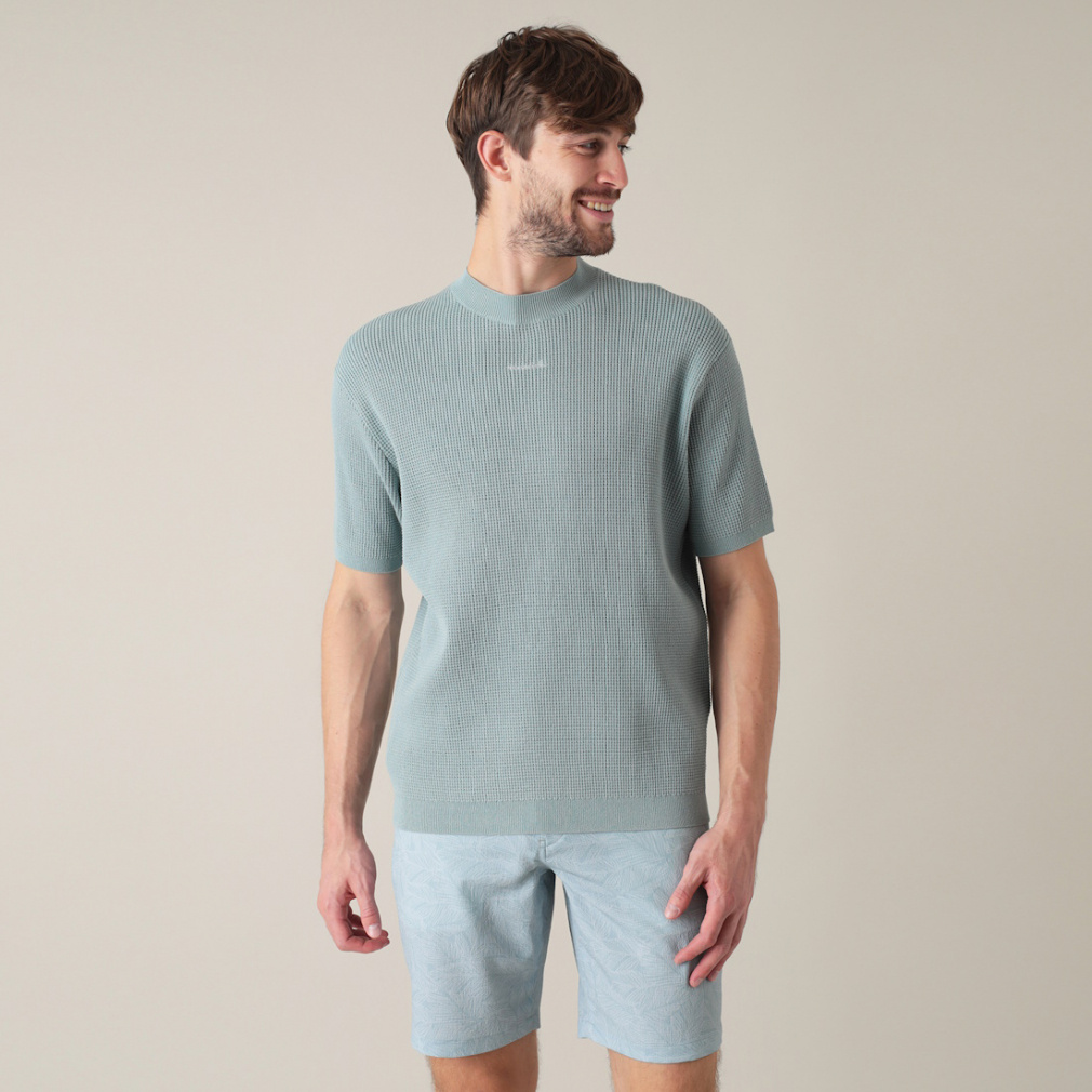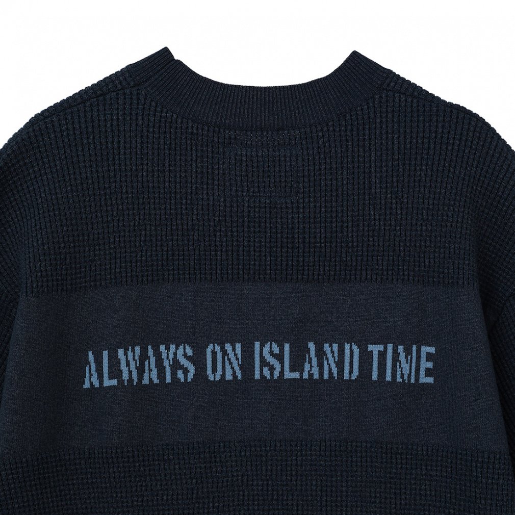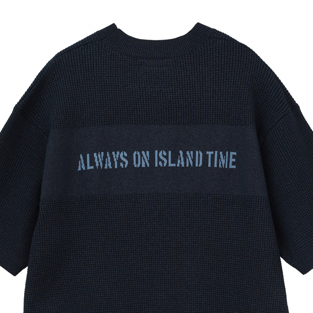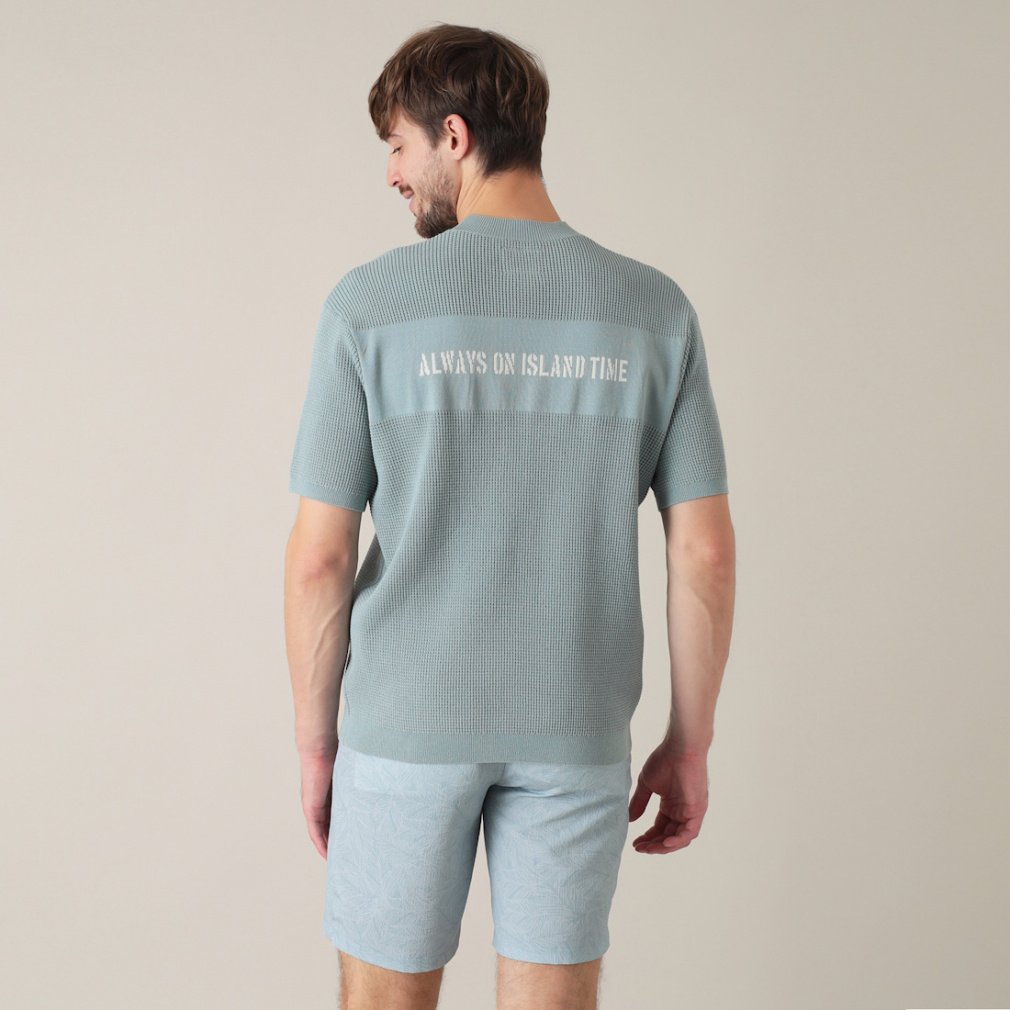 ◇リサイクルポリエステルを使用し、軽量かつ吸水性が特徴な素材。BACKには今シーズンのテーマ「ALWAYS ON ISLAND TIME」をジャガードで表現した半袖モックネックニット。品番:7AJ035