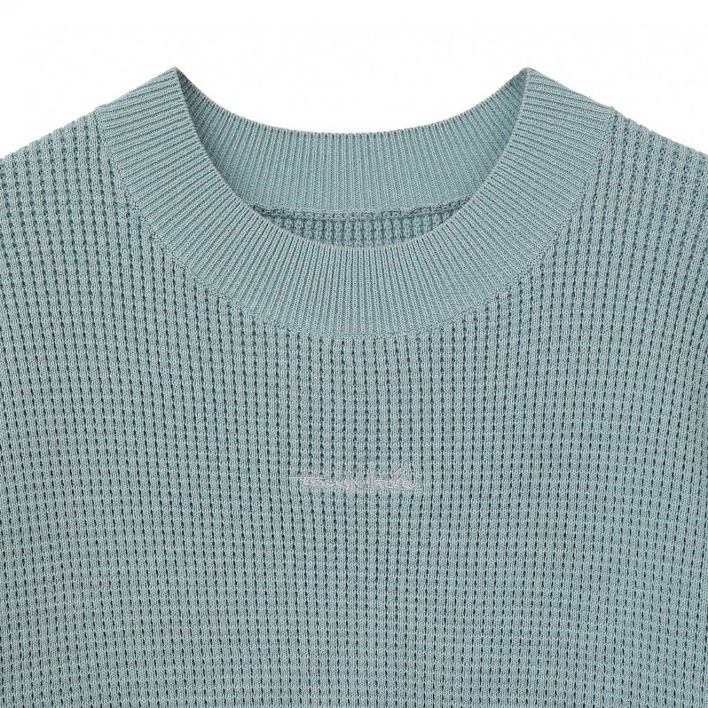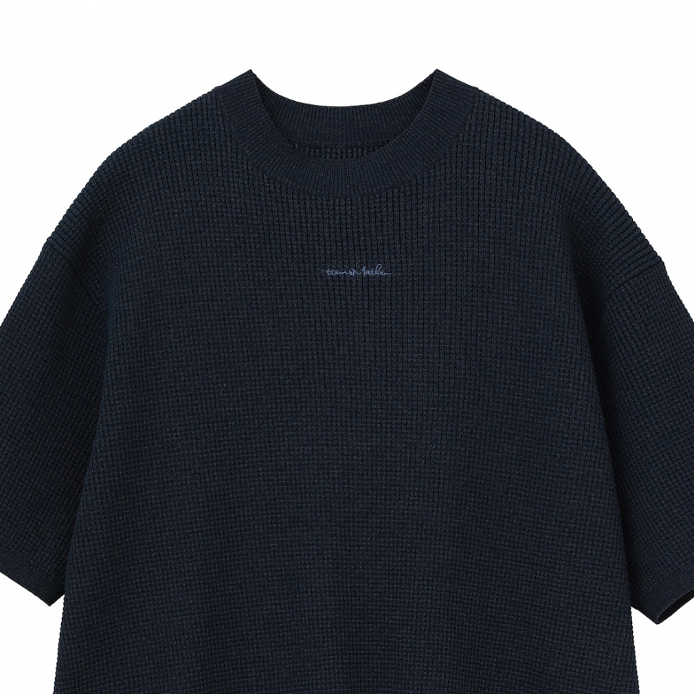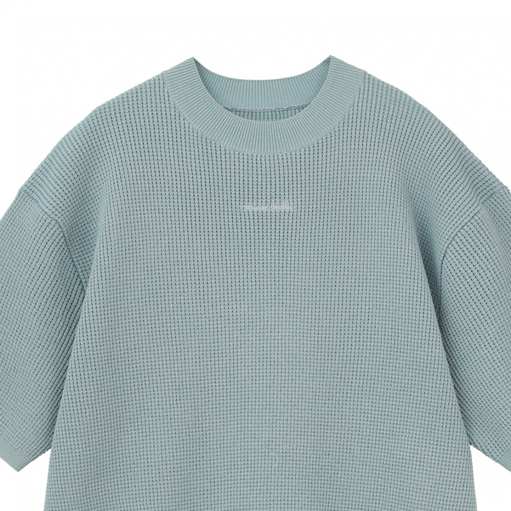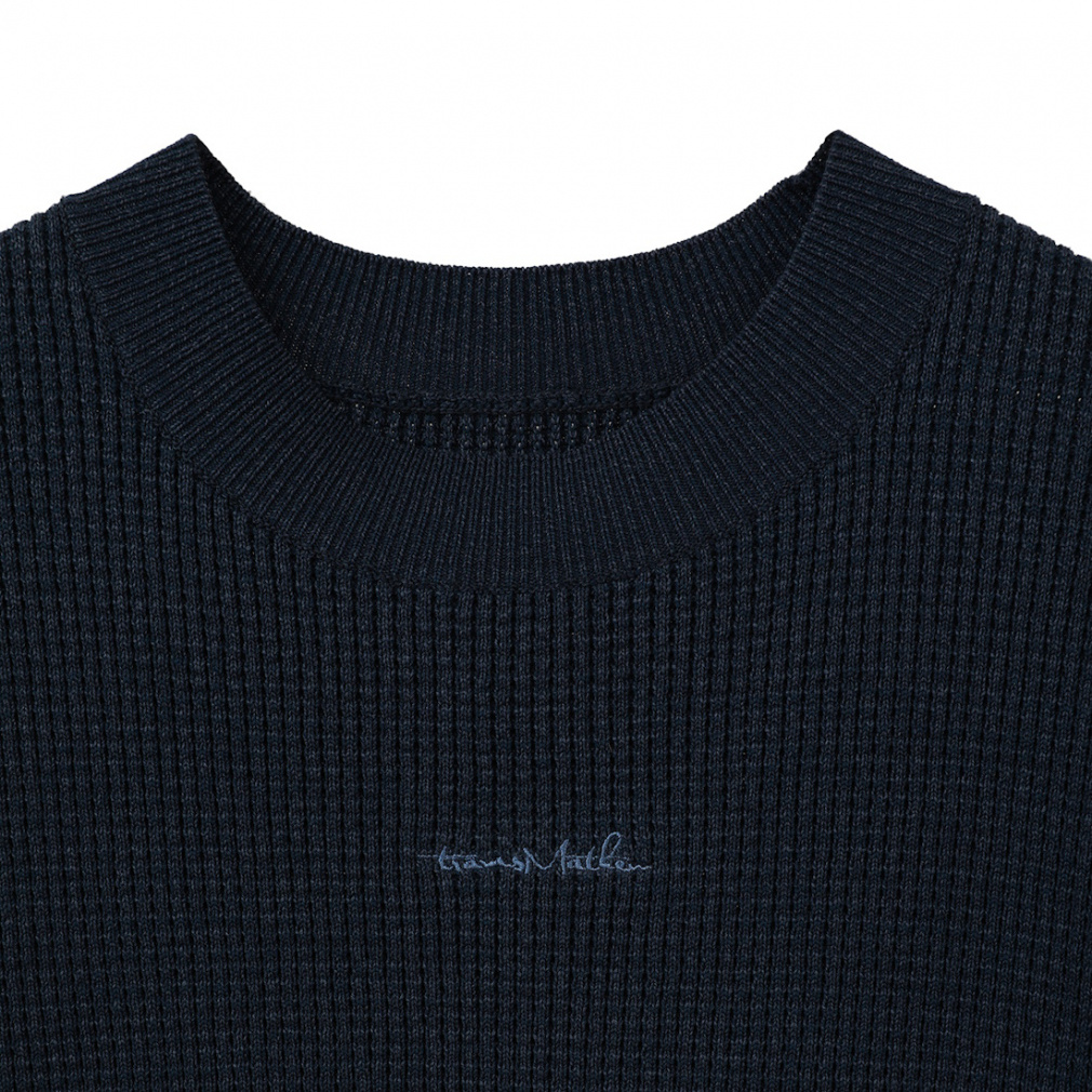 ◇リサイクルポリエステルを使用し、軽量かつ吸水性が特徴な素材。BACKには今シーズンのテーマ「ALWAYS ON ISLAND TIME」をジャガードで表現した半袖モックネックニット。品番:7AJ035