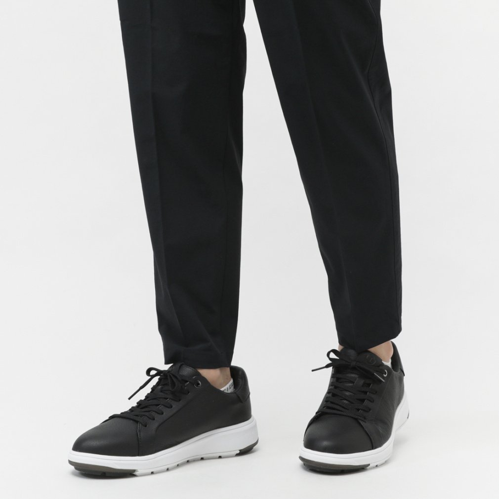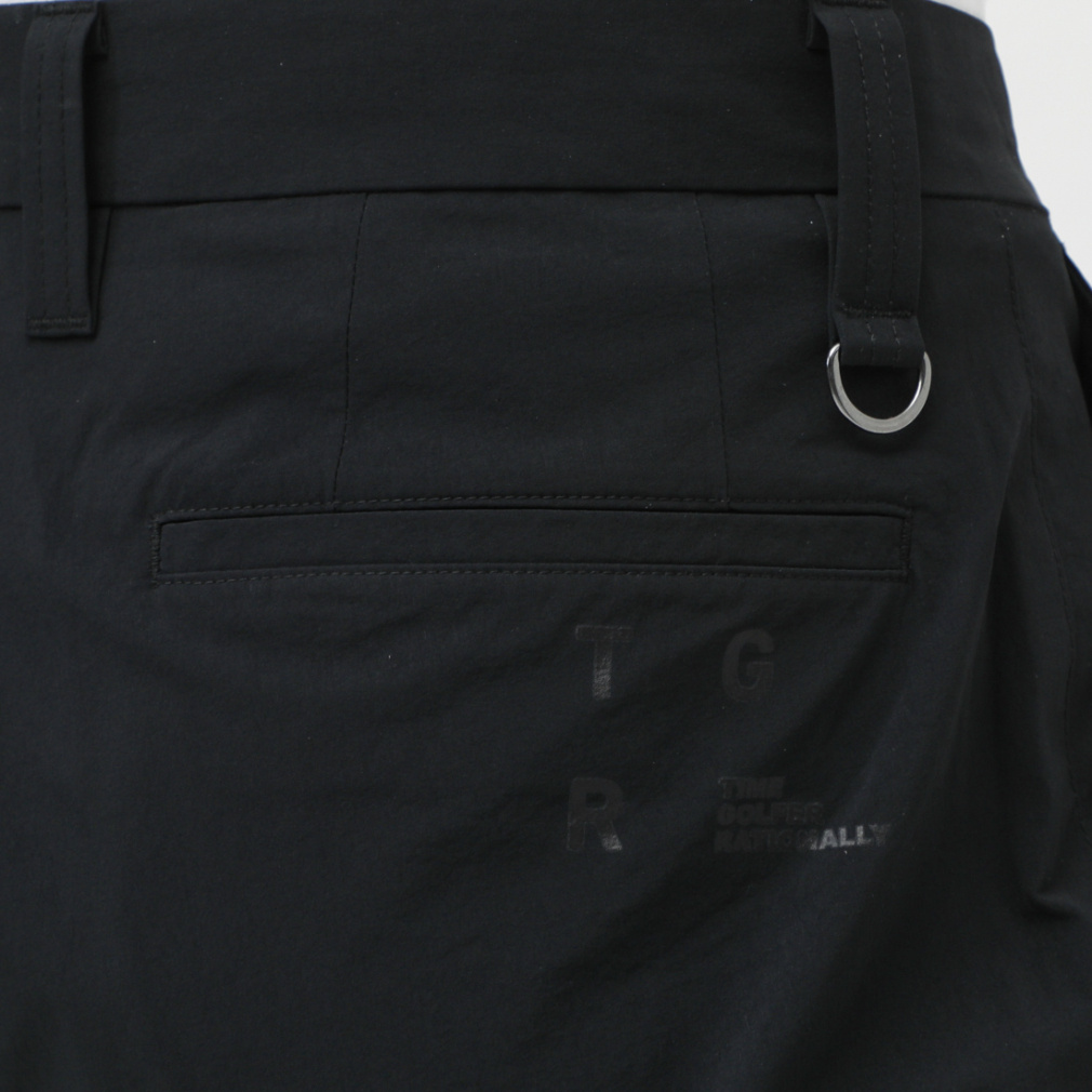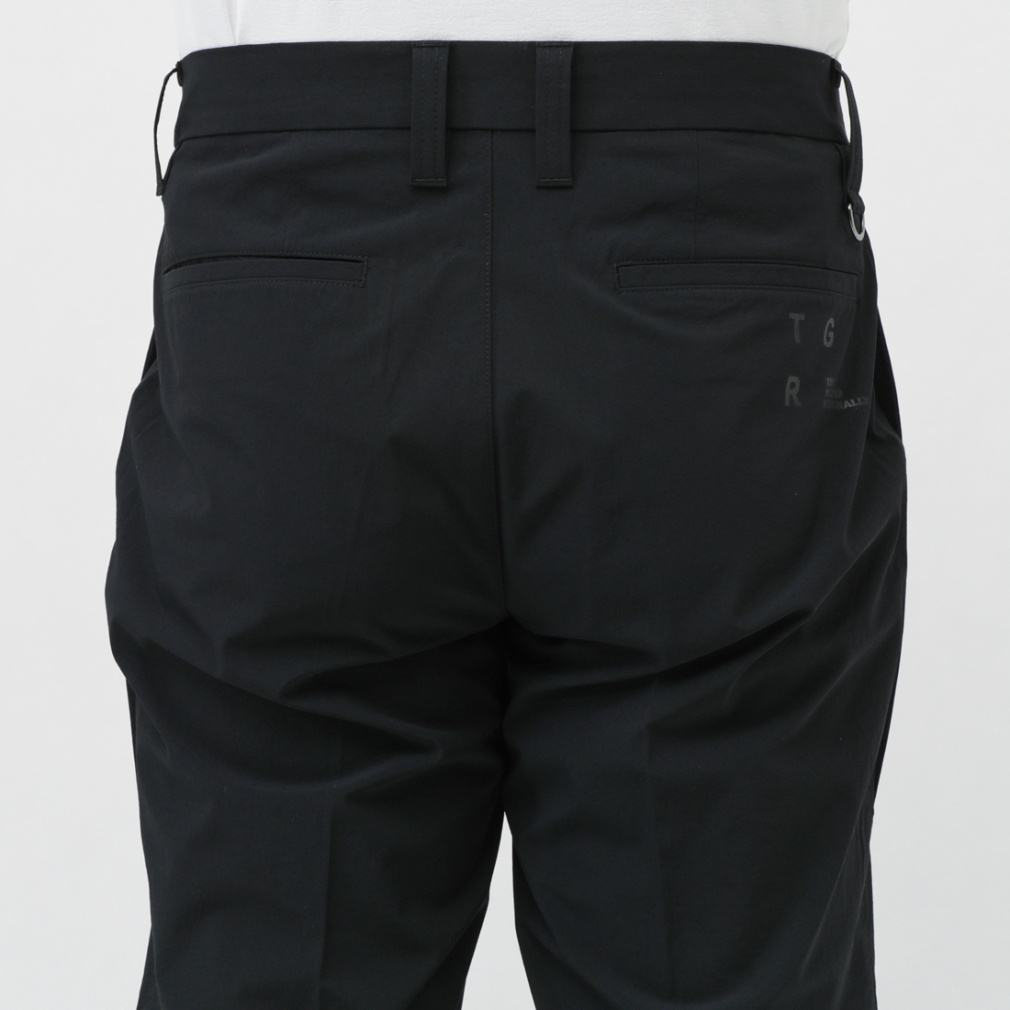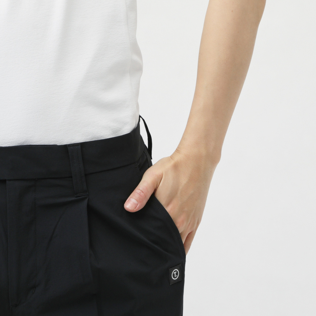 ◇1タッククロップドパンツ。膝から裾にかけて細くなるテーパードシルエット。ウエスト内側には滑り止めテープを配置し、シャツの裾の飛び出しを抑制します。日本製素材使用。リサイクルナイロンを使用し、合繊の産地:北陸で生産。素材を活かした染色技術で糸にテンションをかけずに仕上げることで、膨らみのある素材に仕上げました。再生素材使用。m