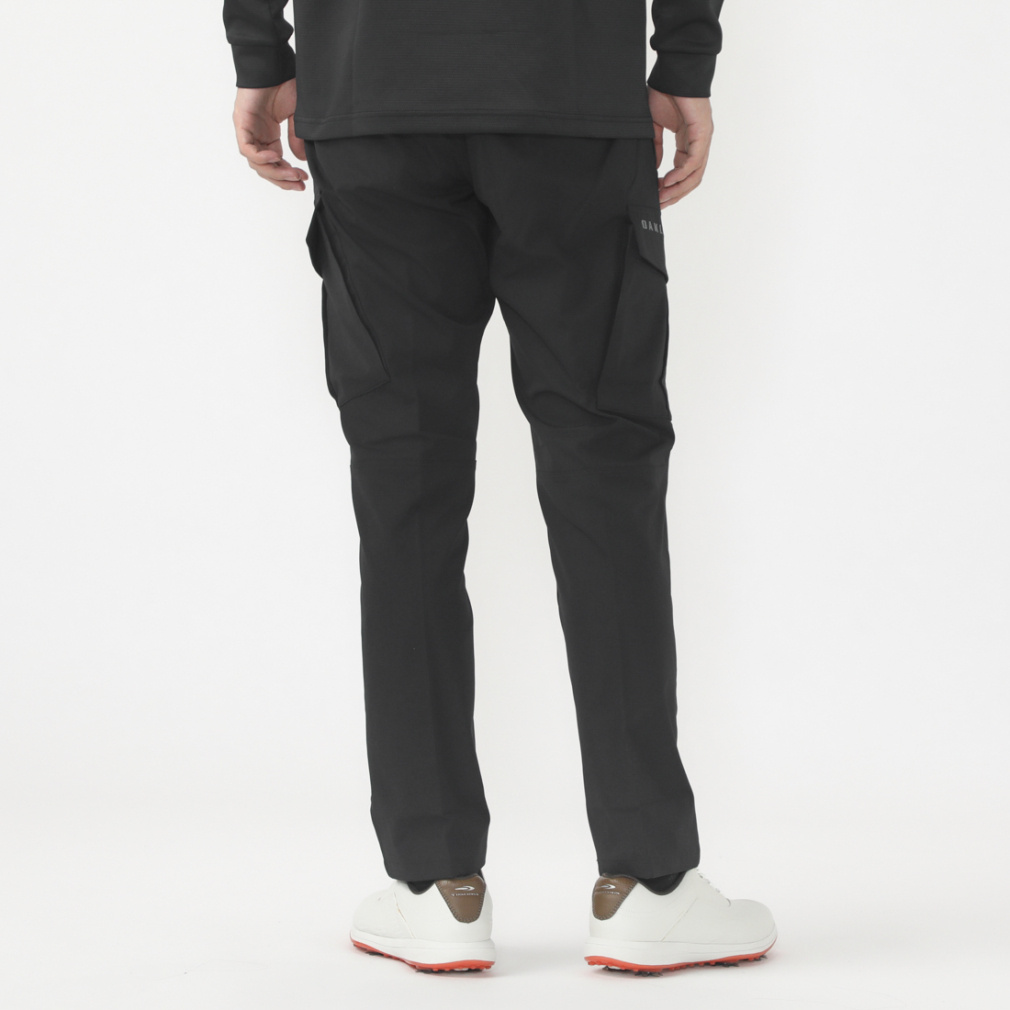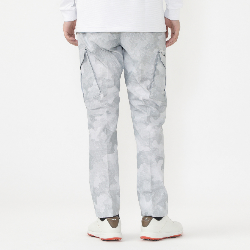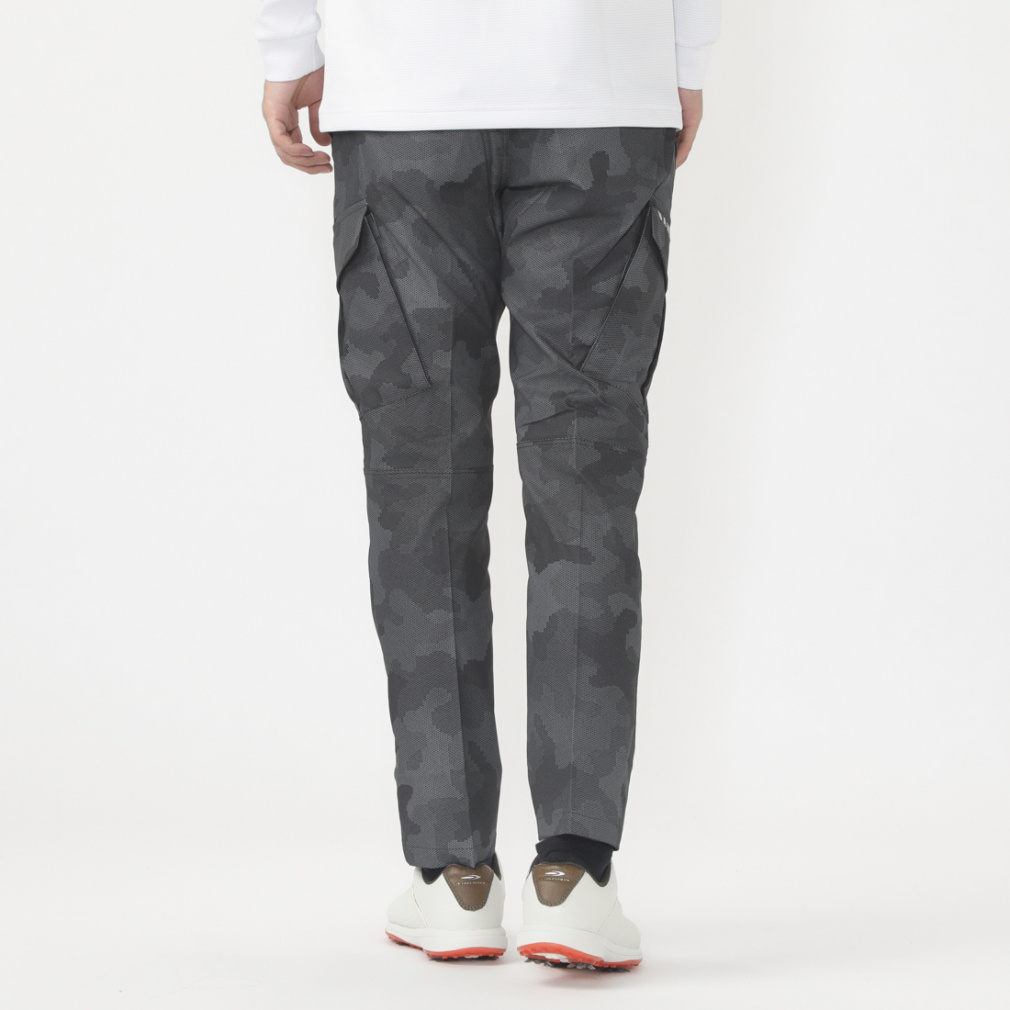 ◇ポリエステルヘリンボンの吸汗速乾素材を採用したストレートパンツ。腰裏に太い平ゴムを搭載し、ウエストに伸びを持たせたリラックス仕様のパンツ。無地と総柄の展開で総柄に入ったプリントは細かい幾何学柄で組まれたオリジナルのカモフラージュ柄を採用し、価値観を演出。両脇に大き目のカーゴポケットを搭載し、シンプルになりがちなコーデにアクセントとなるアイテム。股マチにより足の可動域を拡げ、膝ダーツにより屈伸の際の負荷を軽減。右後ろベルトループにはDカンを付け利便性を考慮し、センターバックのベルトループを変形させて作ったロゴがデザインを引き立てる。(股下寸法 US/Mサイズ=74cm)