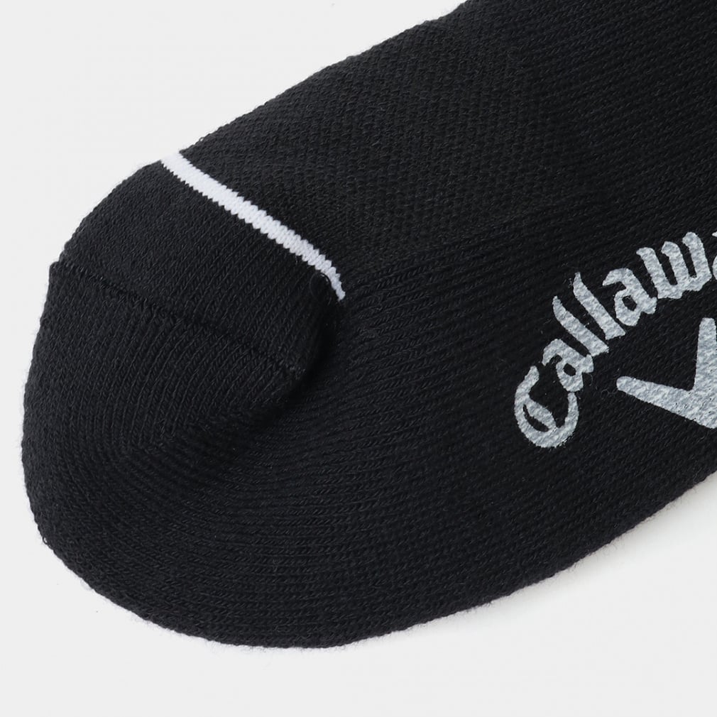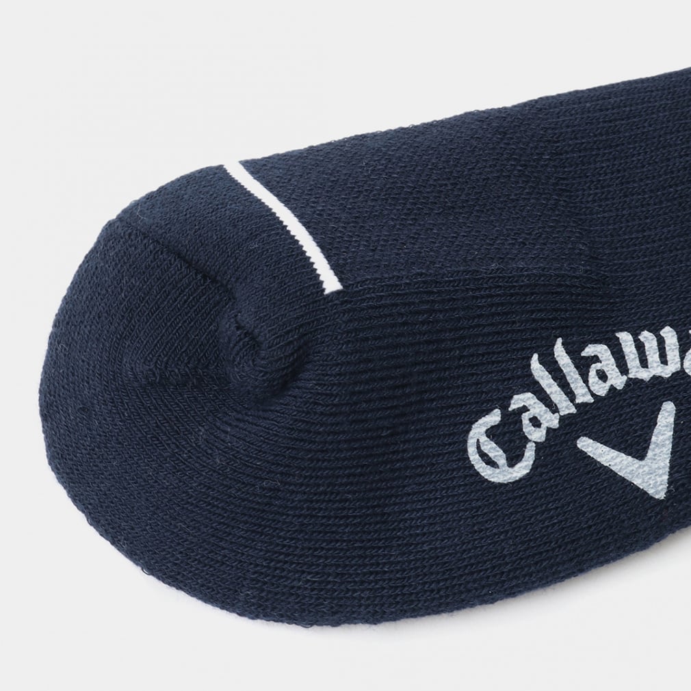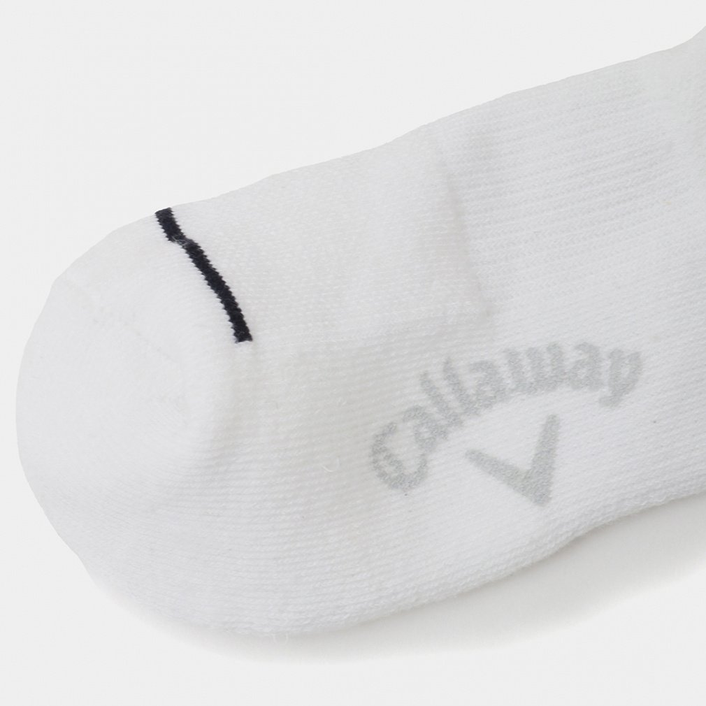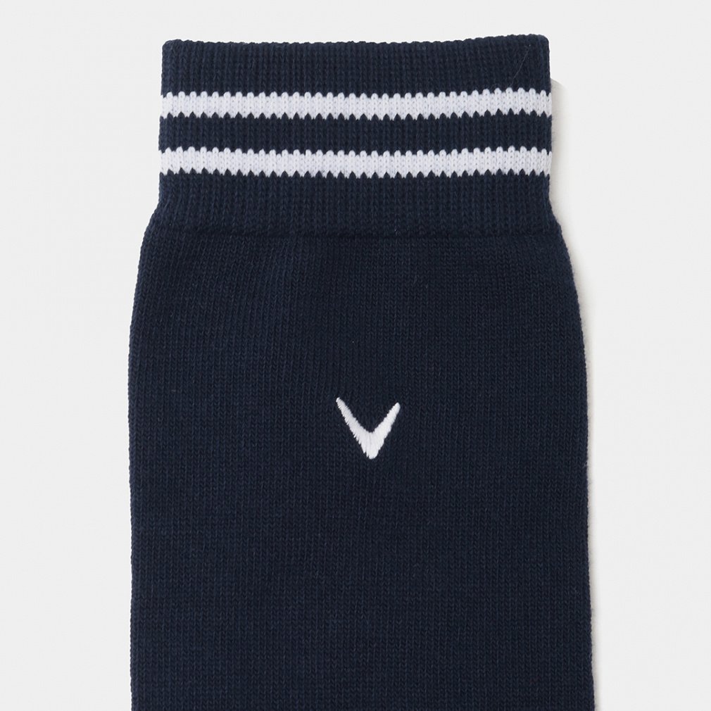 ◇キャロウェイシェブロン刺繍を施した定番ハイソックス。適度にしっかりした厚みのある足底サポートを配置し、ズレにくく、足底パイルでクッション性のある快適性を高めたはき心地。