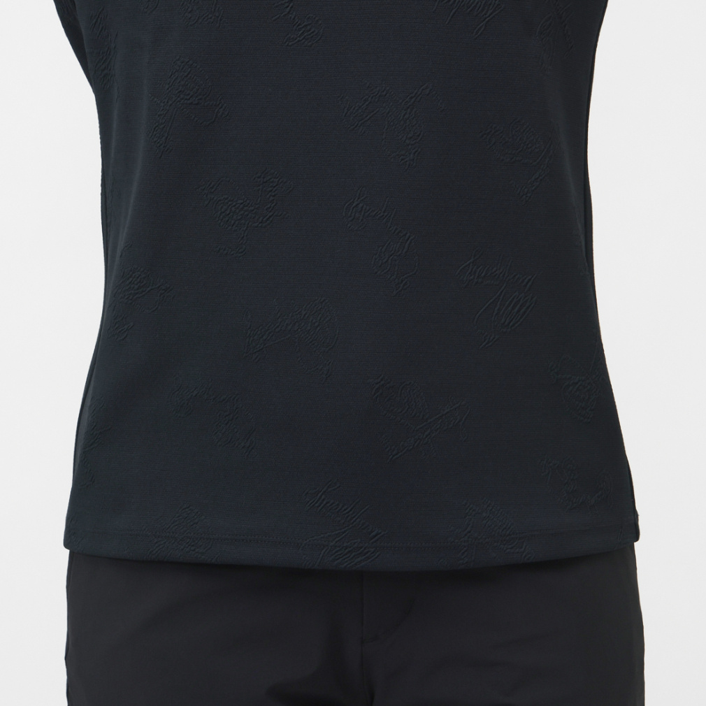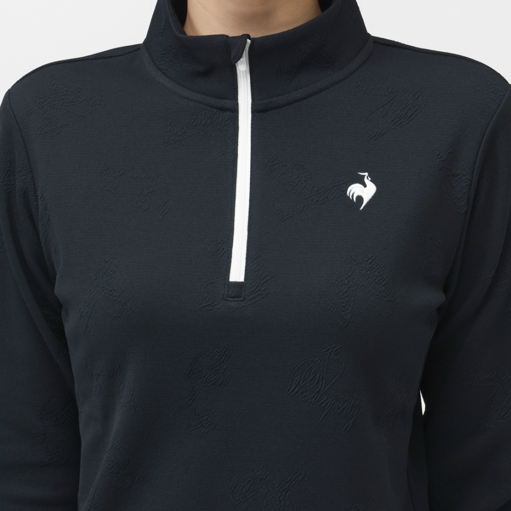 ◇ロゴとニワトリモチーフをジャガード織りで表現した、総柄デザインが特徴のハーフジップシャツ。
