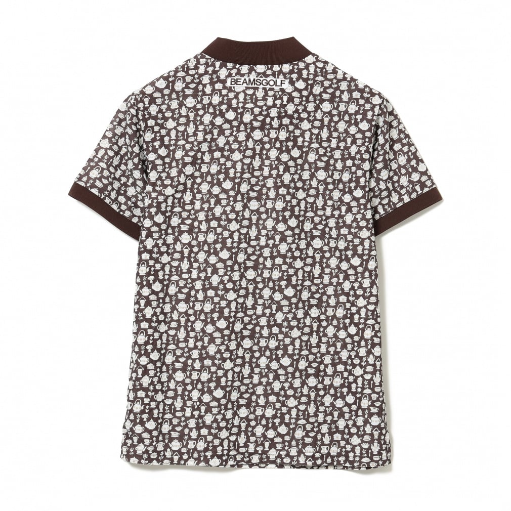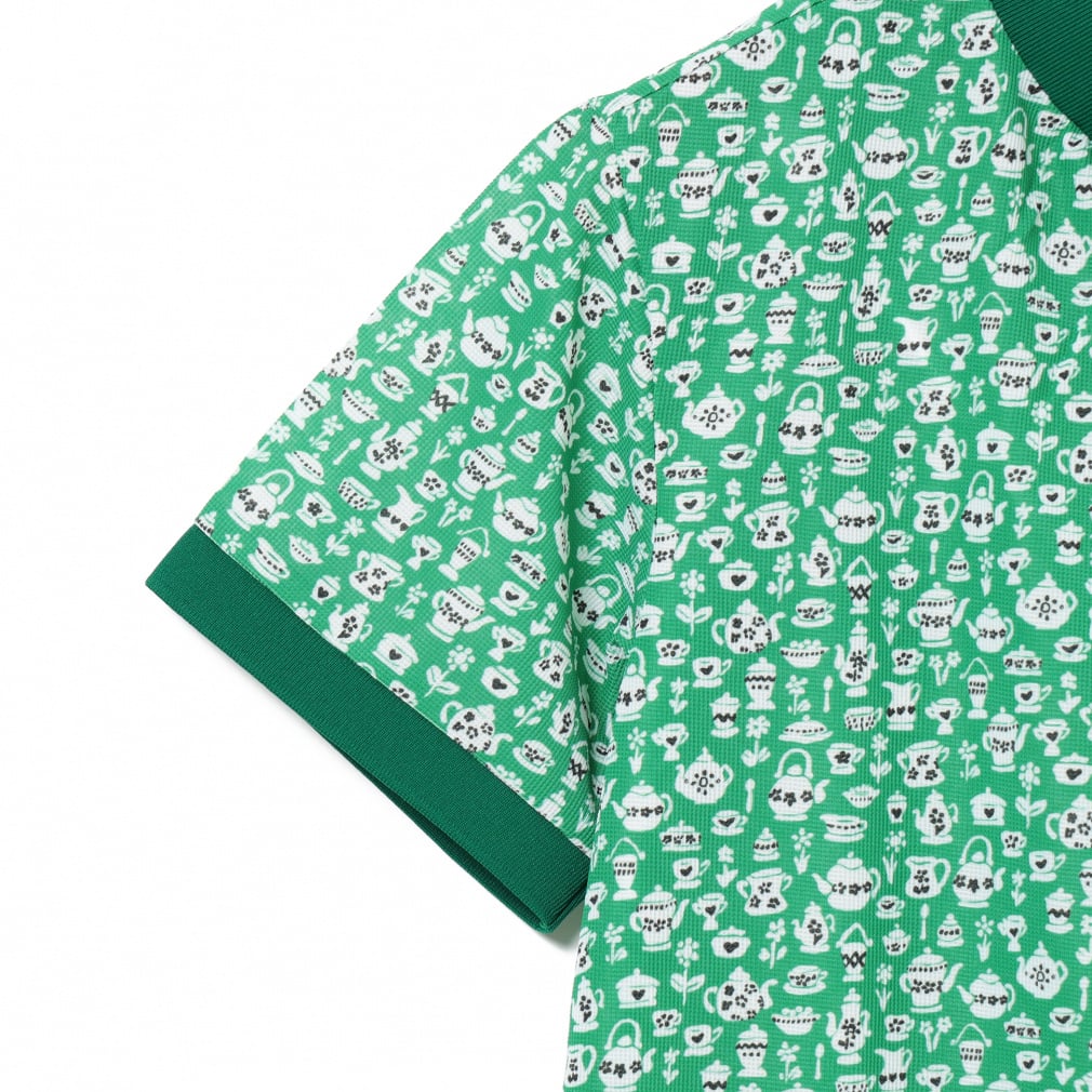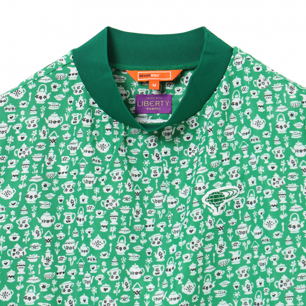 ◇BEAMS GOLFの2025年春夏のテーマ『DESSERT(デザート)』にぴったりのcafe柄プリントのモックネックシャツ。ティーパーティーをイメージしてデザインされたリバティ社のプリントパターン「スージー・エリザベス」をもとに、BEAMS GOLFオリジナルの柄を製作してもらいました。よく見ると手書きでお茶会に必要な食器の全てが描かれています。素材は、吸水速乾、UVカット機能付きの、薄く軽やかなメッシュ調の鹿の子。プリントの色合いも相まって上品でさわやかな印象です。リブ編みの襟と袖口がメリハリをつけ、襟元のギャザーがフェミニンさを添えています。