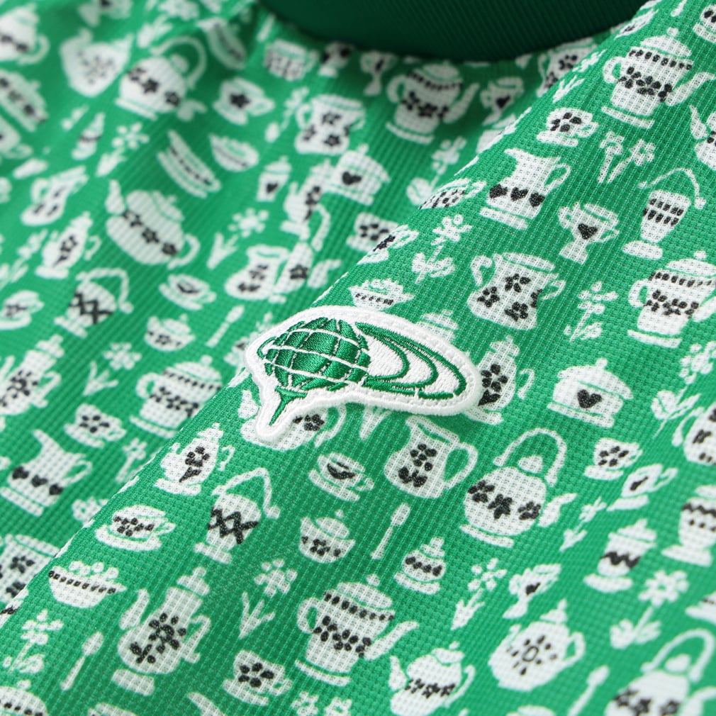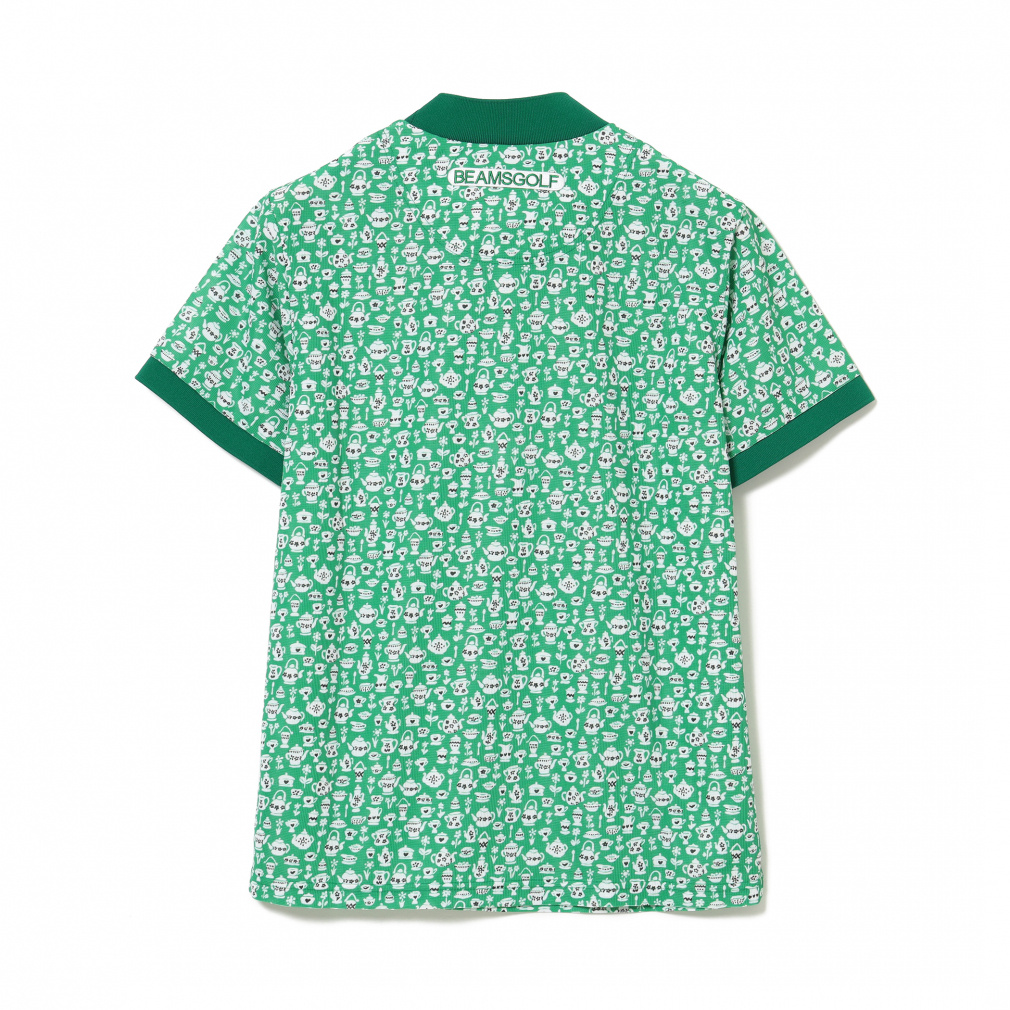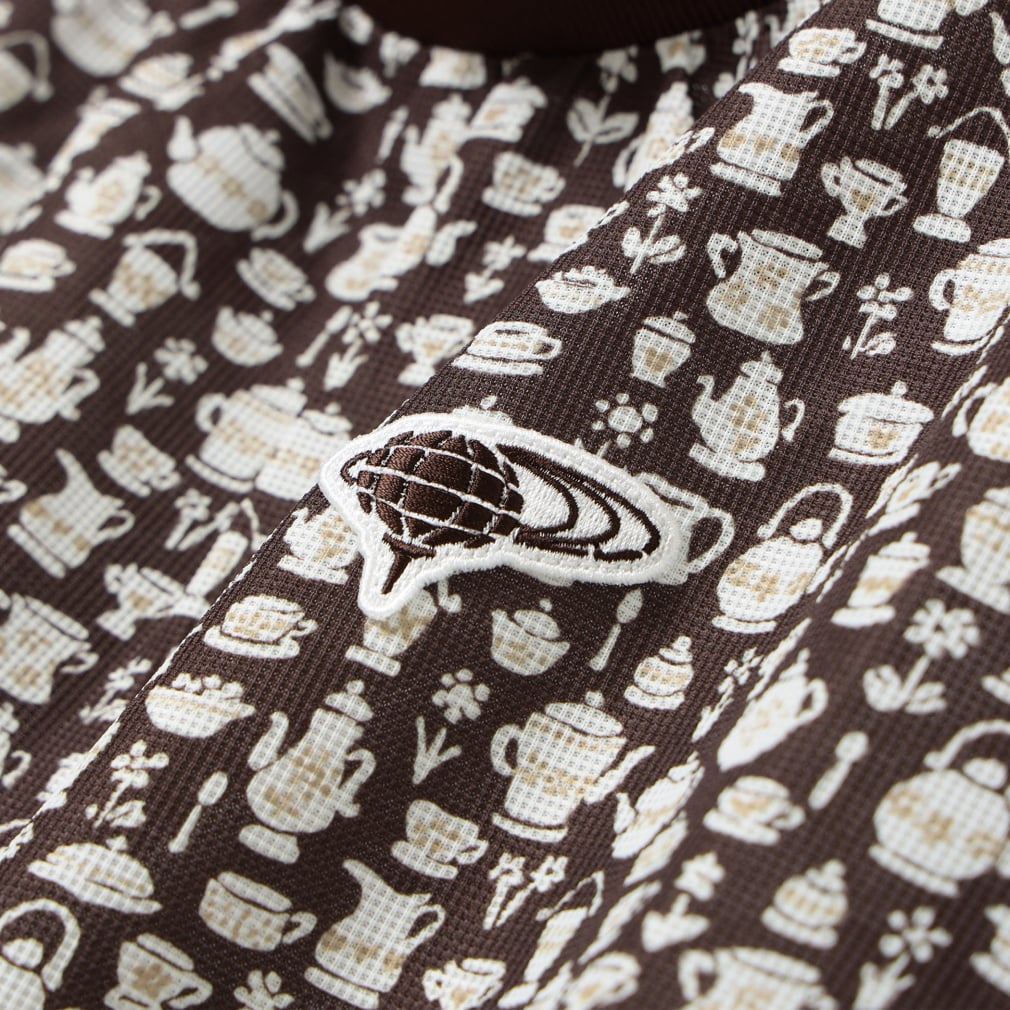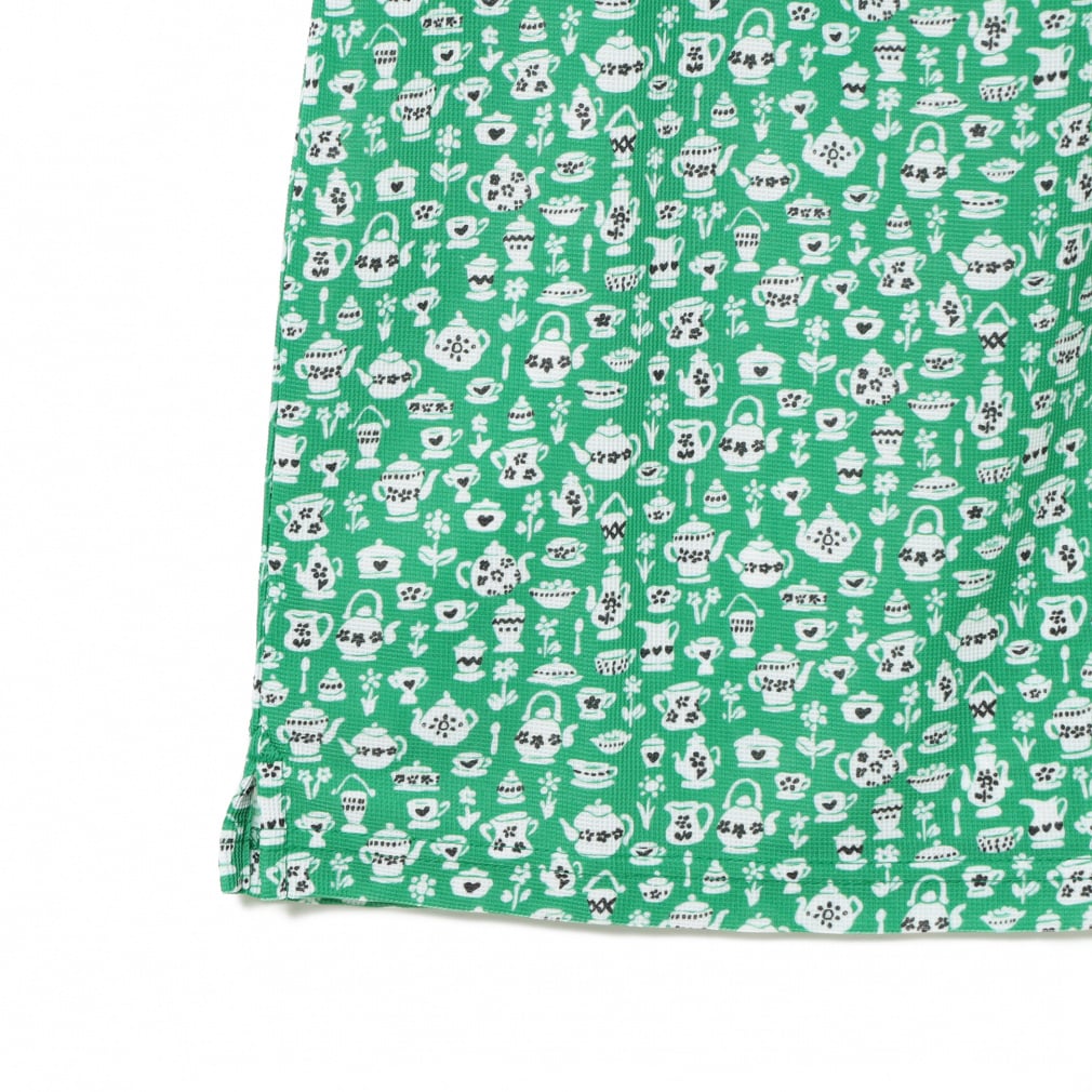 ◇BEAMS GOLFの2025年春夏のテーマ『DESSERT(デザート)』にぴったりのcafe柄プリントのモックネックシャツ。ティーパーティーをイメージしてデザインされたリバティ社のプリントパターン「スージー・エリザベス」をもとに、BEAMS GOLFオリジナルの柄を製作してもらいました。よく見ると手書きでお茶会に必要な食器の全てが描かれています。素材は、吸水速乾、UVカット機能付きの、薄く軽やかなメッシュ調の鹿の子。プリントの色合いも相まって上品でさわやかな印象です。リブ編みの襟と袖口がメリハリをつけ、襟元のギャザーがフェミニンさを添えています。