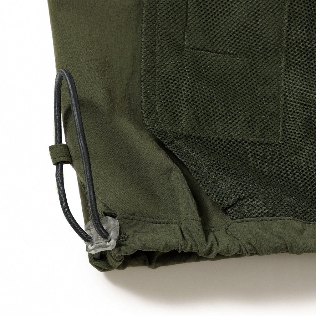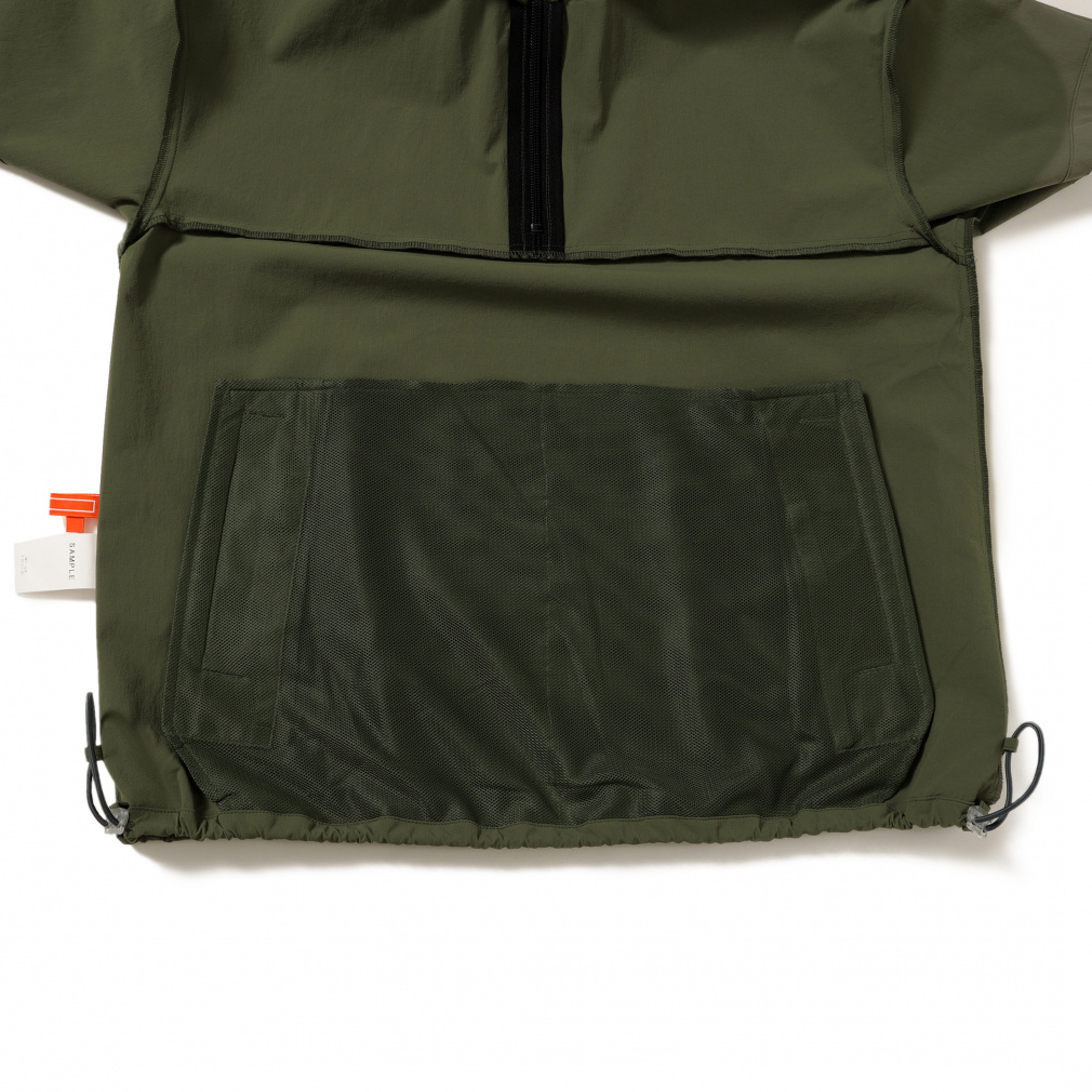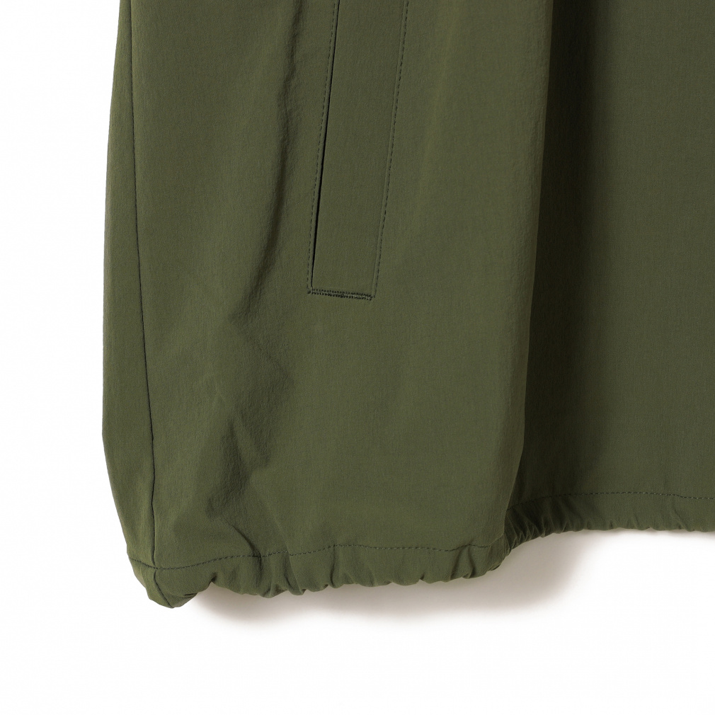 ◇撥水機能と、4WAYストレッチを併せ持つタフタ素材を使用。軽量でドライタッチな素材感なので、温度調節や小雨時の軽いレインウエアとしてもおすすめのアイテムです。全体的にゆったりとしたサイズ感で、裾のドローコードで着丈の調整が可能です。