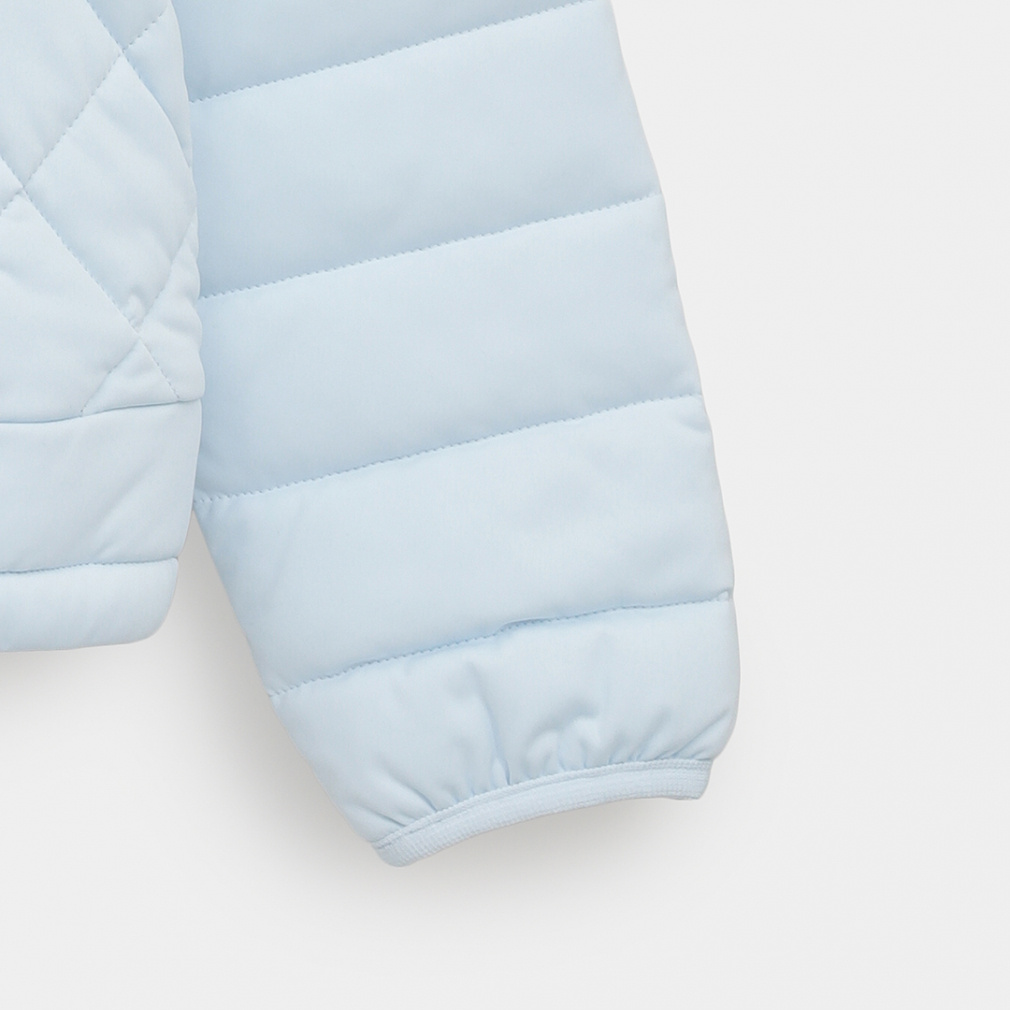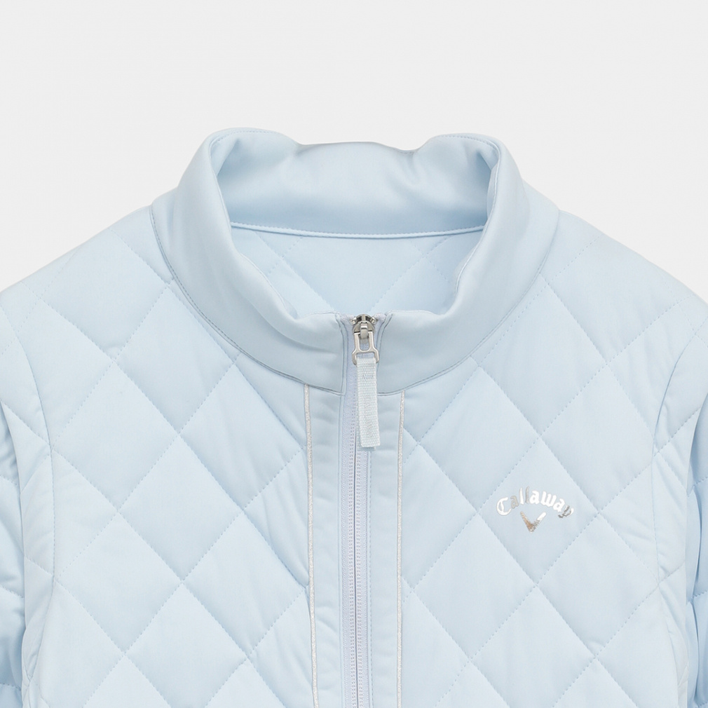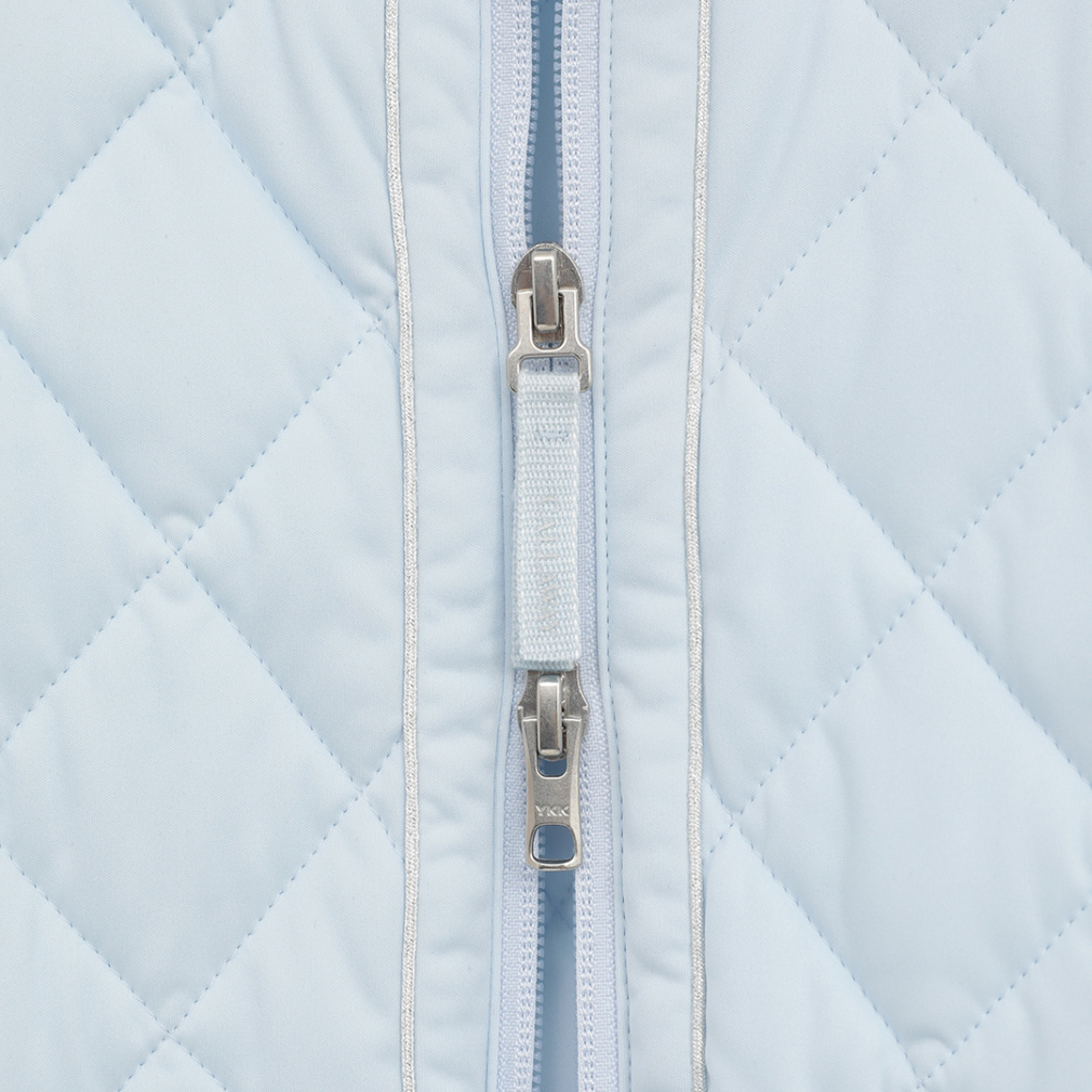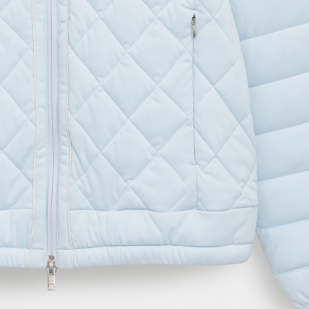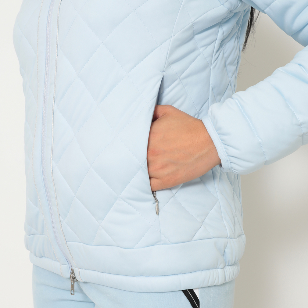 ◇高機能素材 「スターストレッチeco」を使った中綿アウターです。嵩高性の高い中綿を使用しているので保温力が強く、寒い冬でも活躍。寒暖差にも対応しやすい袖デタッチャブルの仕様にしました。フロントのラメパイピングとスライダーのリボンテープ、胸元のシルバープリントロゴが統一感あるデザインポイントです。
