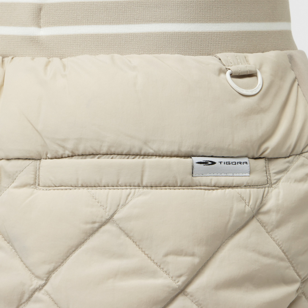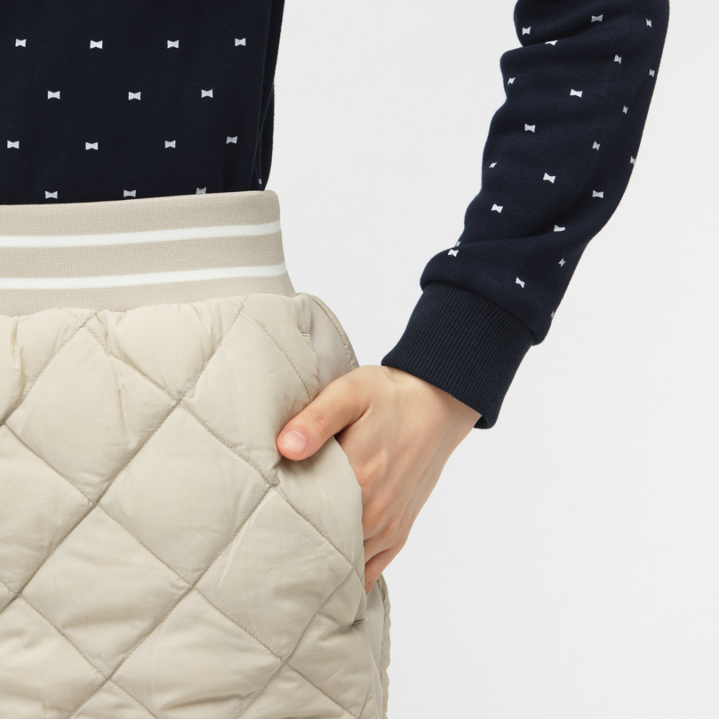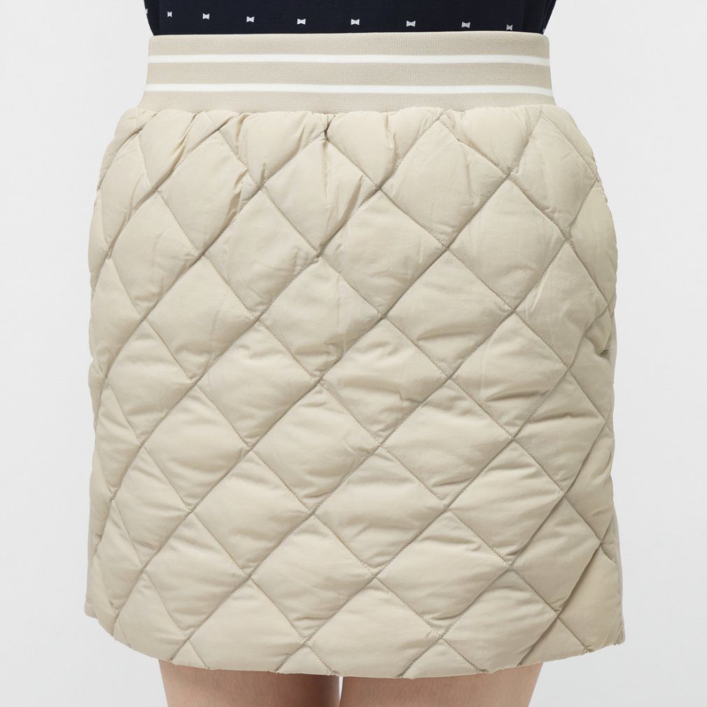 ◇着用しやすく暖かいダウンスカート。ウエスト部分は一周ぐるりとゴム仕様にし、着脱がしやすい仕様です。両脇部分にストレッチ素材を使用し、スイングやしゃがんだ際の生地の突っ張りを軽減する仕様です。700フィルパワーのホワイトダックダウンを使用。優れた嵩高性により、高い保温力を発揮する高品質ダウンです。(一般的に、550フィルパワー以上が良質なダウンと評価されています)撥水・防風機能も備えており、軽い雨天時にも使用可能。風を防いで暖かさを保ちます。