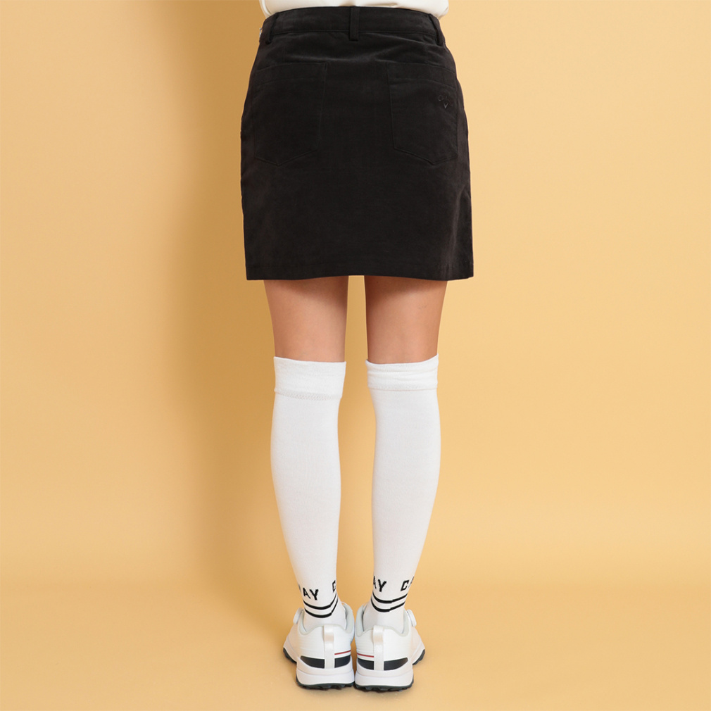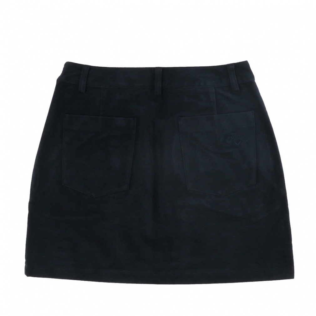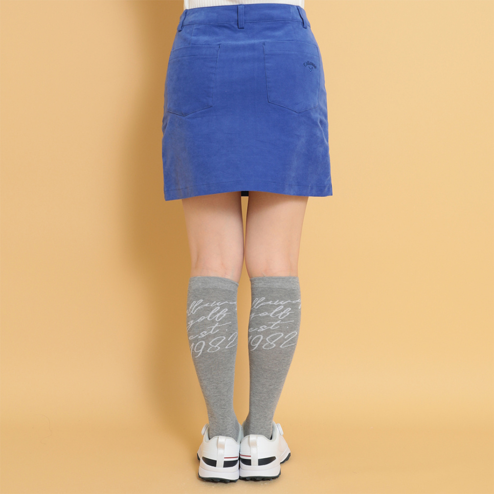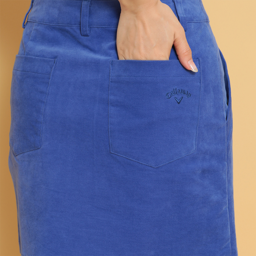 ◇キャロウェイ冬の定番的起毛素材、8WAYストレッチのモールスキン使用のスカート。フロントサイドにボタンをつけ、巻きスカート風にデザイン。左ポケット口にCALLAWAY刺繍を入れ、アクセントにしました。きれいなカラーバリエーションもおすすめポイントです。