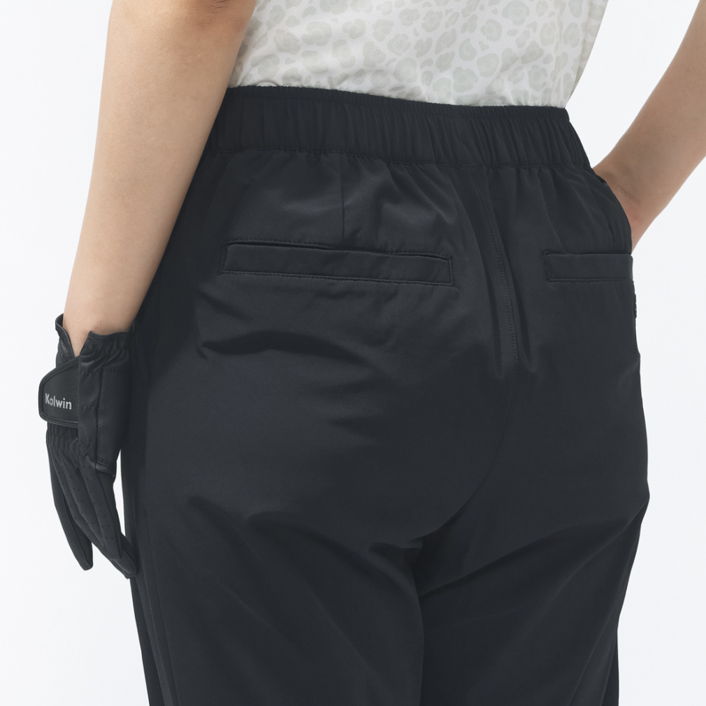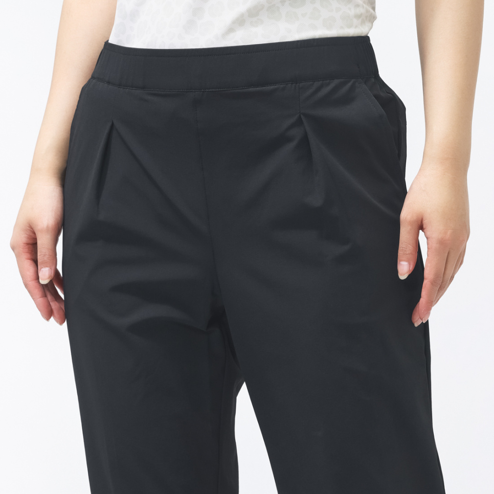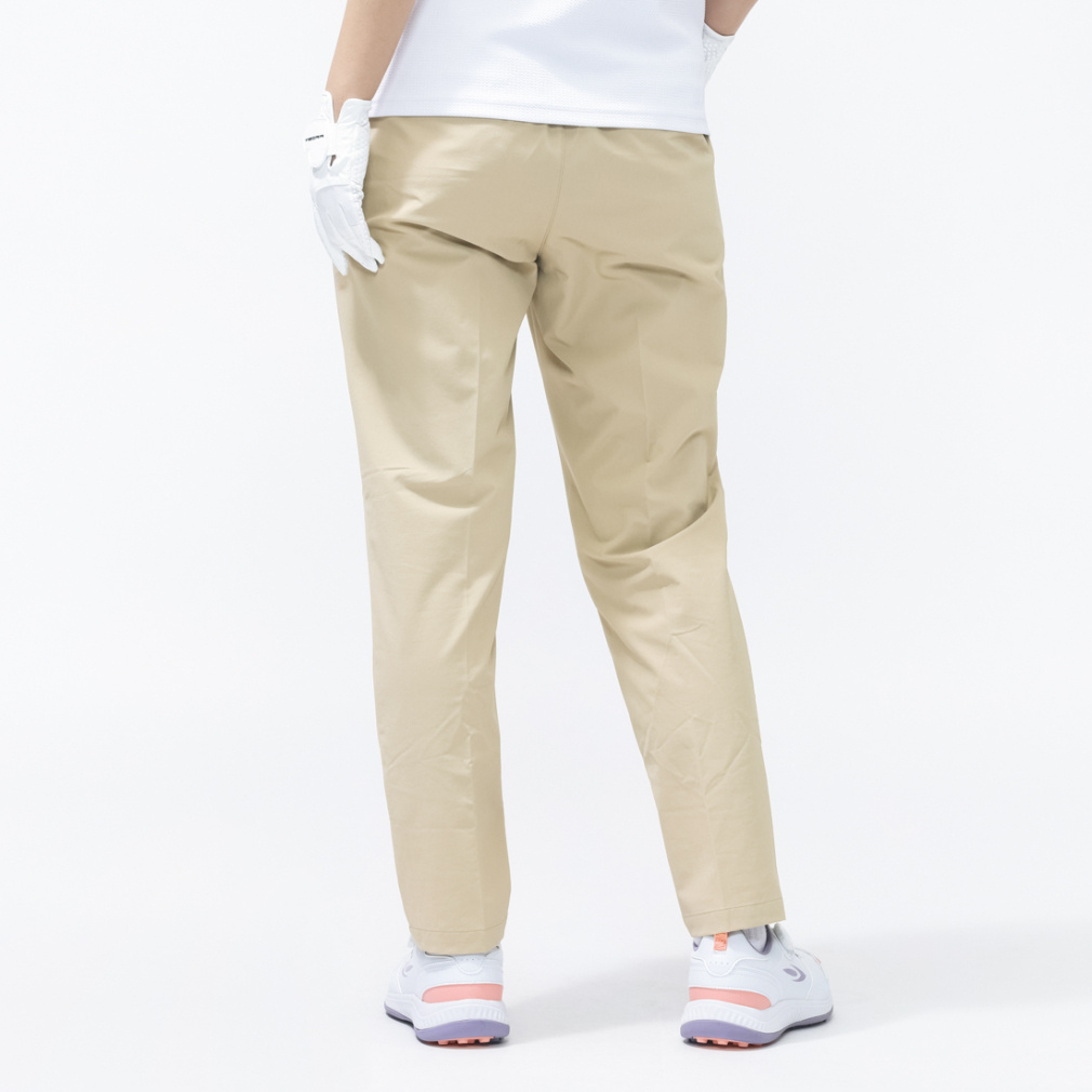 ◇1タック入りのロングパンツ。ウエスト部分は前側はスッキリ、後ろ側はゴム入りでギャザーを入れており伸縮する仕様。更にウエスト紐でフィット感を調節可能。裾にかけて細くなるテーパードシルエット。光沢感を抑えたマットな素材感で、様々なコーディネートに馴染む一着。縦横に伸びが良く、アドレスやスウィング、ボールのピックアップなどゴルフ特有の動きにもストレスを感じにくい4WAYストレッチ素材。