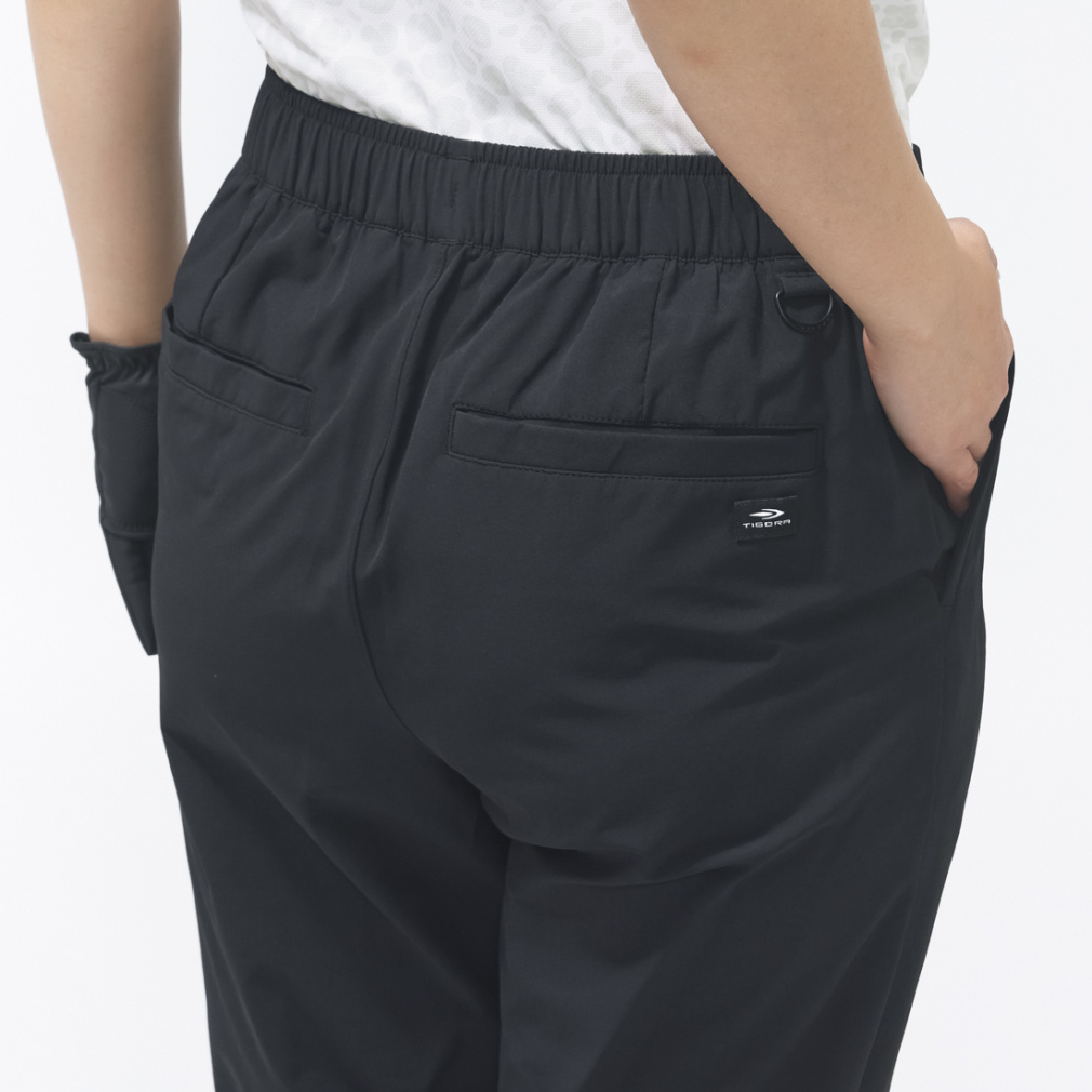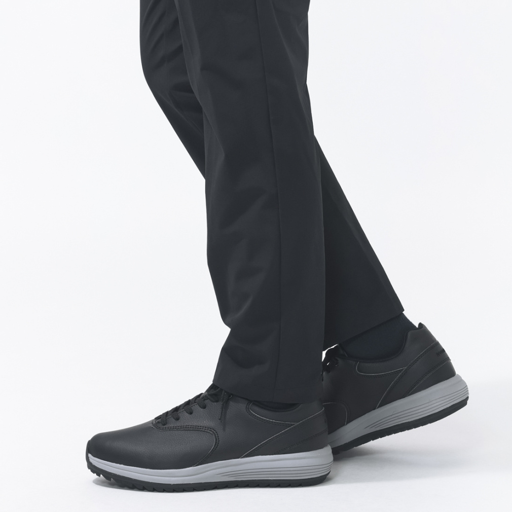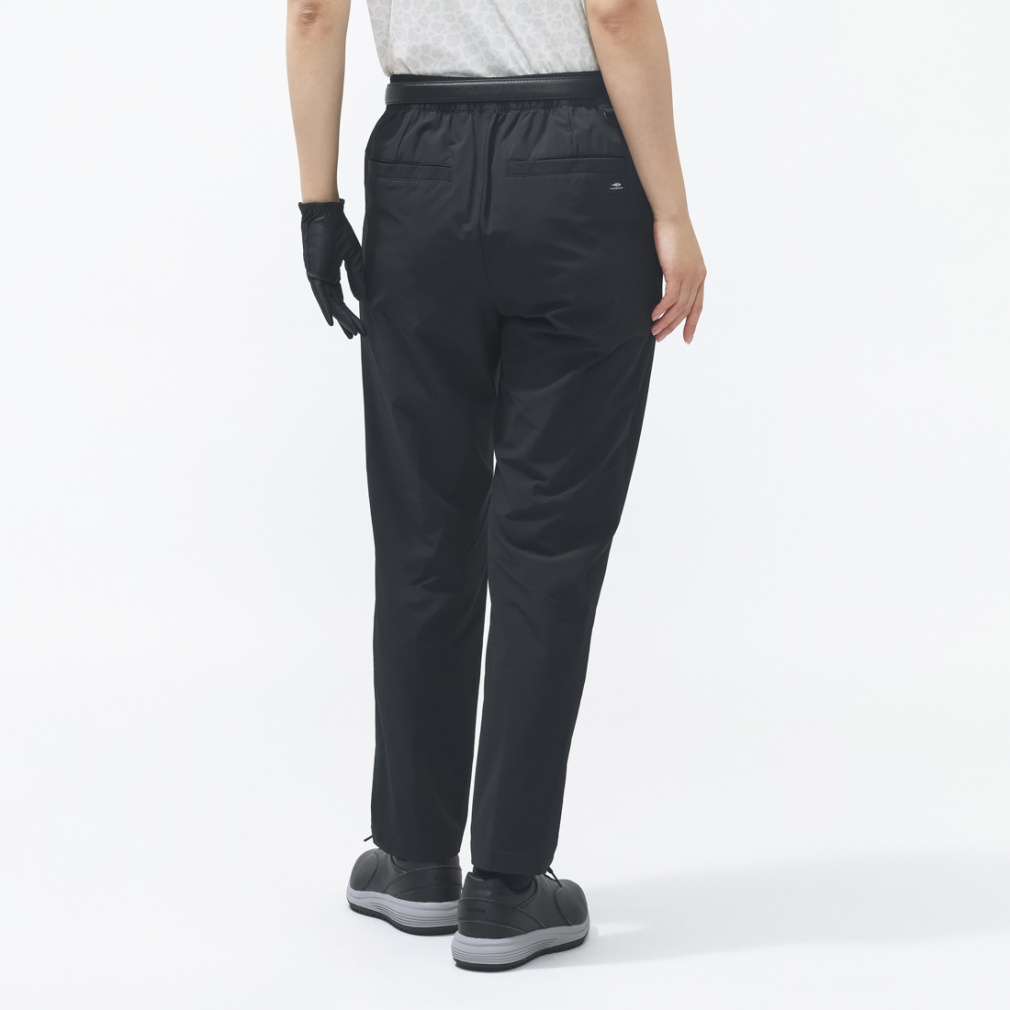 ◇1タック入りのロングパンツ。ウエスト部分は前側はスッキリ、後ろ側はゴム入りでギャザーを入れており伸縮する仕様。更にウエスト紐でフィット感を調節可能。裾にかけて細くなるテーパードシルエット。光沢感を抑えたマットな素材感で、様々なコーディネートに馴染む一着。縦横に伸びが良く、アドレスやスウィング、ボールのピックアップなどゴルフ特有の動きにもストレスを感じにくい4WAYストレッチ素材。