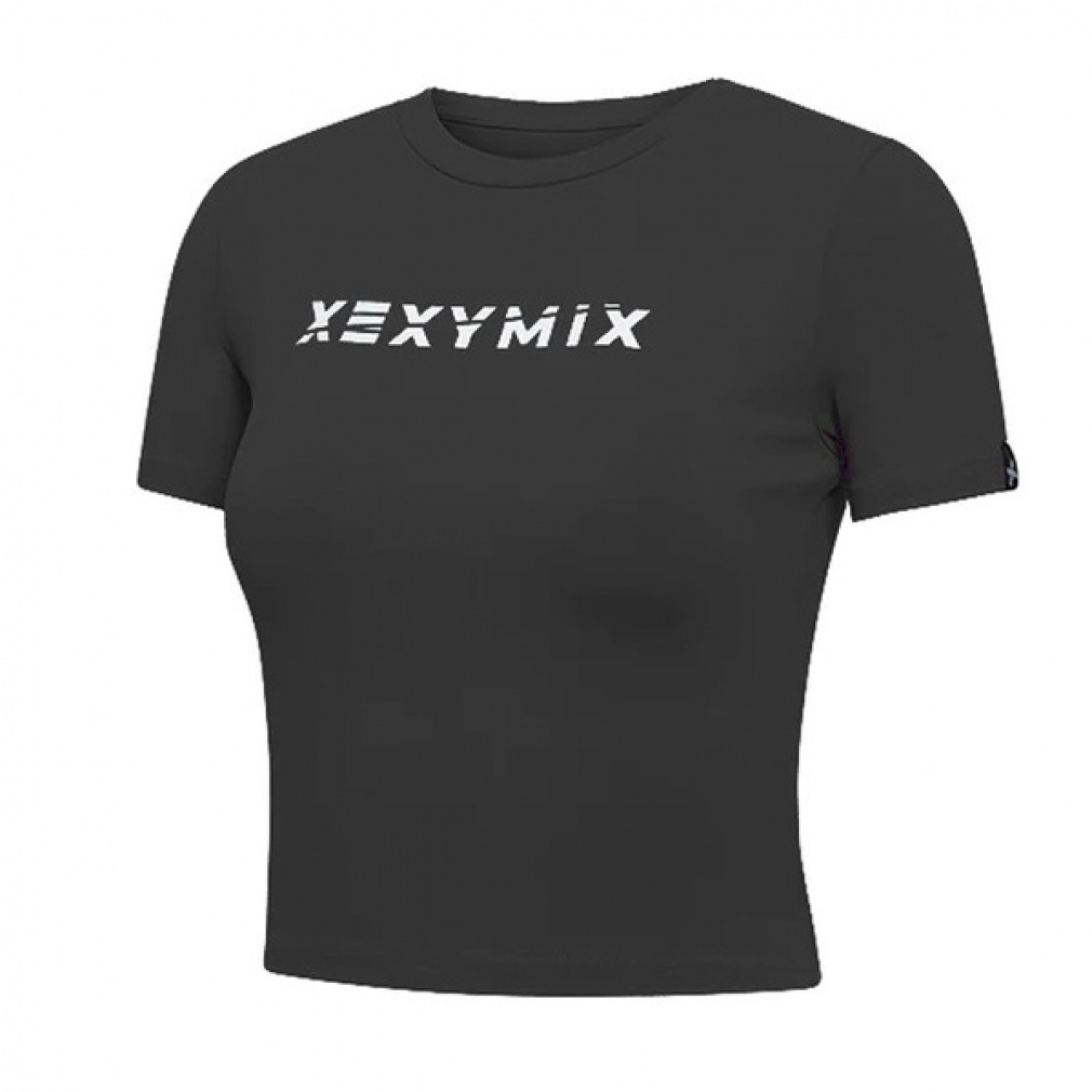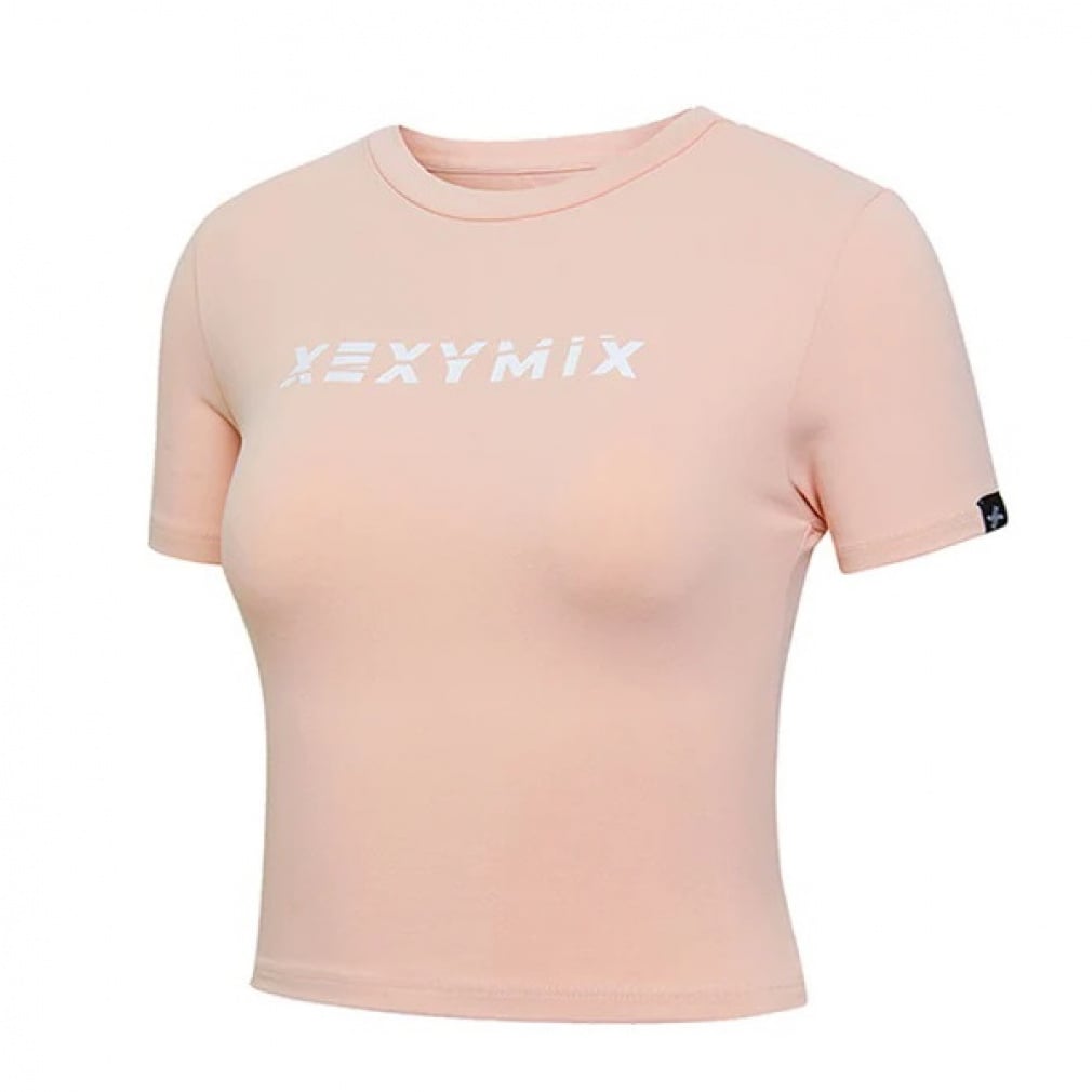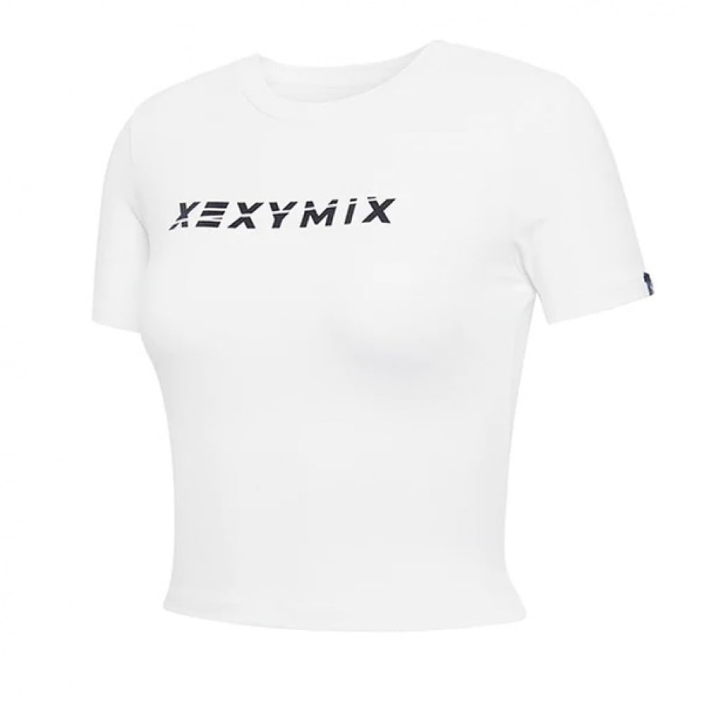 ◇胸元のXEXYMIXテキストロゴがポイントのラウンドネックのショート丈半袖トップス