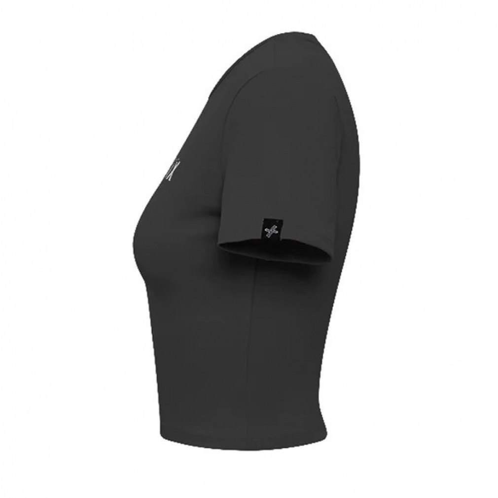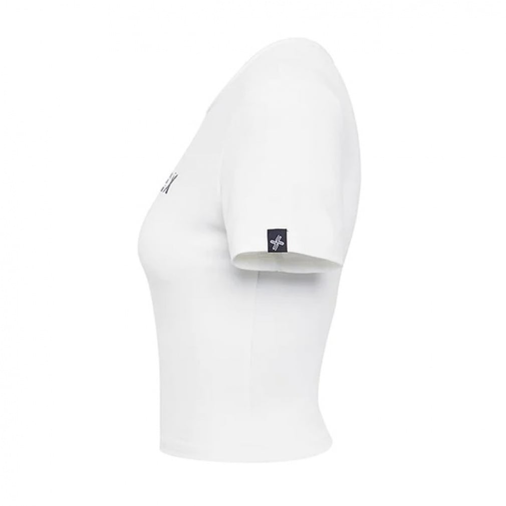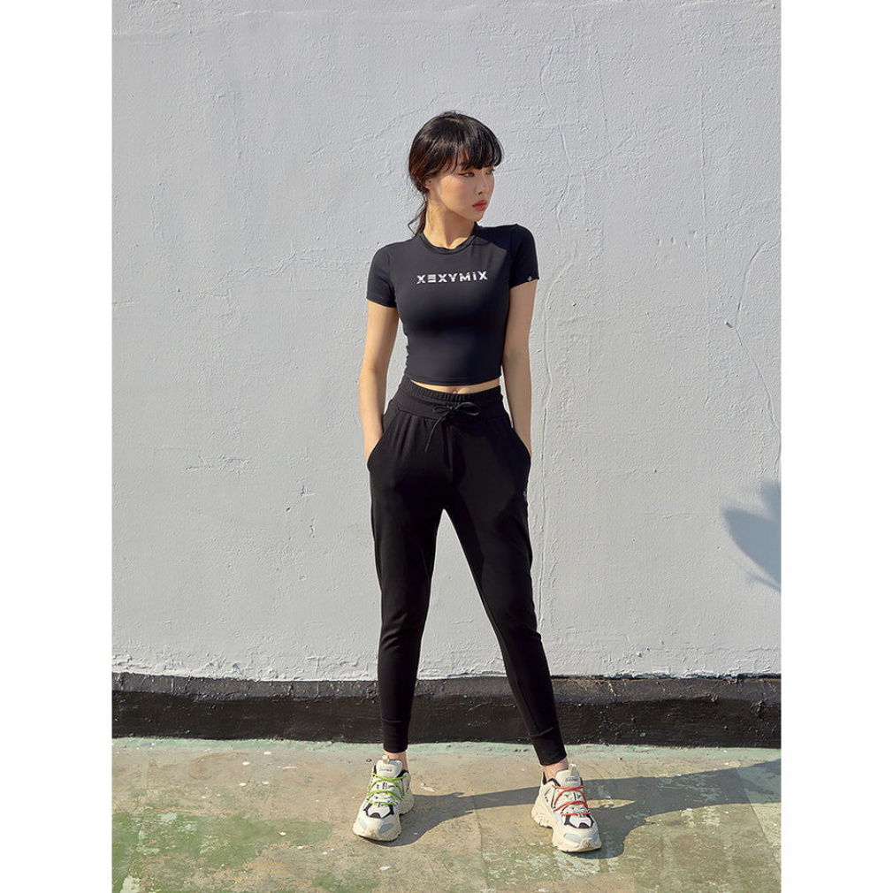◇胸元のXEXYMIXテキストロゴがポイントのラウンドネックのショート丈半袖トップス