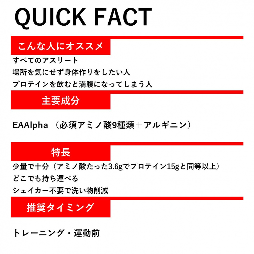 ◇EAA PRO(イーエーエープロ)は、身体作りに必要な必須アミノ酸9種類とアルギニンの組合せである米国特許取得配合のEAAlpha(イーエーエーアルファ)を原料に用いたEAAサプリメント。アミノ酸たった3.6gでホエイプロテインや一般的なEAAと同等かそれ以上に身体作りをサポートする。