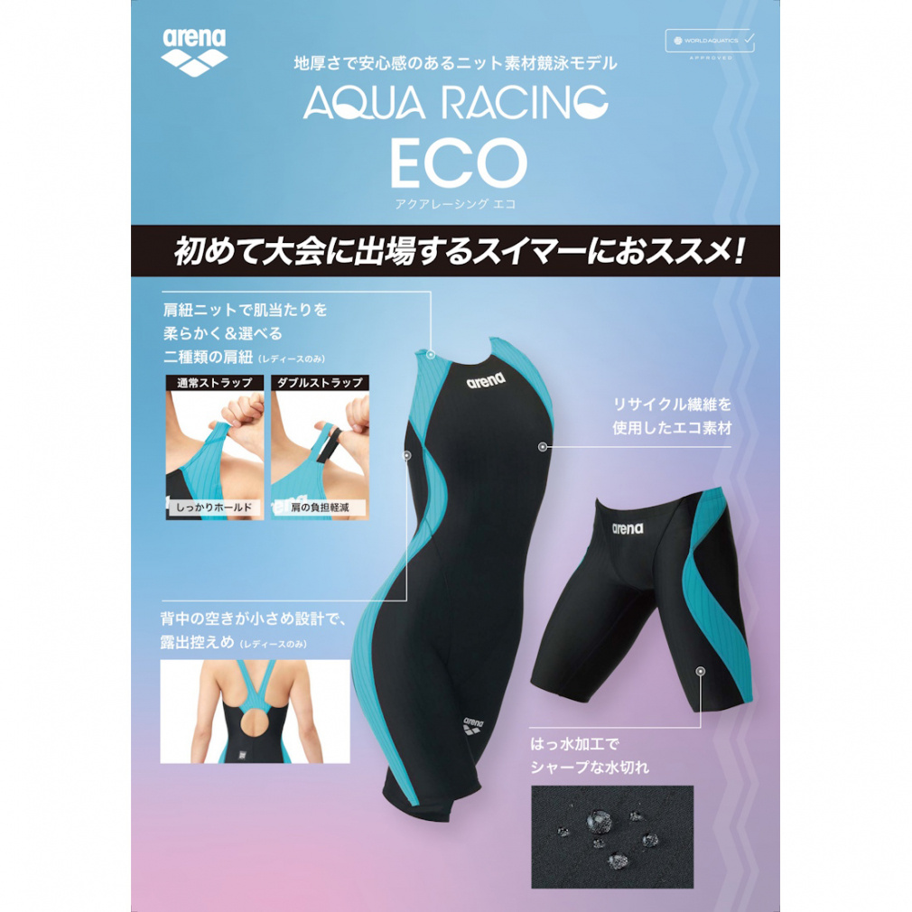 ◇公式大会に出場するために必要なWORLD AQUATICS(世界水泳連盟)承認モデル。環境に配慮したリサイクルポリエステルを使用したニット素材ECO AQUASTRIPEを採用。伸びのあるフィット感と安心感のある地厚な生地で、はっ水加工でシャープな水切れが特徴。初めてレースに出場するスイマーにおすすめ。