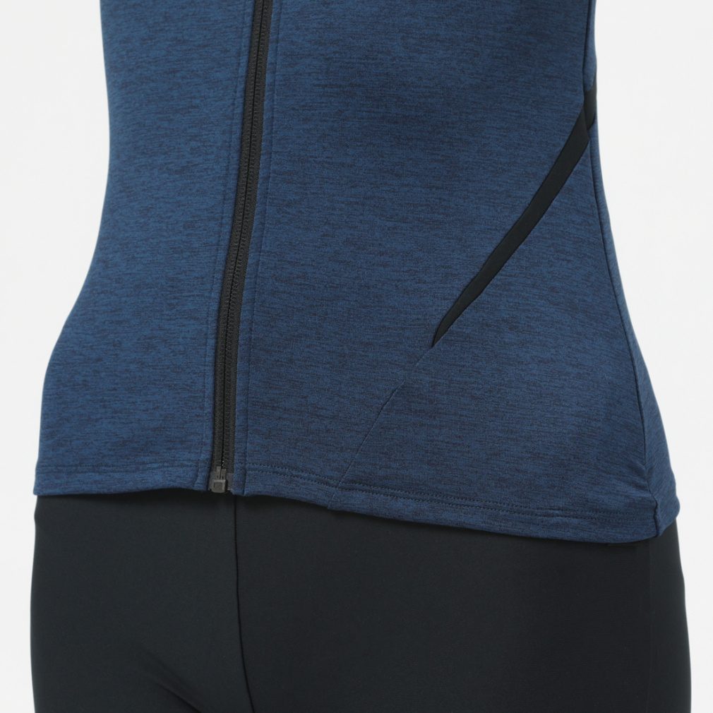 ファスナーを裏使いしてスッキリとした印象に仕上げ、背面にメッシュ生地を使用し、ファッション性とともに重くなりがちなジップタイプのセパレーツに軽さを与えています。