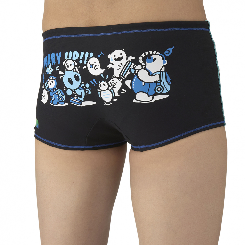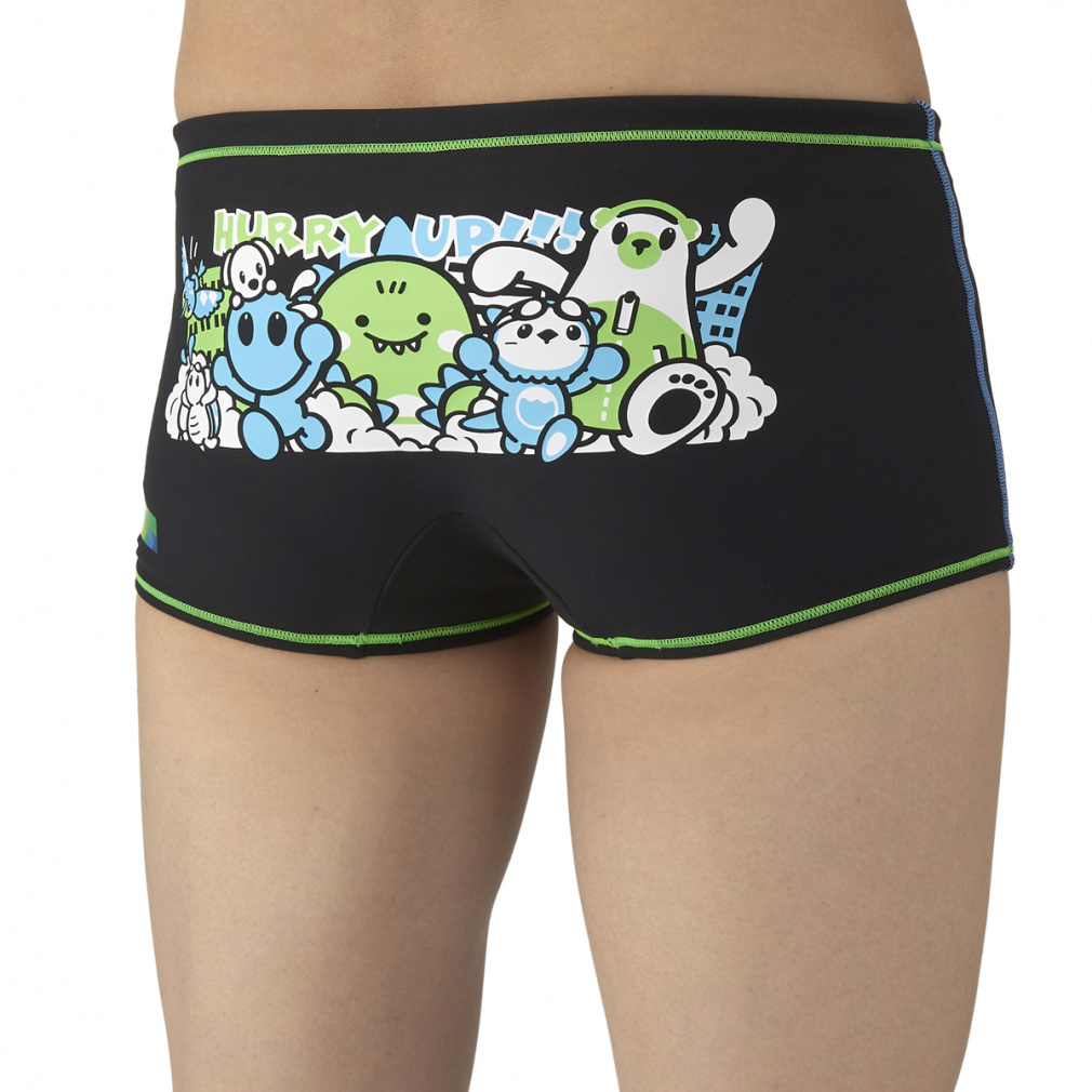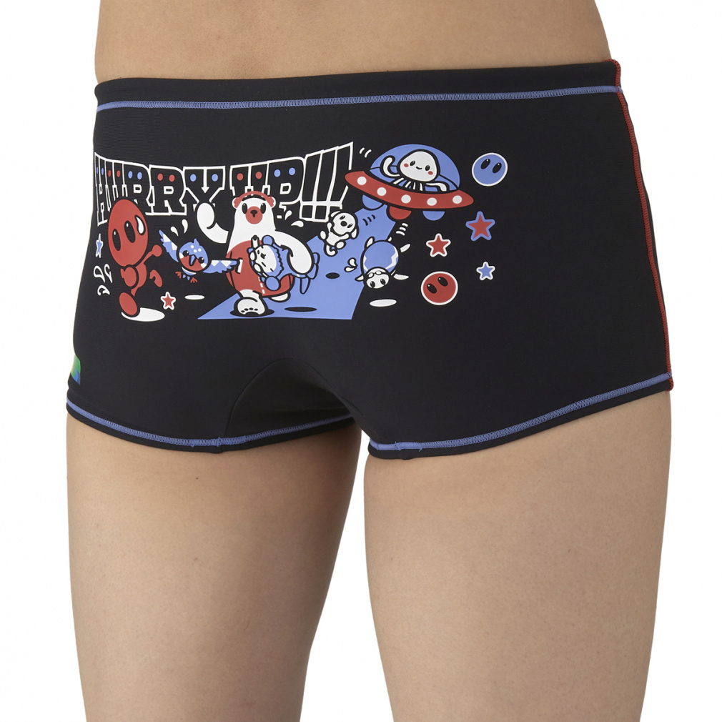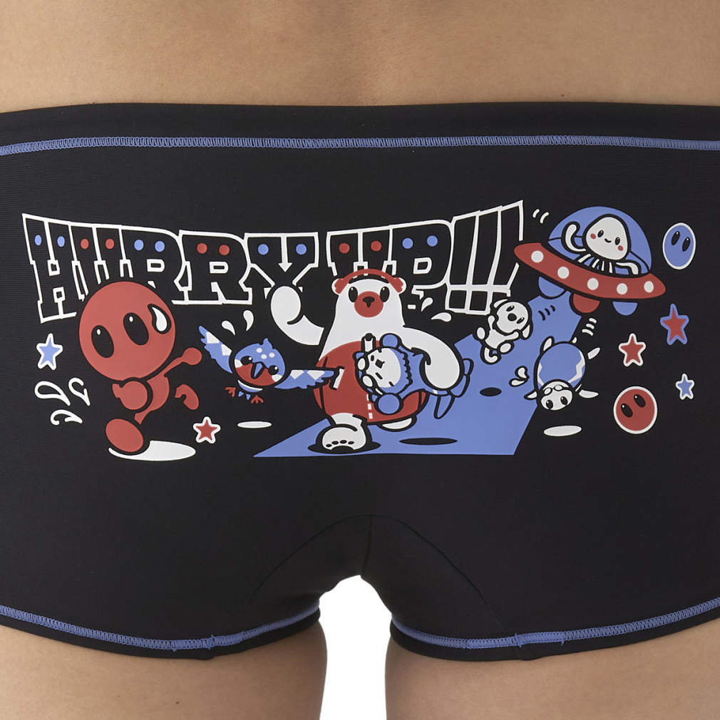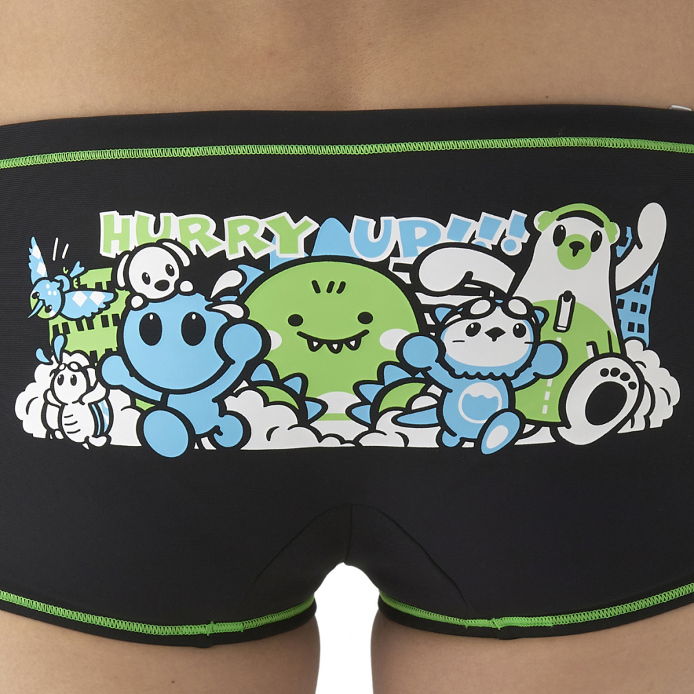 ◇トレーニングカテゴリー「TOUGHSUITシリーズ」。ジュニア用サイズ。大会に向けて練習を重ねる頻度が高いスイマーにオススメの練習用水着。環境に配慮したリサイクルポリエステル素材「タフスキンE」を使用し塩素に強く長持ち。アリーナくんと仲間たちがプリントされた人気のHURRY UPデザイン。テーマの宇宙と地球をテーマにした冒険物語。アリーナくんたちと地球外生命体(怪獣、宇宙人、お化け)が出会い、友達になる過程をプリントに表現。地球を守る戦隊ヒーロー風のスタイルを取り入れることで、アリーナくんたちのチームとしての一体感を演出。4カラー別々のデザインとストーリーそれぞれのプリントに合わせたステッチカラーを採用。前身頃に黒の裏地付き。ショートレッグタイプ。