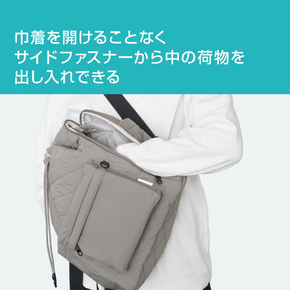 ◇巾着を閉めたままでも、大きくひらくサイドファスナーから中の物が取り出せて便利!