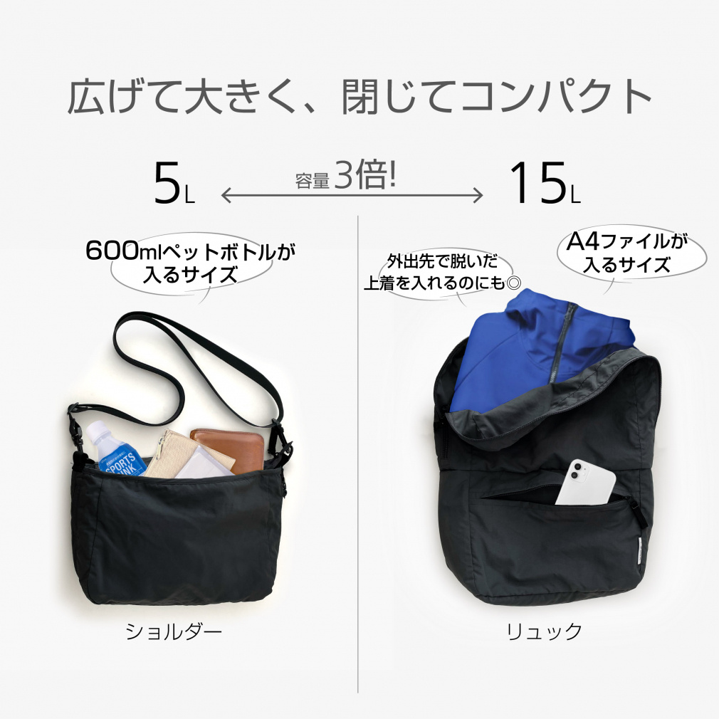◇容量3倍!ショルダーバッグ5L、デイパック15L
