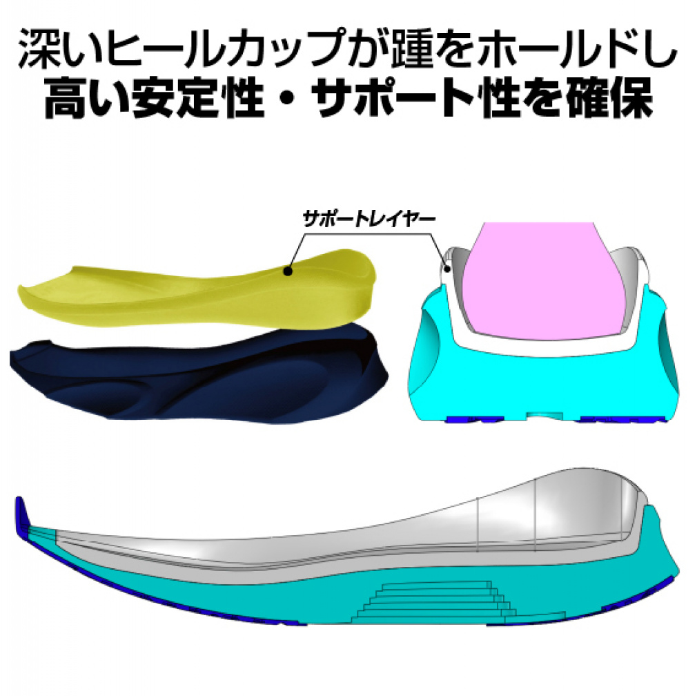 ◇サポートレイヤー:バケットシート形状の深いヒールカップで踵をホールドし、着地時のグラつきを防ぎ高い安定性、サポート性を確保