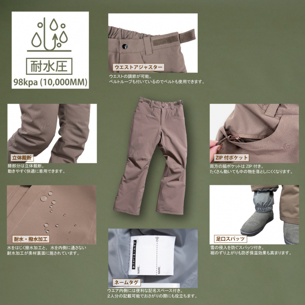 ◇街に溶け込むアーバンデザイン&スキー場でも着用出来る機能性の2つ兼ね備えたキッズウエア。撥水加工素材の定番無地パンツ。耐水圧10000mm・ウェスト調整・新JIS基準対応