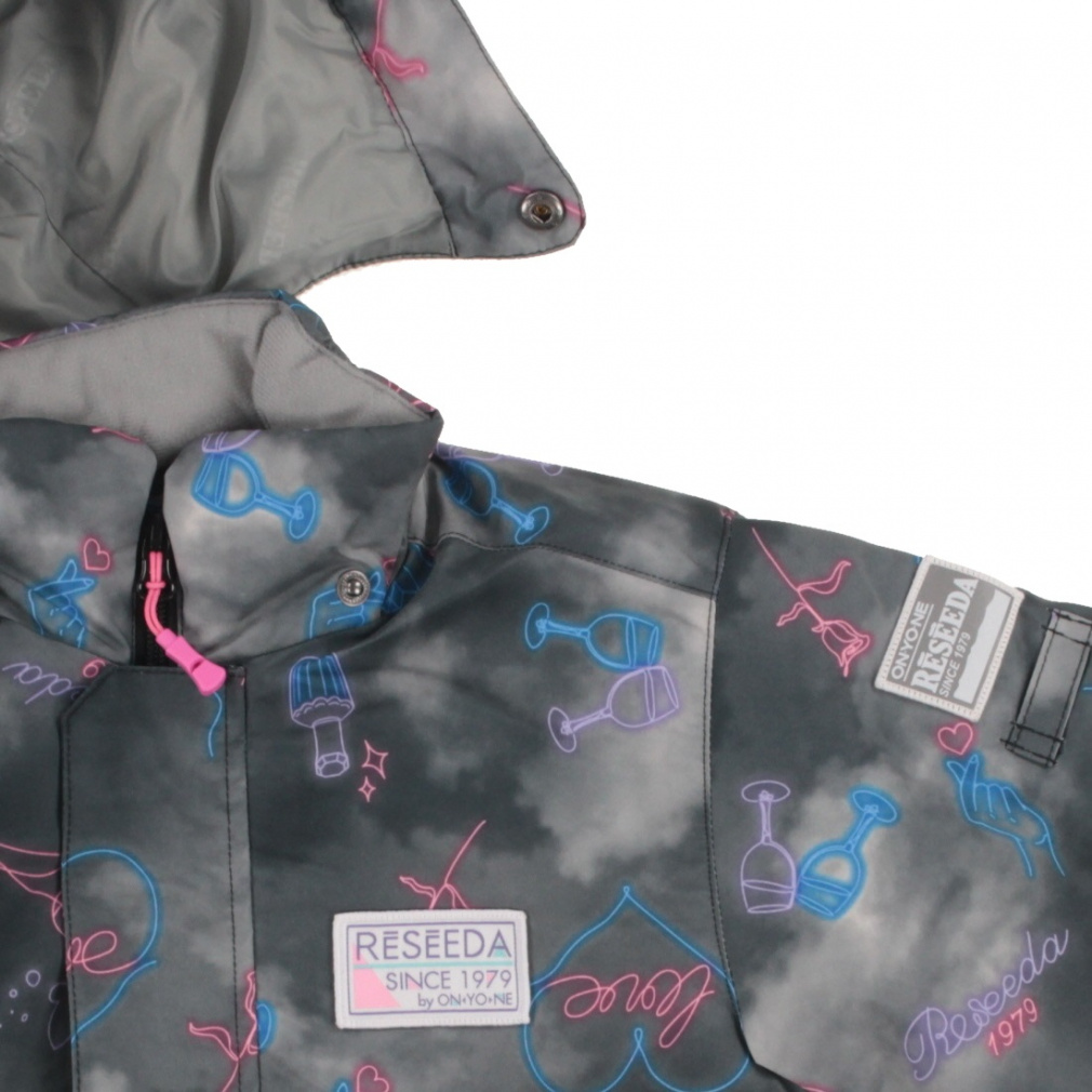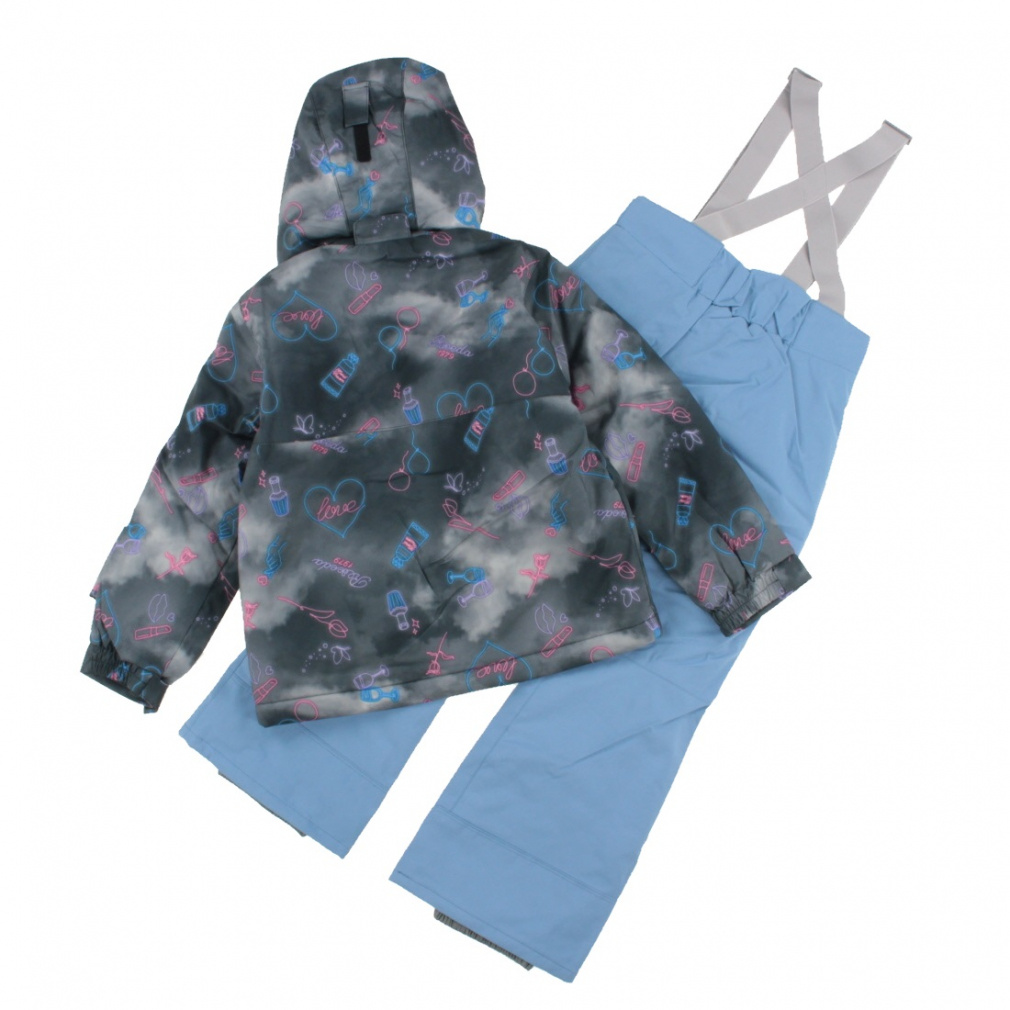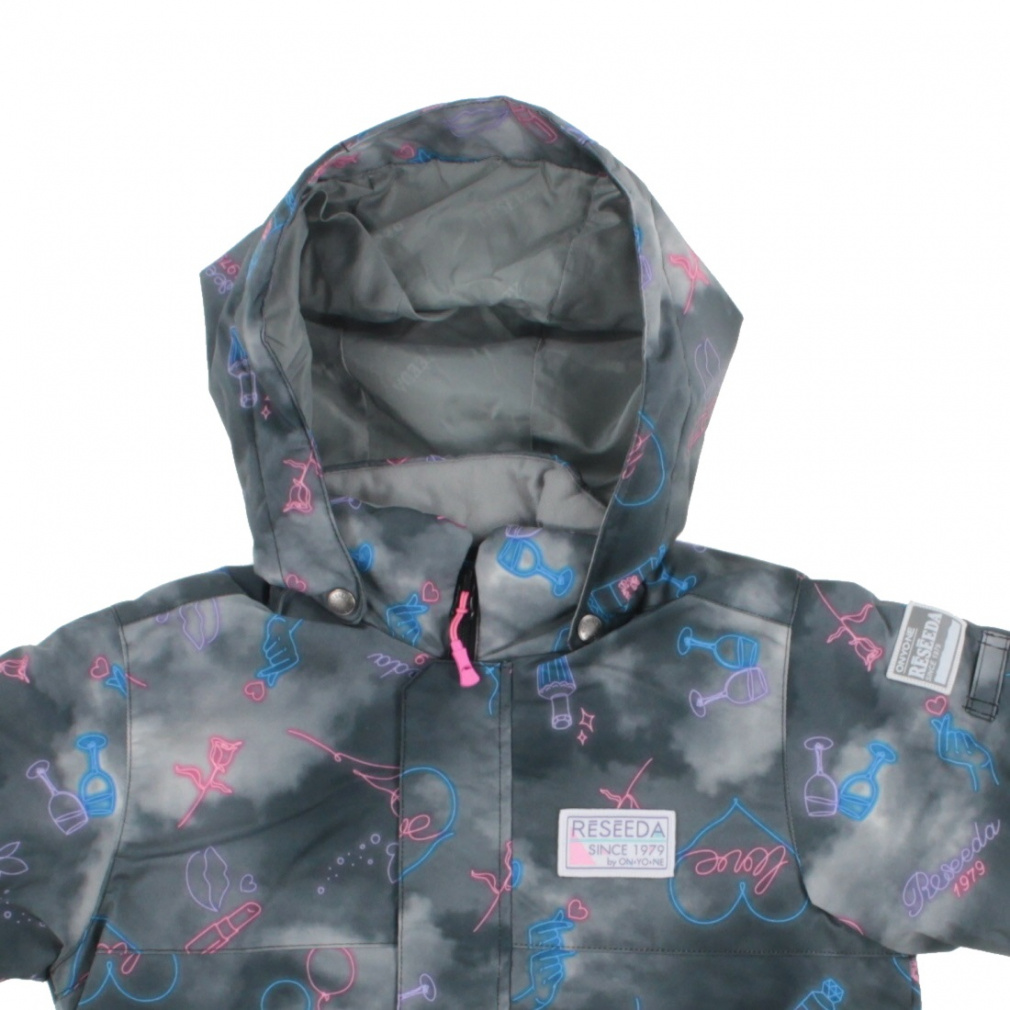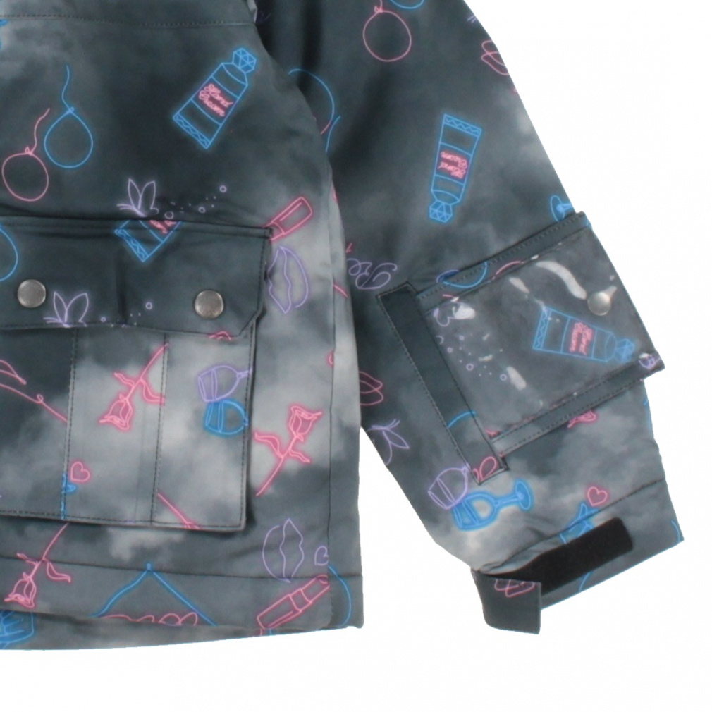 ◇大人っぽいモチーフに同系色のネオンカラーがとってもおしゃれなジュニアスキースーツ。耐水圧10000mm・2way strech・フード着脱可・着丈&袖丈&裾幅&股下&ウェスト調整・襟裏抗菌加工・パスケース付・新JIS基準対応