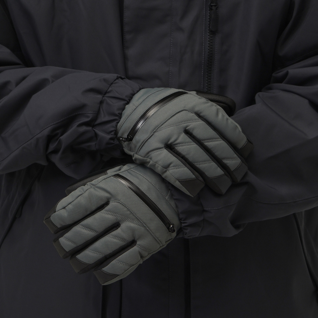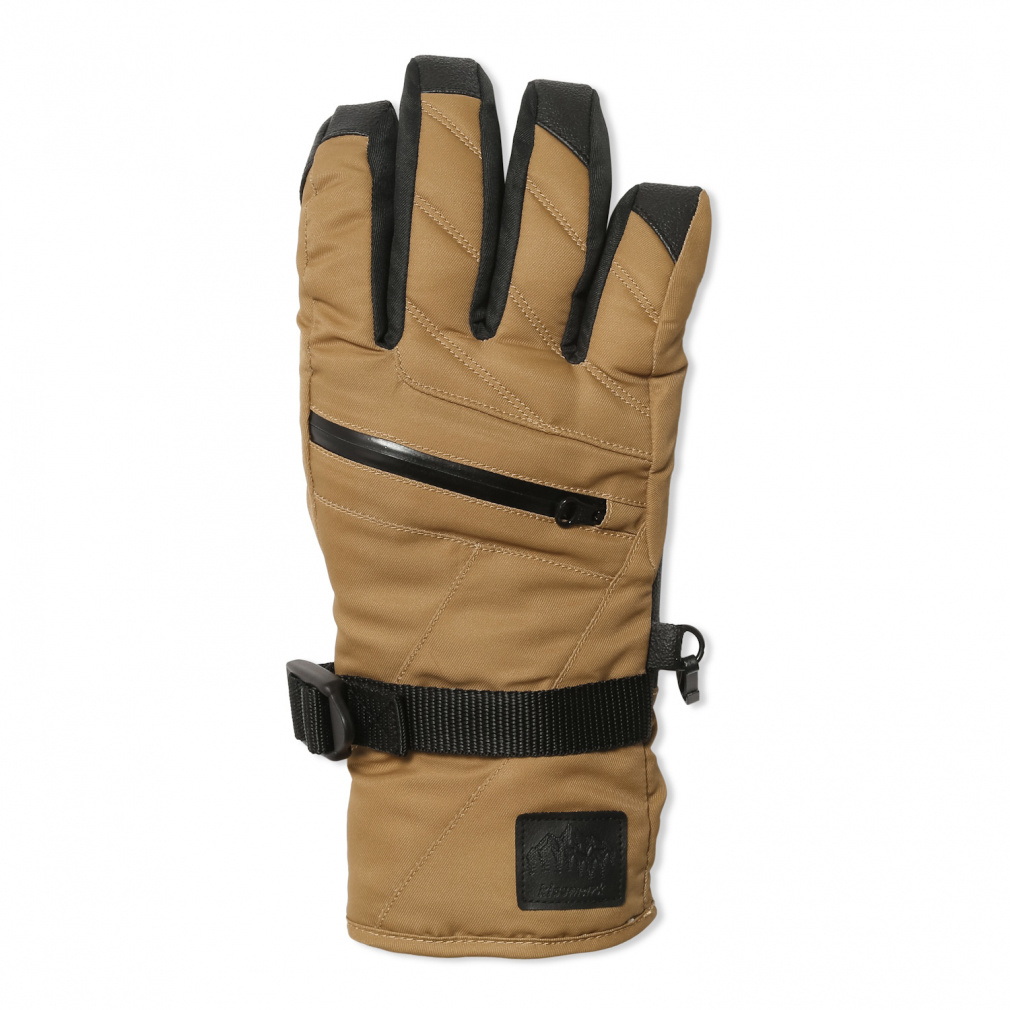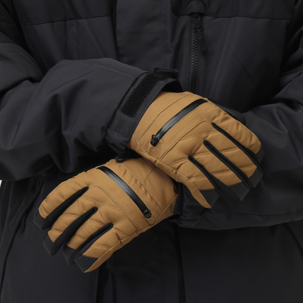 ◇中綿入りスキー/スノーボードグローブ。透湿性/防水性に優れたフィルムインサートDRI VENT(ドライベント)を使用。 外からの雨/風をシャットアウト、防水性に優れた全天候型グローブです。裏地素材にiHEAT(吸湿発熱)を使用。身体などから発せられる水分を吸収して、熱を生み出します。手首部分はベルトで調節、裾部分は面ファスナーで締め付け調節が可能。冷気の侵入も防ぎます。着脱時に落下を防ぐリーシュコード付き。左右がバラバラにならないためのナスカン付き。甲側のファスナー部には小物が収納できます。