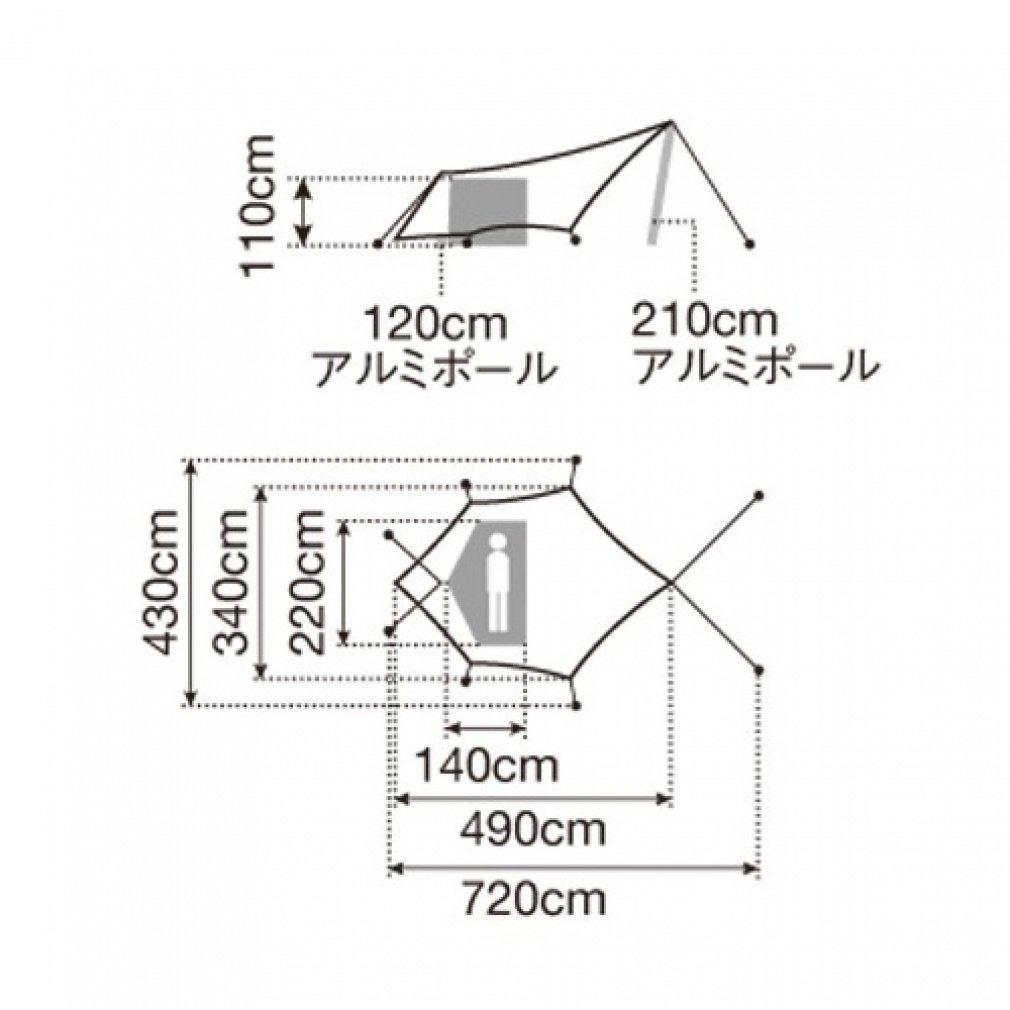 キッチン・リビングとして必要十分な前室スペースと、既存のソロテントに劣らない屋内空間。長さの違う2本のポールを前後に配置することにより、天井の高い、ロースタイルにぴったりの前室空間を創出しました。