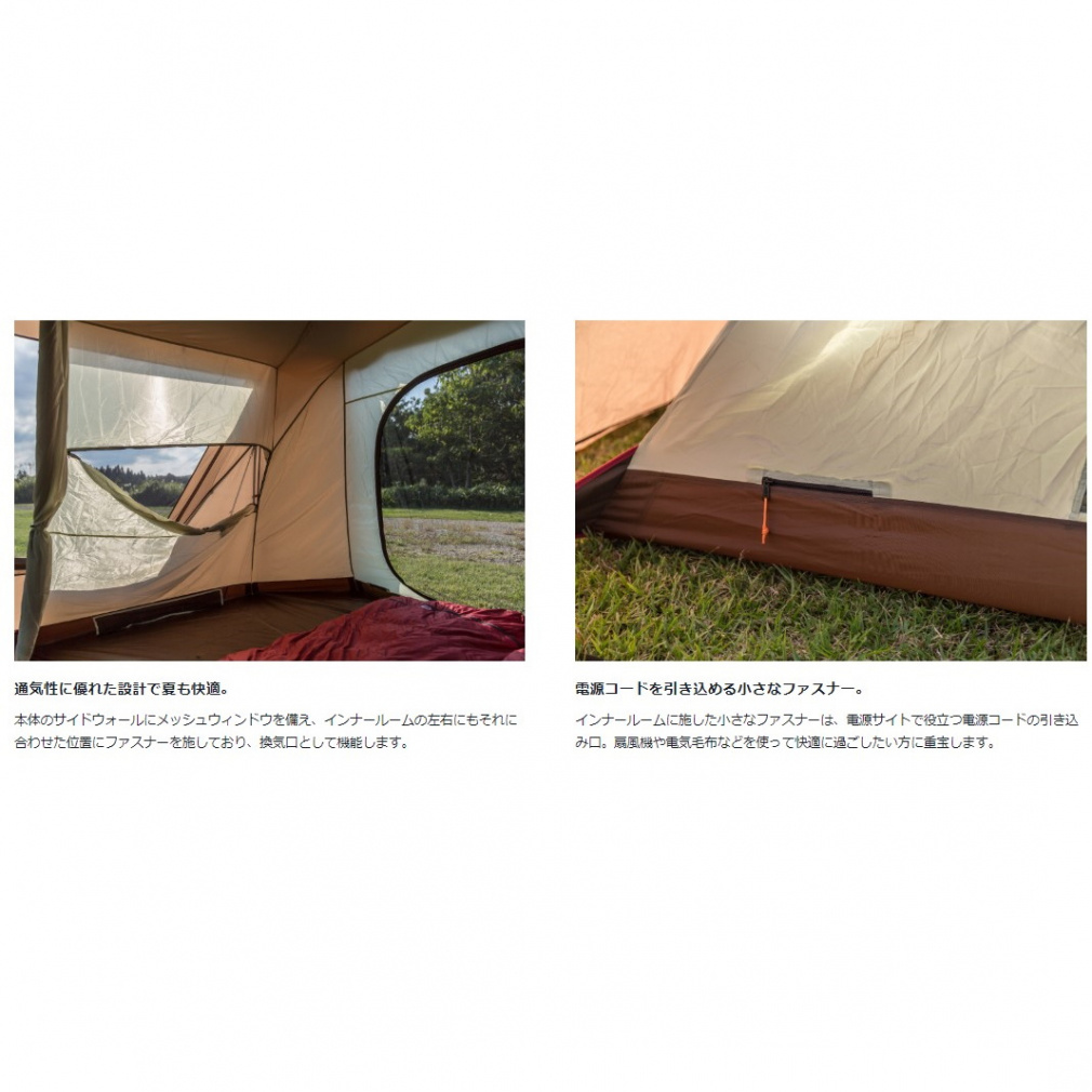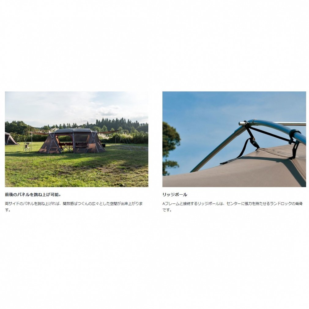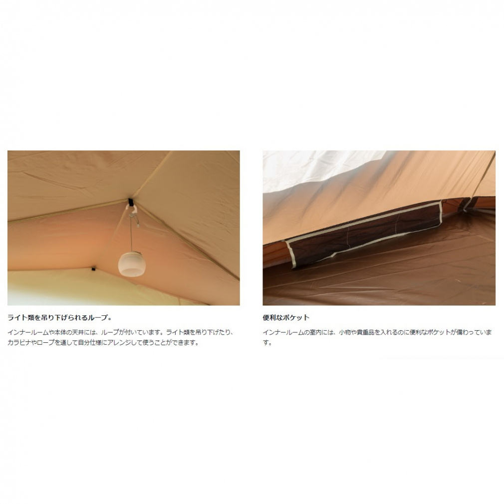■材質:本体/150Dポリエステルオックス、遮光ピグメントPUコーティング耐水圧3000mmミニマム(ルーフ部)、UVカット加工、テフロン撥水加工、150Dポリエステルオックス、PUコーティング耐水圧1800mmミニマム(ウォール部)、UVカット加工、テフロン撥水加工、フレーム/A6061(φ19mm)、インナールーム/68Dポリエステルタフタ(ウォール)、210Dポリエステルオックス、PUコーティング耐水圧1800mmミニマム(ボトム)
