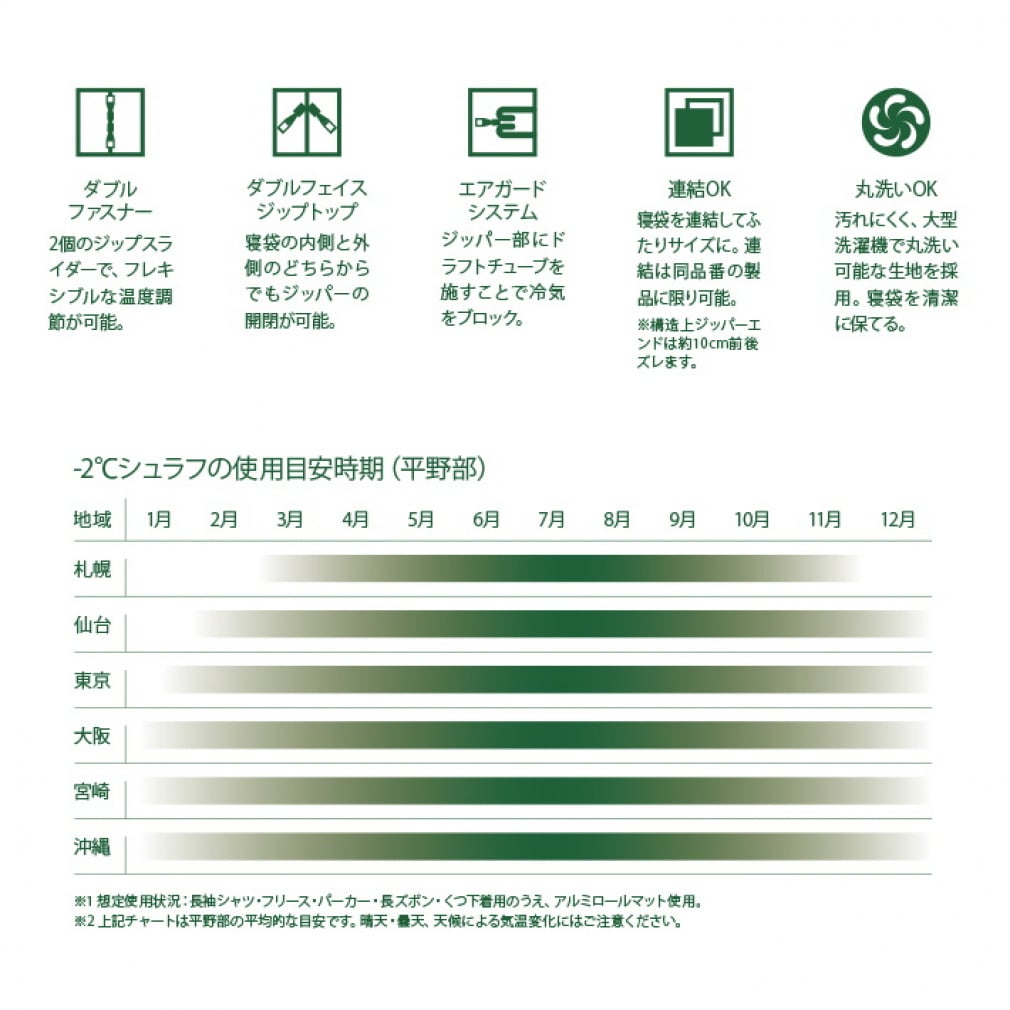 ◇フランネルを採用したあったかなこの封筒型シュラフは、丸洗い対応でお手入れ簡単。落ち着いたカラーリングで、表地、肌面全面にやわらかいフランネル、中綿には軽量&あたたかなダイナチューブファイバーを使用。同一シュラフで連結してWサイズにすれば親子で添い寝もできる。