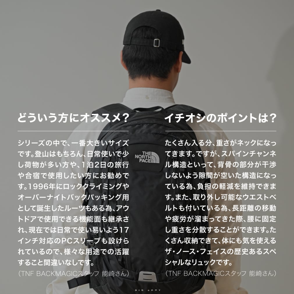 ◇THE NORTH FACE定番人気商品のクラシカルなデザインを継承し、素材強度と機能面を充実させた、アウトドアでも日常でも使いやすい多機能なデイパック(リュック)です。背骨のラインに合わせてクリアランスを保つスパインチャンネル構造で背骨への負担を軽減しつつ、エアメッシュとPEシートの立体構造により高い通気性を確保。ショルダーハーネスはフレックスベントテクノロジーを採用し、テクニカルパックで培った技術で仕上げています。メインコンパートメントは、大きく開閉するパネルローディングタイプ。17インチまでのノート型PC専用スリーブとハイドレーション用のスリーブポケット付き。メイン生地と補強生地の両方にリサイクル素材を採用し、環境保護へも配慮しています。たっぷり入る33リッター容量の中型サイズです。