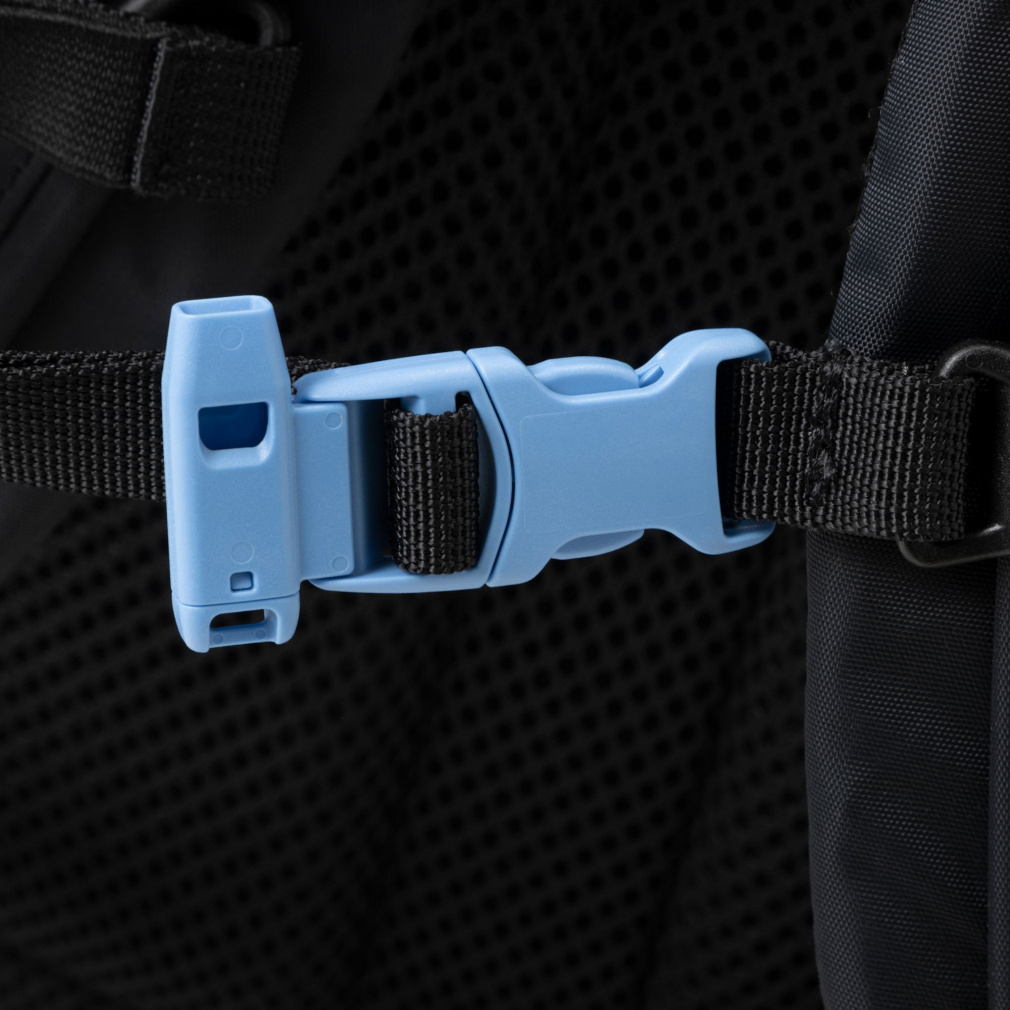 ◇トレッキングからデイリーユースまで幅広く活用できる、22リッター容量のキッズ用中型デイパック(リュック)です。メイン生地にはリサイクル素材を採用し、環境保護へも配慮しています。メインコンパートメントとサブコンパートメントで構成し、フロント右側からメイン内部へのアクセスが可能。内部には、タブレットなどの電子機器を収納する専用スリーブを設けています。サイドにはボトルなどが入れられるメッシュポケットを配備。肩にフィットするショルダーハーネスには、一定の荷重で自動開放する安全性を考慮したホイッスル付きチェストストラップを採用しています。収納可能なウィング付きのウエストベルトを装備。本体内部にネームホルダーを設けています。