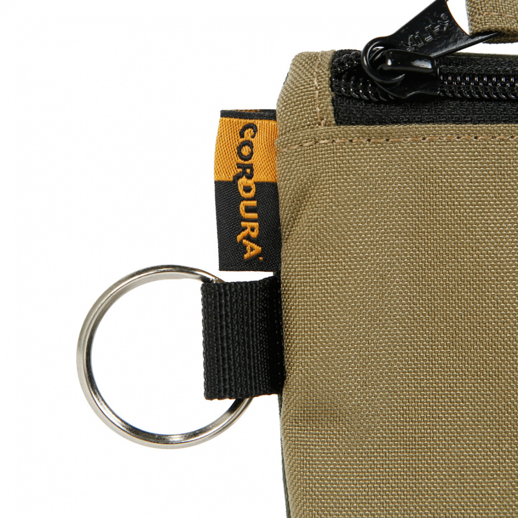 ◇左右にジッパーが付いており、それぞれが別のポケットになっています。片方には2つ分けのスリーブが付いていますので、ここに免許証や定期券、そしてお金を入れて、もう1つのポケットに携帯電話を入れておけば、これだけで遊びに行くことができます。また片面にはスリーブポケットがあり、チケットやレシート、携帯電話などを一時的に入れておくのに重宝します。大きなリングはベルトループやネックストラップと組み合わせることによってショルダーポーチとしても使用出来ます。生地の色は表裏で違う色のコンビネーションになっているのでコーディネートのアクセントに。